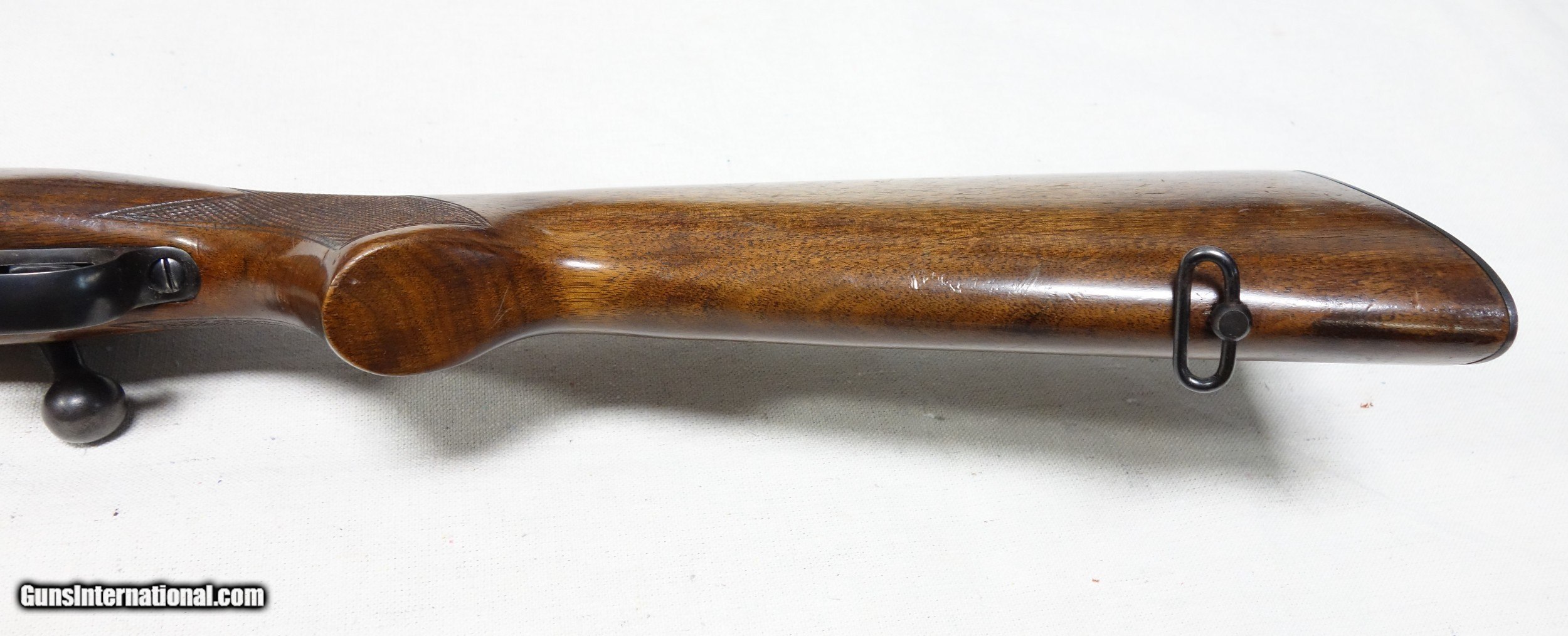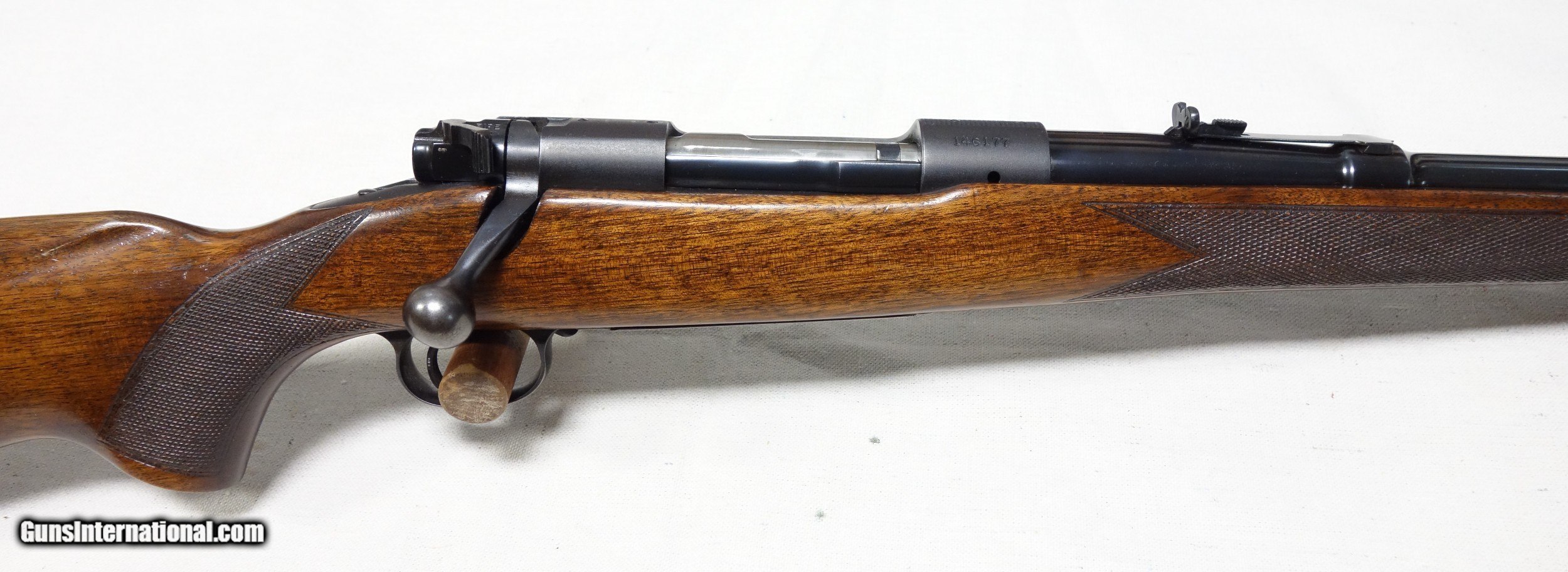 Description: Very nice example of an early post war rifle with straight comb and solid bolt knob in scarce 22 Hornet! S/N 146*** with matching scribed bolt made in 1950. 24" barrel with excellent bore. Mechanical functions are all smooth and proper. I have verified that the chamber has never been reamed to K and that all unique internal components are original and correct, including the H stamped floorplate. Overall condition is 96% or better with some light scuffing and impressions on Blue and Varnish, but nothing deep or distracting. A great, unmolested rifle in a difficult to find caliber. SOLD Curio/Relic: Yes |