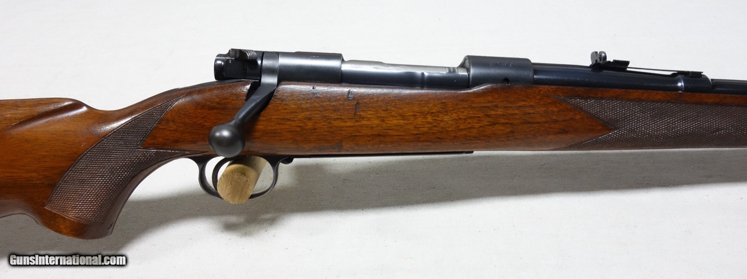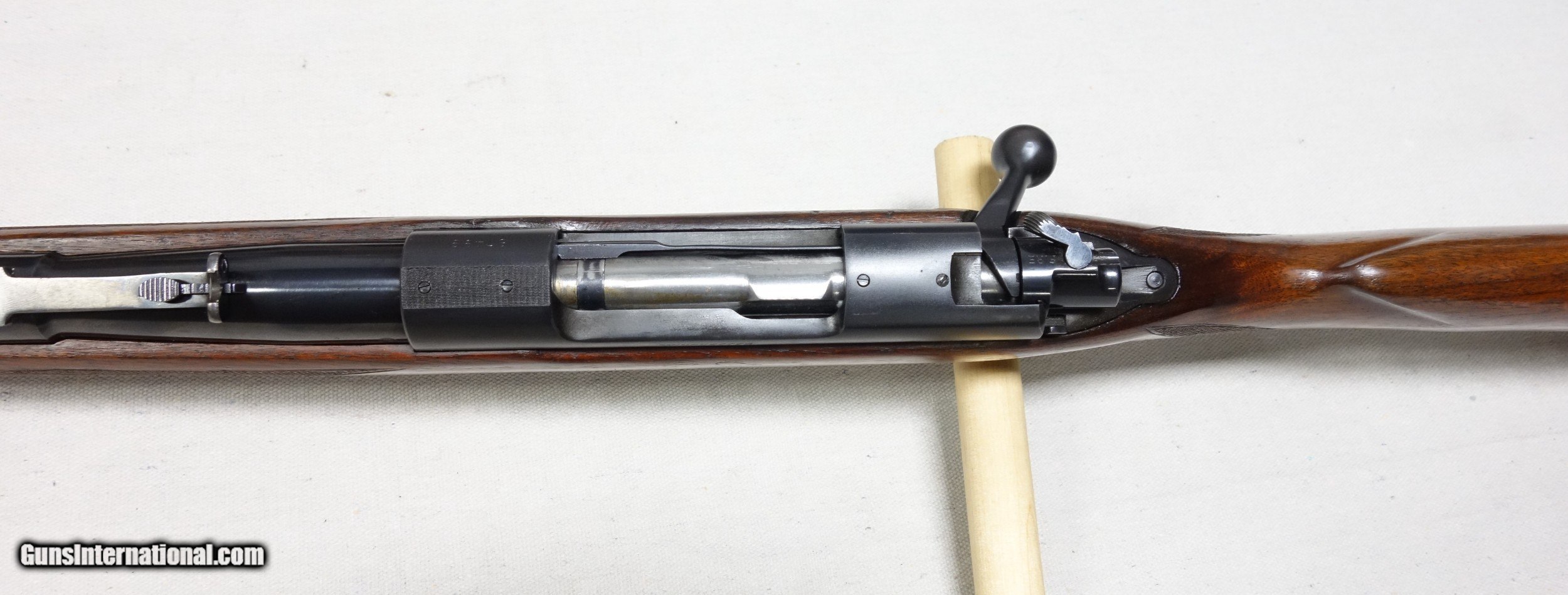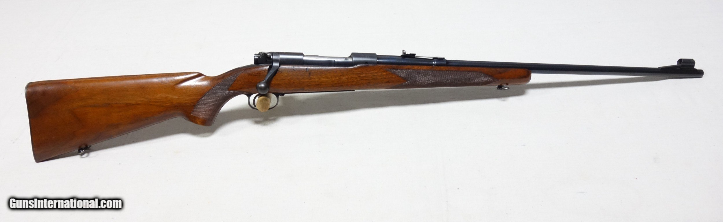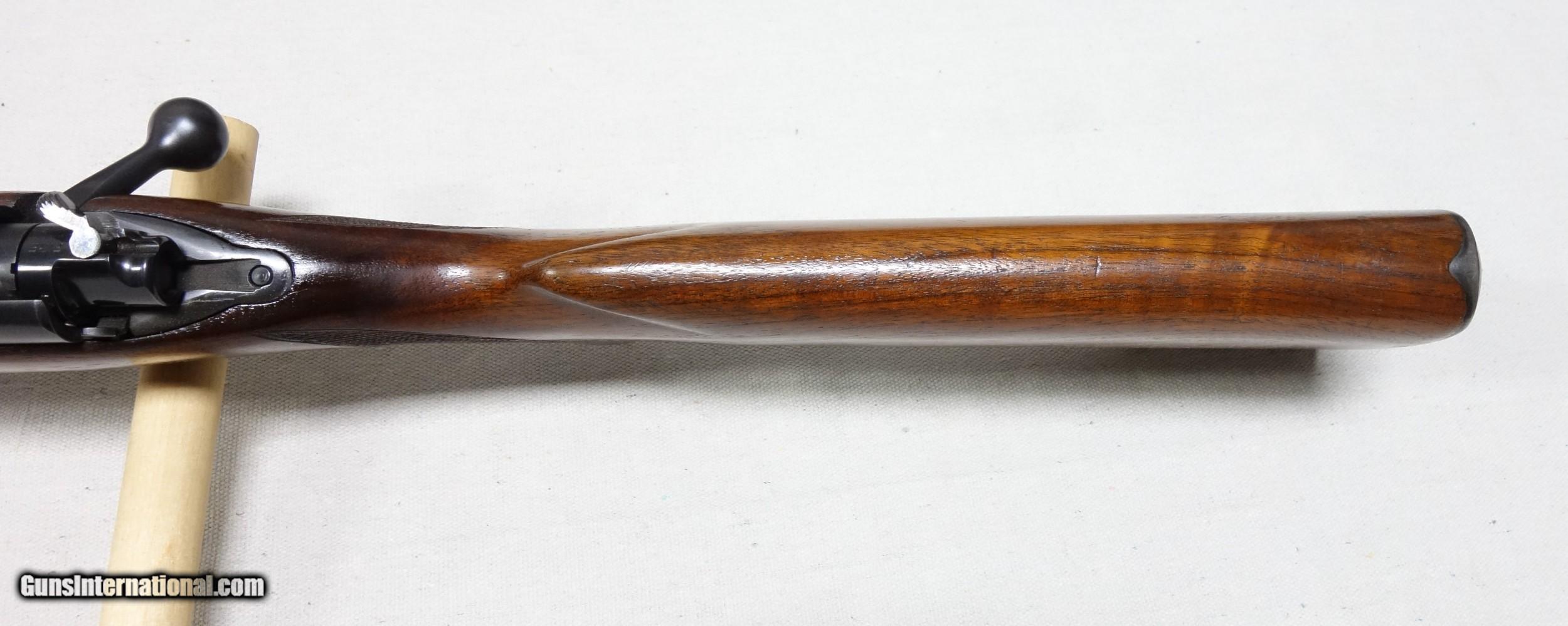 Description: ***SOLD, shipped*** An excellent and super scarce transition era rifle in 22 Hornet caliber. S/N 87*** with matching scribed bolt made in 1948. These "transition" guns were only made for a few years just after WWII from 1946-48 and unlike other post war guns have some unique features including a Pre War style clover leaf tang and the "clam shell" or "rabbit's foot" safety lever. This rifle is in excellent original condition showing 97% Blue other than the buttplate which shows more wear, and 96% Varnish with a few handling marks. 24" Barrel. The bore and mechanics are excellent. I have also verified that the chamber remains a true 22 Hornet and has never been reamed to K. A very nice and very hard to find rifle, and a blast to shoot. Expedited and fully insured shipping from Alaska to your FFL is an additional $75. SOLD Curio/Relic: Yes |