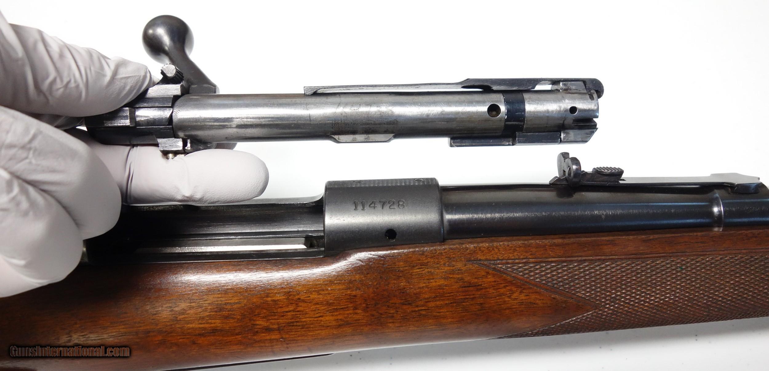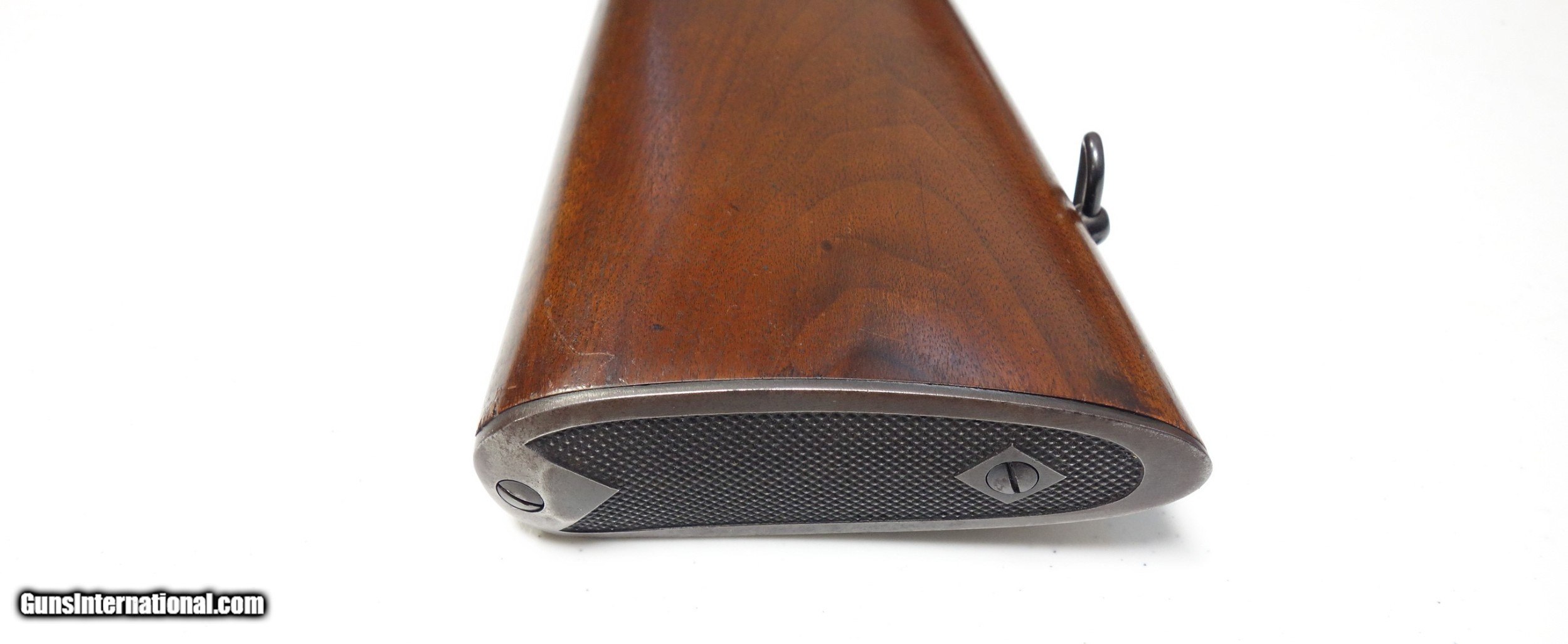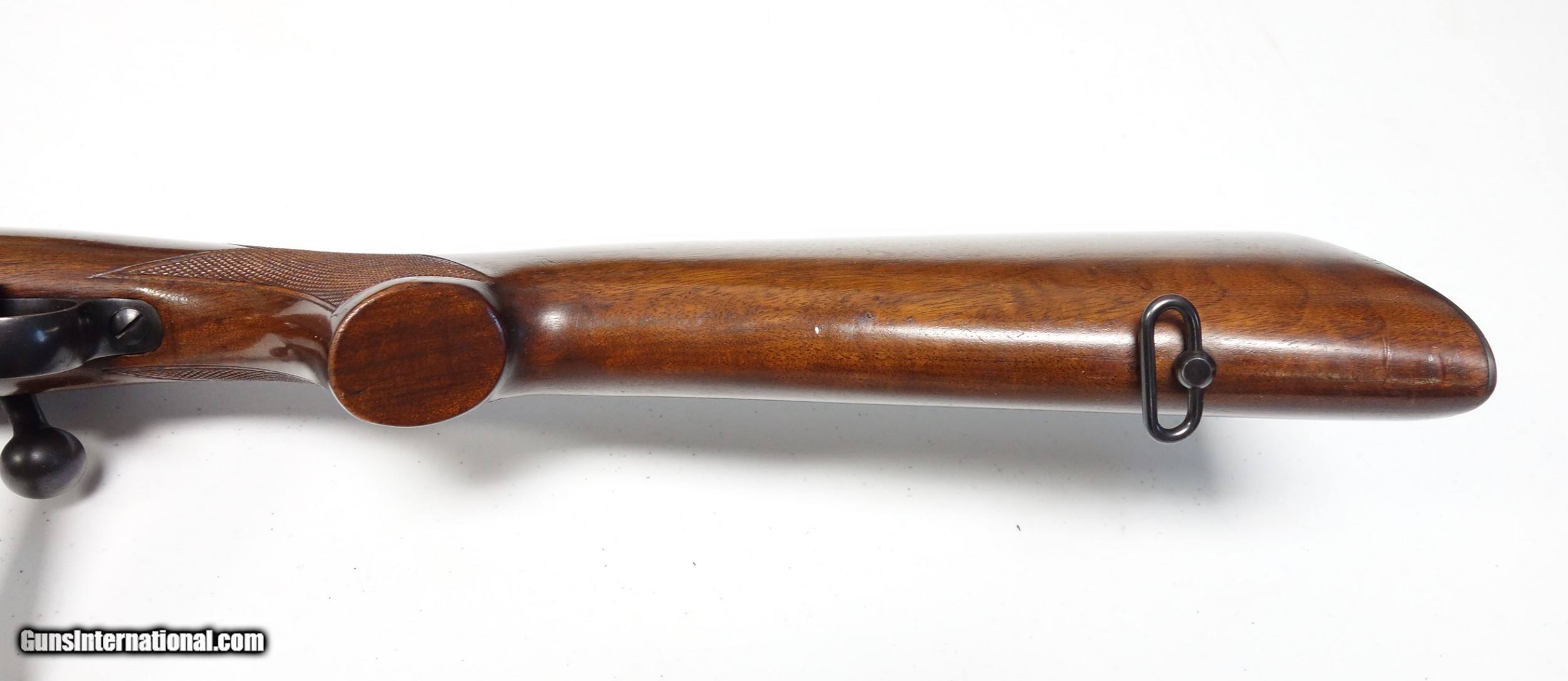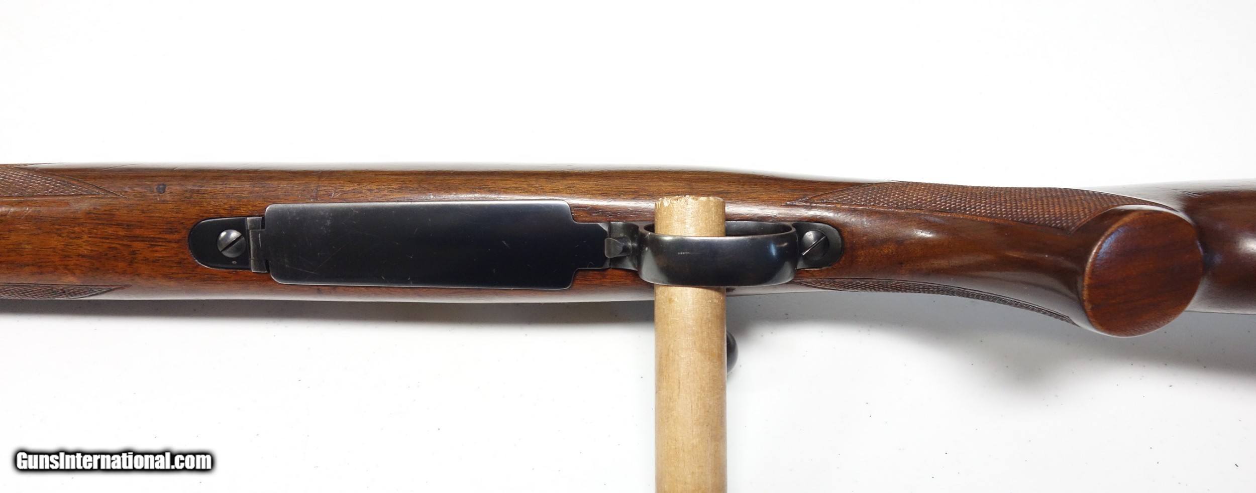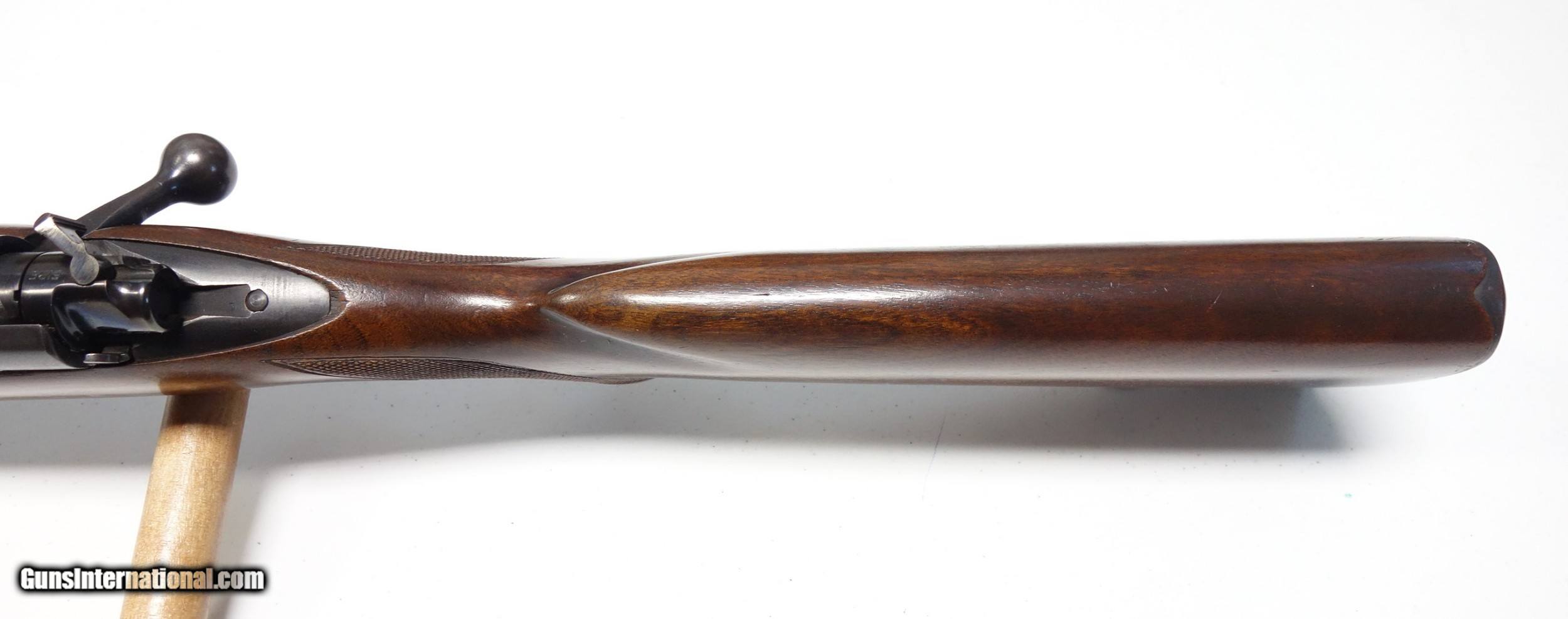 Description: Another genuine "Holy Grail" type rifle that you will not often see from any other source! This one has it all: Condition, Originality, and in an ULTRA scarce caliber. This is a Pre 64 Winchester Model 70 in 250-3000 Savage. S/N 114*** with matching scribed bolt made in 1949. 97% Blue, 97% Varnish. All of the unique inner components are correct including original #7 Mag box, #5 ejector, and the correctly positioned bolt collar/stop. I did notice during disassembly that the forward partition of the mag box has been removed. This is a very securely crimped piece so am guessing a previous owner must have popped it out to shoot longer profile bullets. I have personally confirmed that the rifle loads, stacks and cycles standard factory ammo perfectly with no issues whatsoever. The Barrel is 24" with an excellent bore. Mechanics are likewise smooth and functioning properly. This is a really great rifle and certainly one that does not come along every day! SOLD Curio/Relic: Yes |