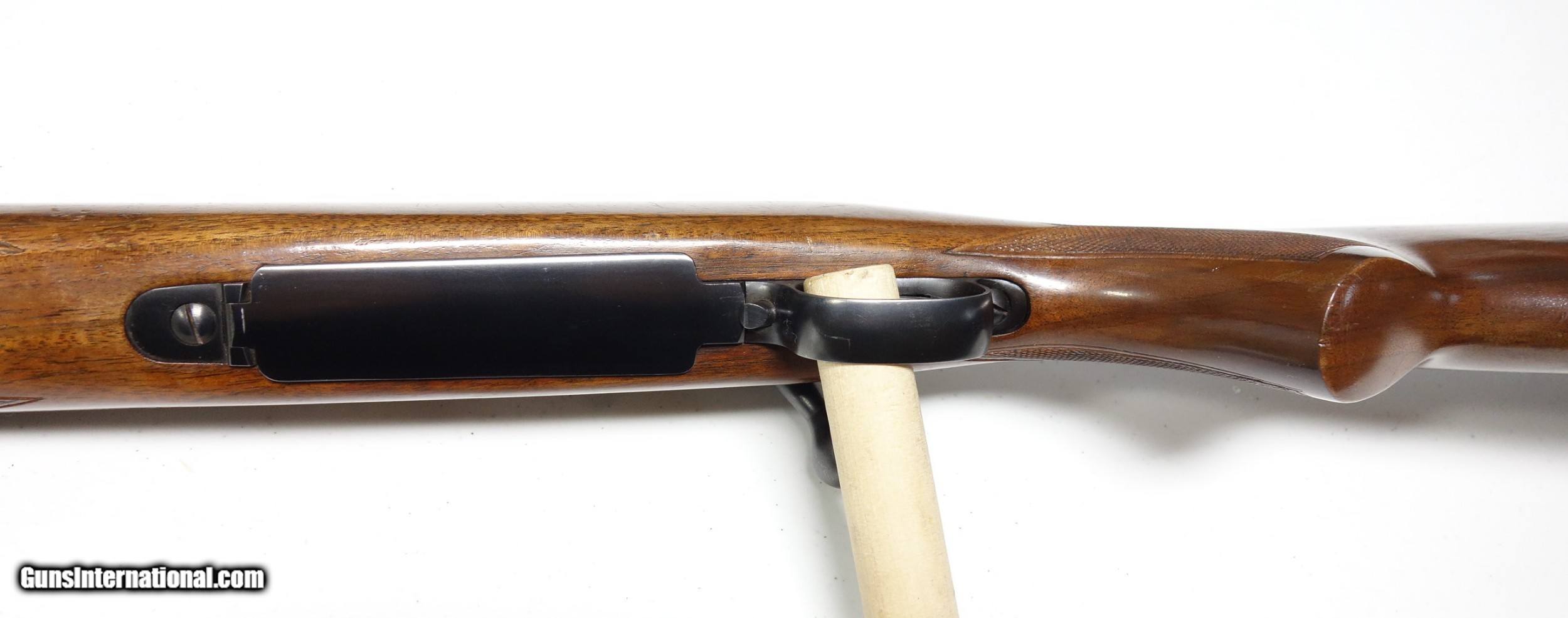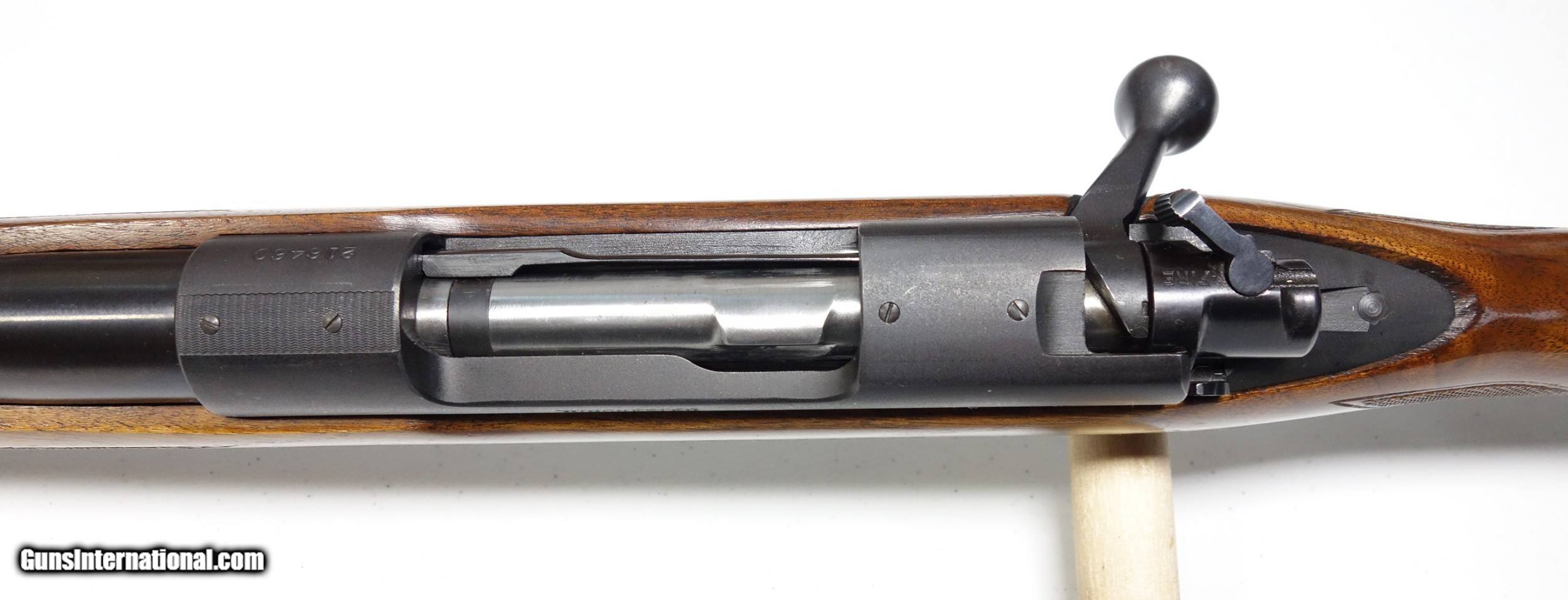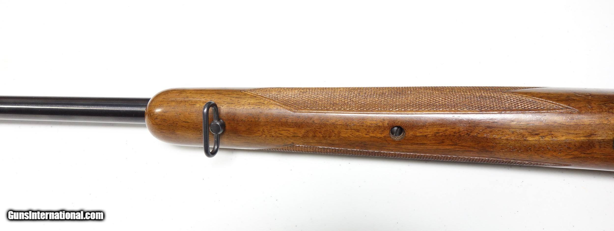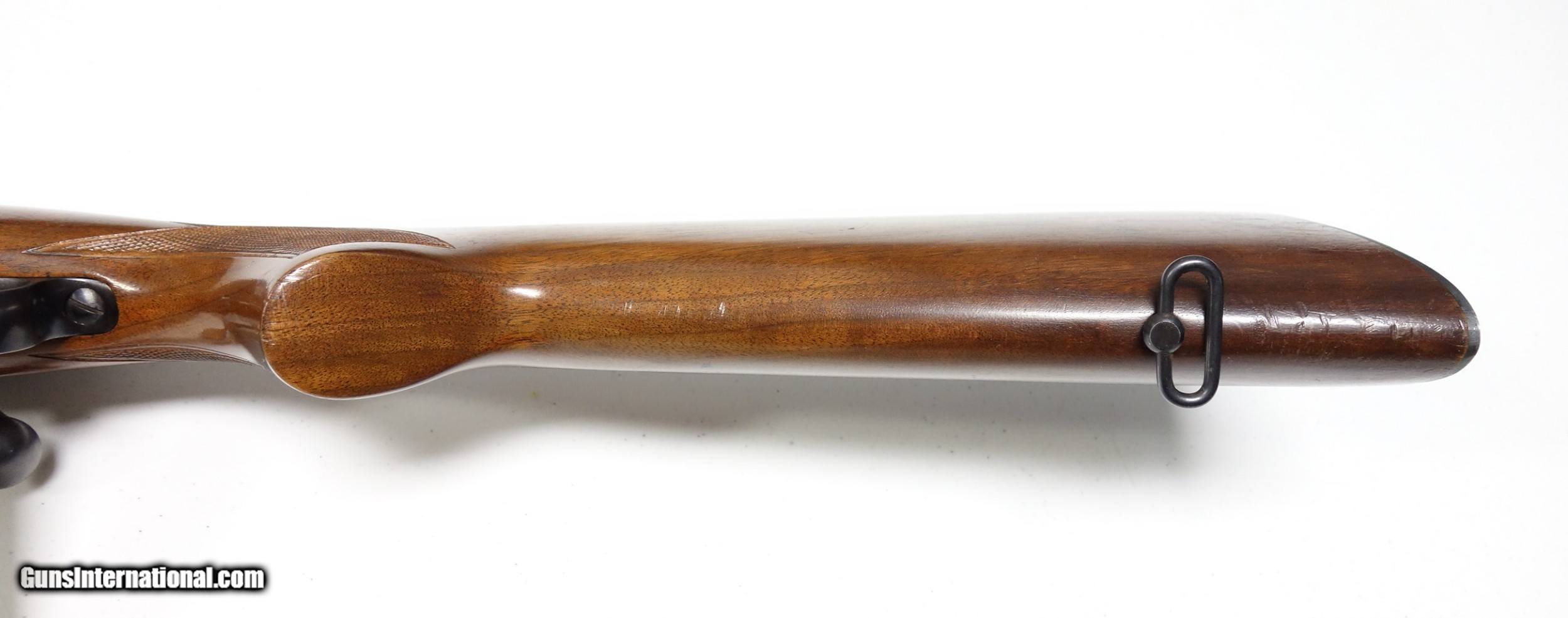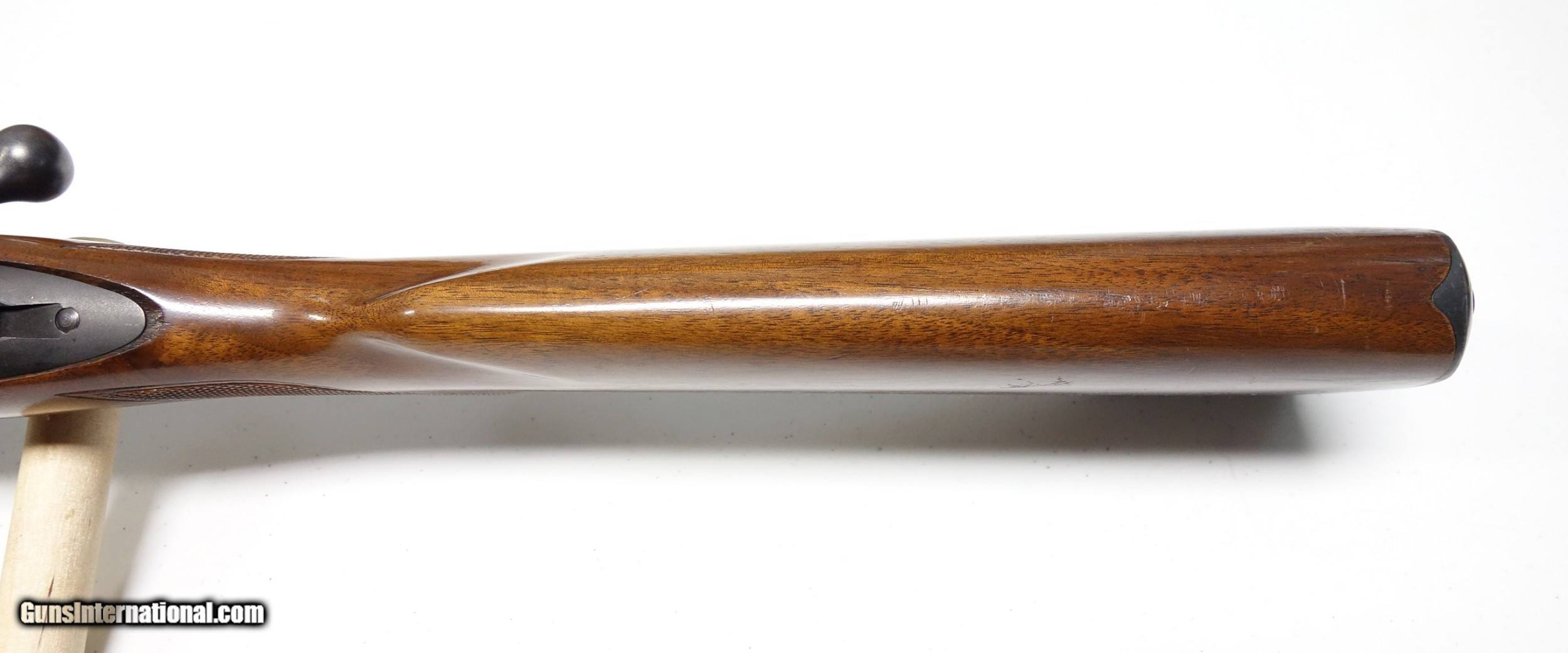 Description: Outstanding example of an early post-war Pre 64 Winchester 70 in amazing 30-06 caliber. S/N 216*** with matching scribed bolt made in 1952. This rifle is very clean inside and out, and did not appear to have ever been opened up or tampered with in any way when I inspected it. It has the desirable early solid bolt knob and straight stock comb. 24" Barrel with excellent bore and excellent mechanical function. All components are correct as usual. Condition is excellent at 98% Blue. The wood is just about as nice with a few superficial marks scattered about, say 97%. Considered a fairly "common" caliber as far as Pre 64 70s go but in a quite uncommon condition! SOLD Curio/Relic: Yes |