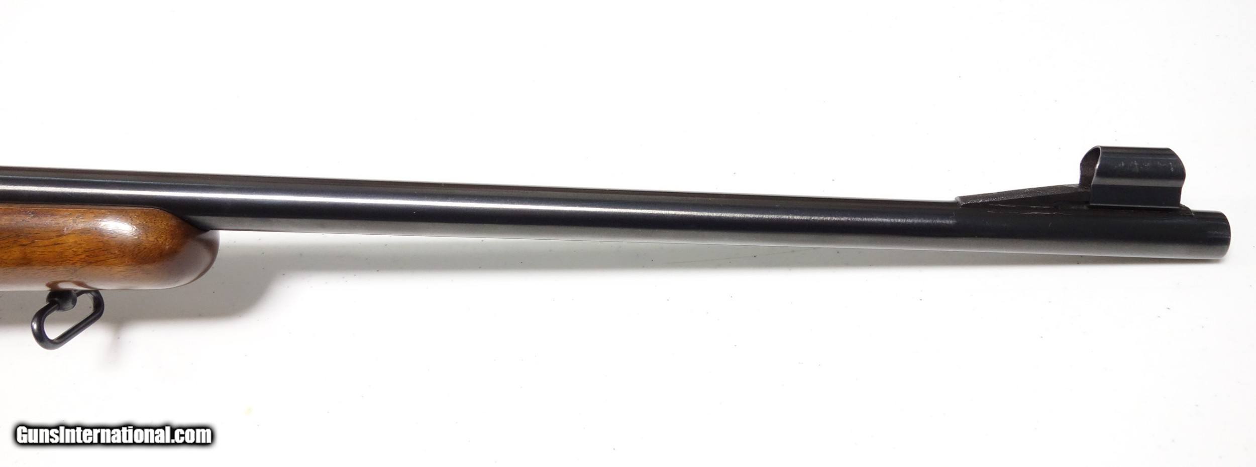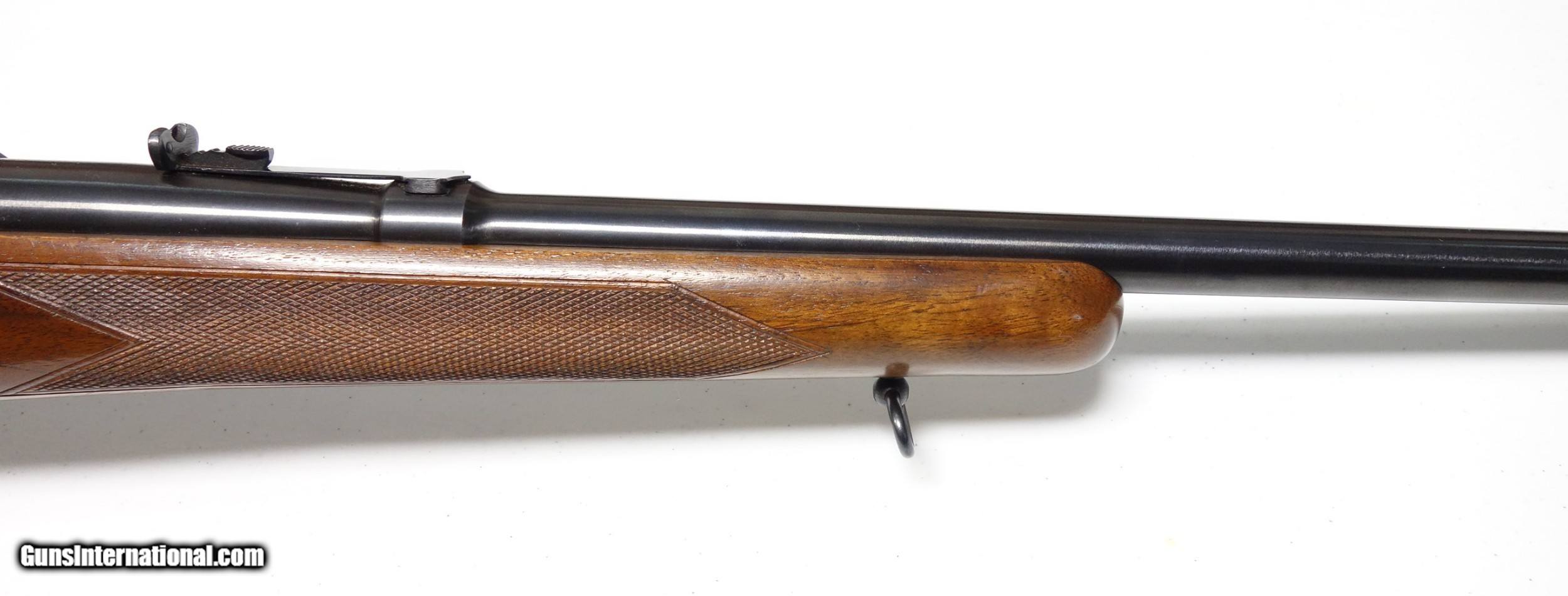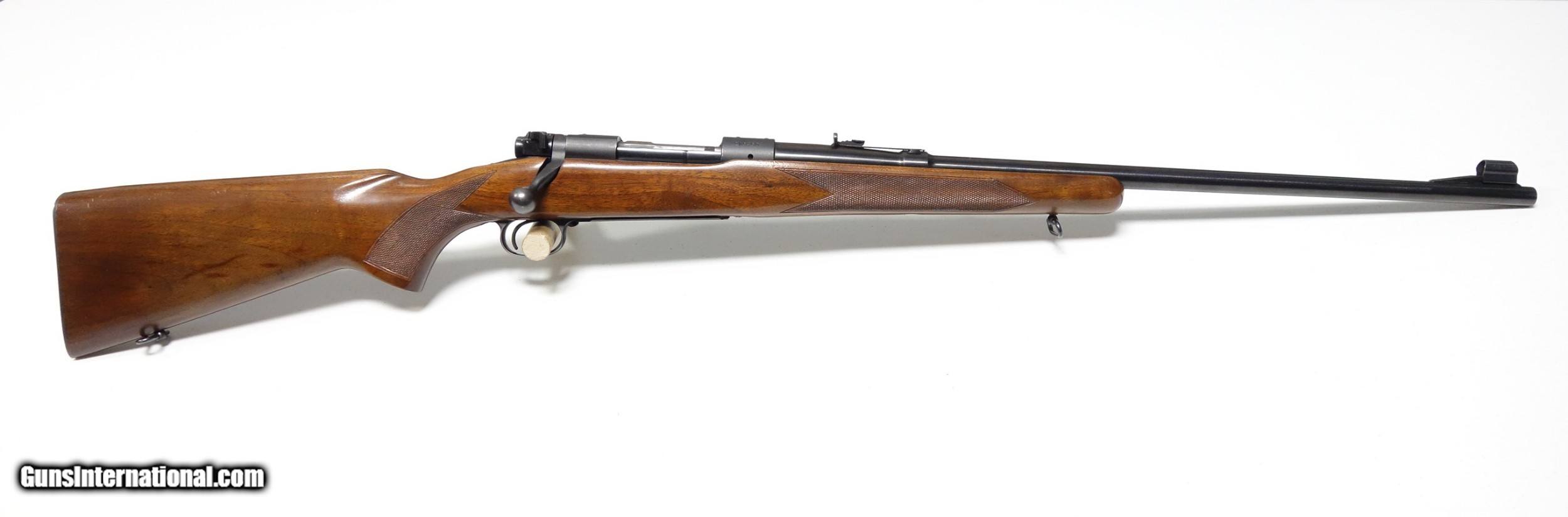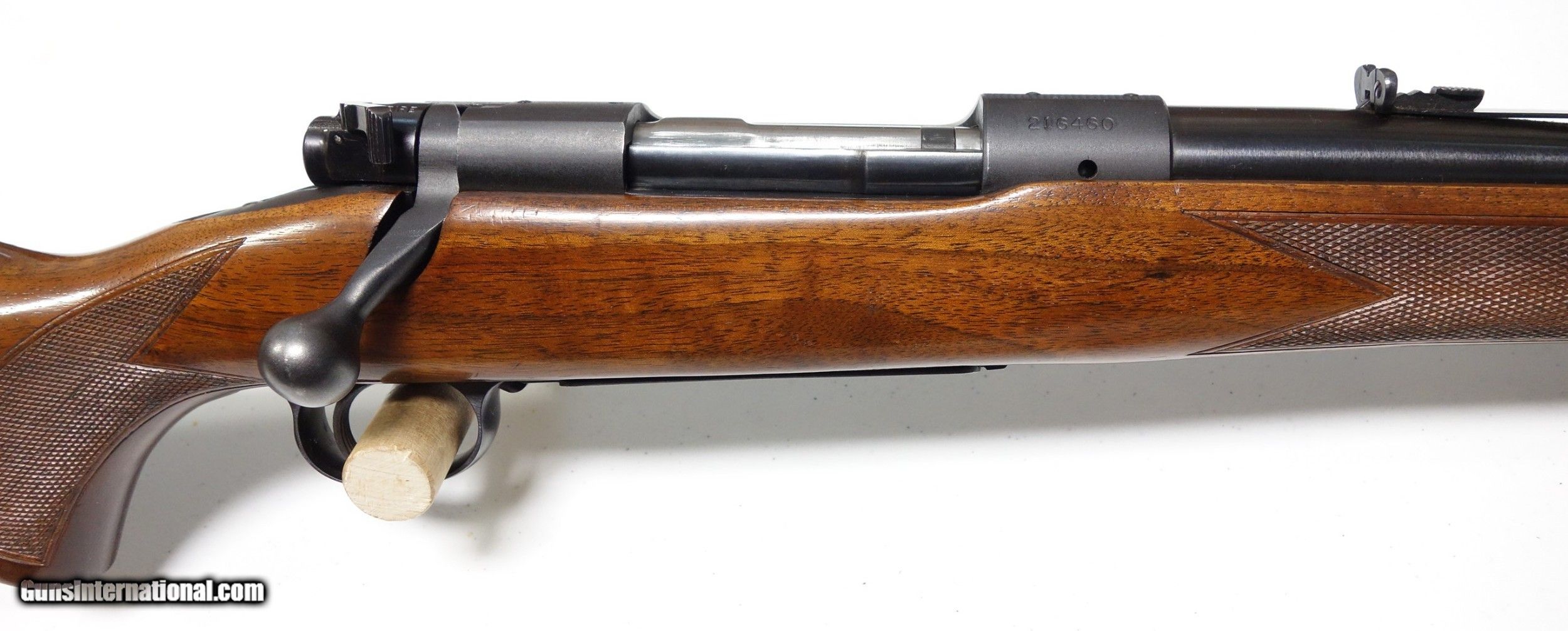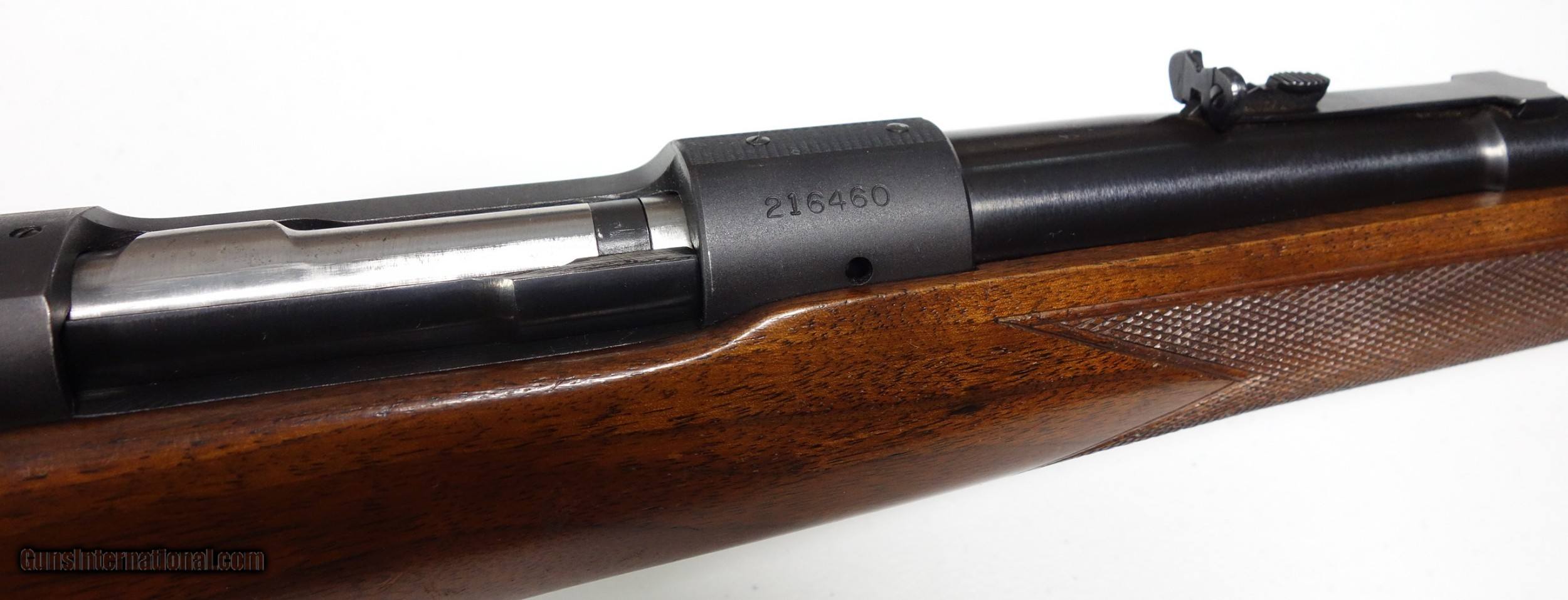 Description: Outstanding example of an early post-war Pre 64 Winchester 70 in amazing 30-06 caliber. S/N 216*** with matching scribed bolt made in 1952. This rifle is very clean inside and out, and did not appear to have ever been opened up or tampered with in any way when I inspected it. It has the desirable early solid bolt knob and straight stock comb. 24" Barrel with excellent bore and excellent mechanical function. All components are correct as usual. Condition is excellent at 98% Blue. The wood is just about as nice with a few superficial marks scattered about, say 97%. Considered a fairly "common" caliber as far as Pre 64 70s go but in a quite uncommon condition! SOLD Curio/Relic: Yes |