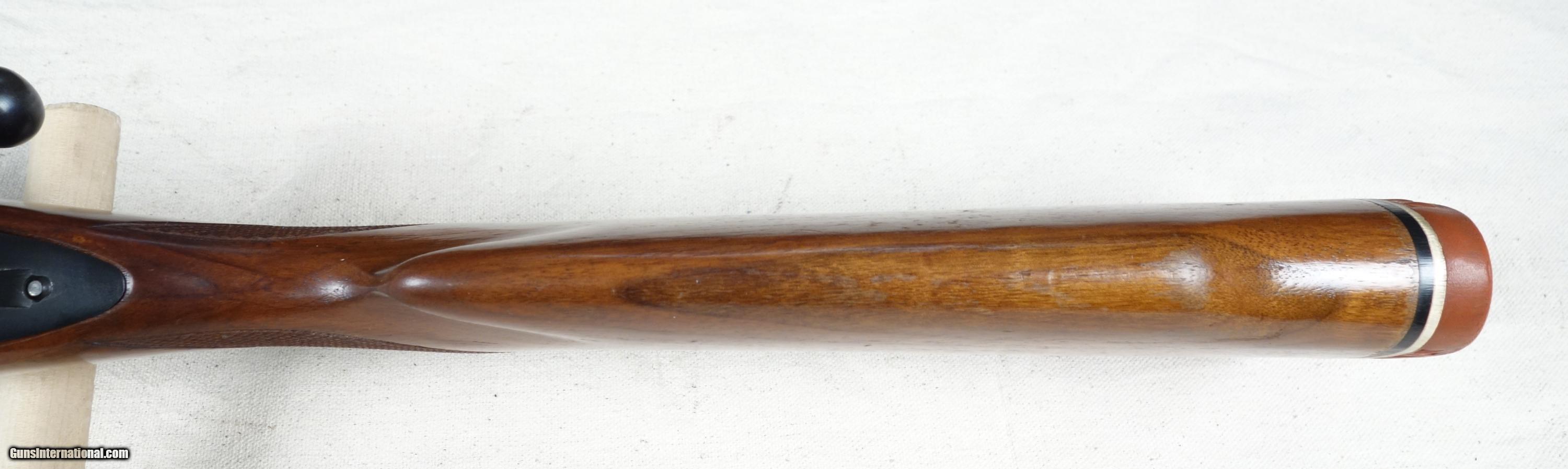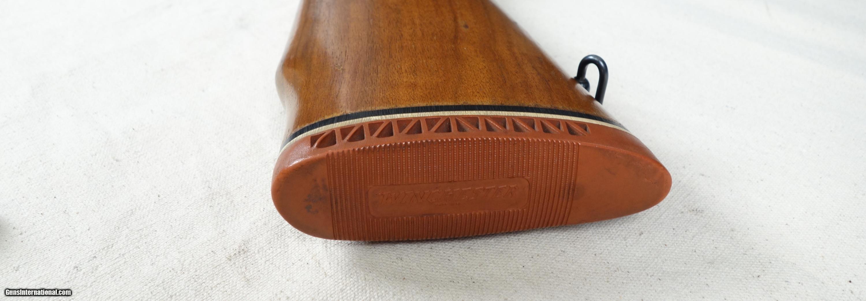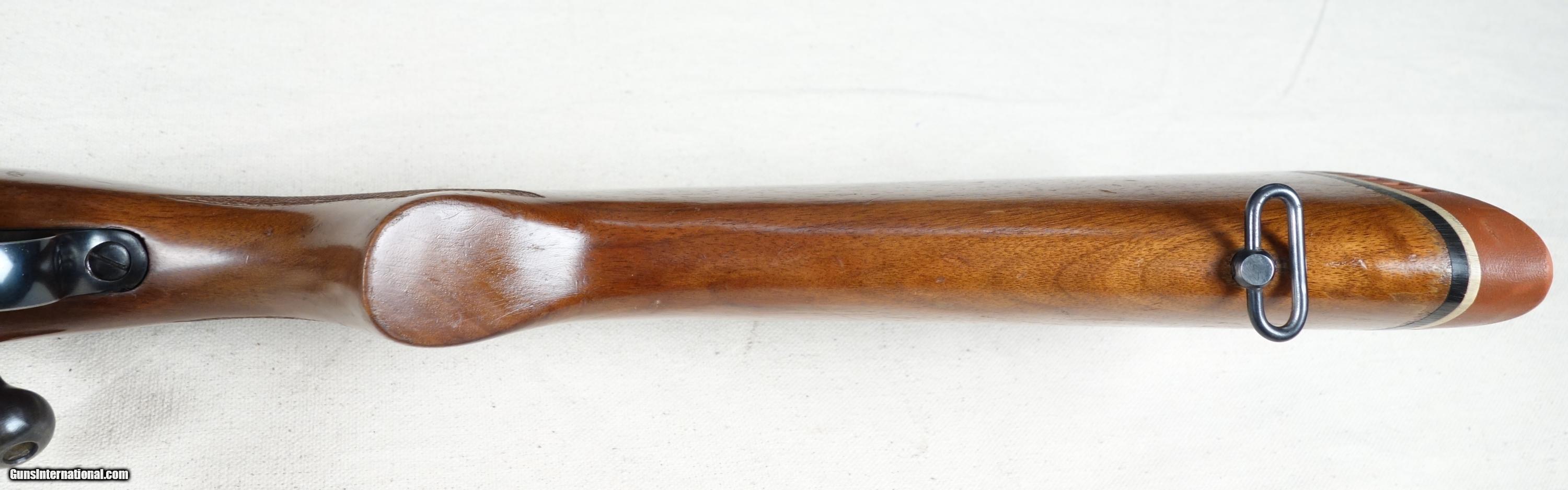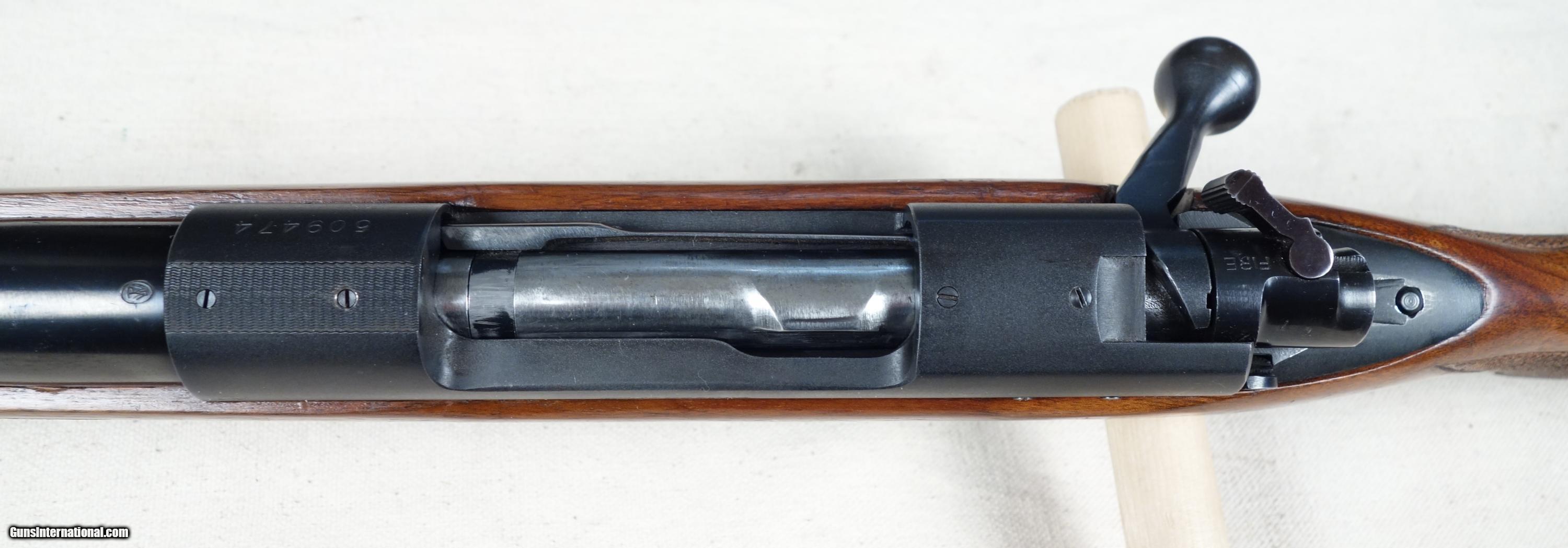 Description: Exceedingly rare Pre 64 Winchester 70 300 WIN mag standard rifle. 24" Barrel. Factory red ventilated pad as issued on all in this caliber. S/N 509xxx with matching bolt Mfg. 1963. 97% Blue, 95% Varnish with light impressions and handling marks. All original with exception of a tiny amount of epoxy fill around front swivel stud as shown. Overall, a very nice looking rifle in a very difficult caliber to locate, which made up less than 1% of total production! SOLD Curio/Relic: Yes |
