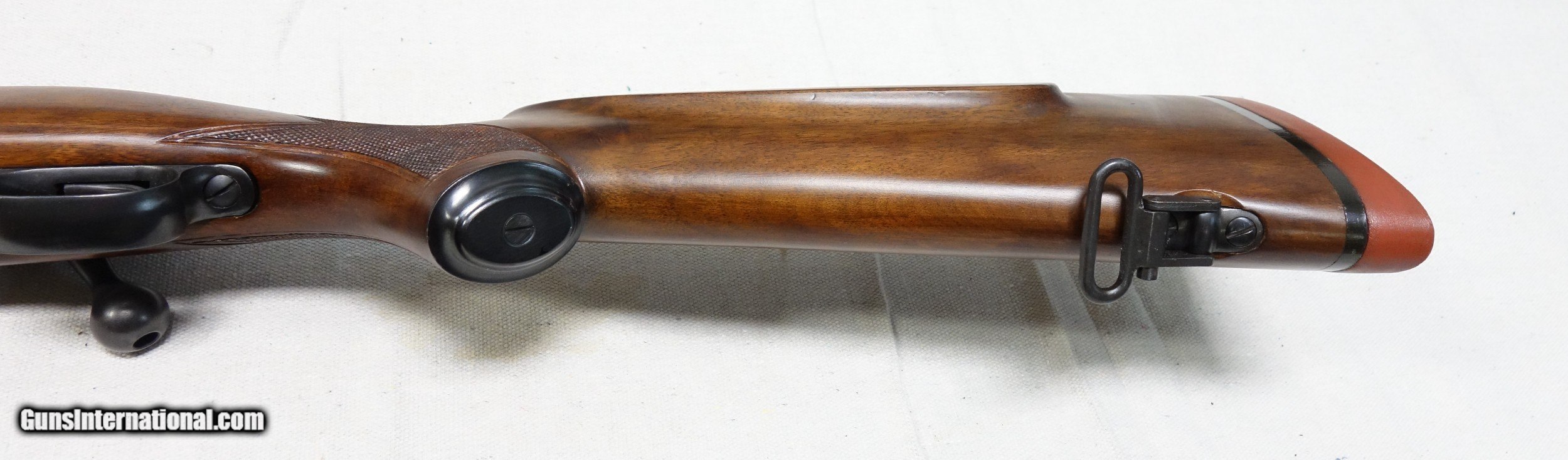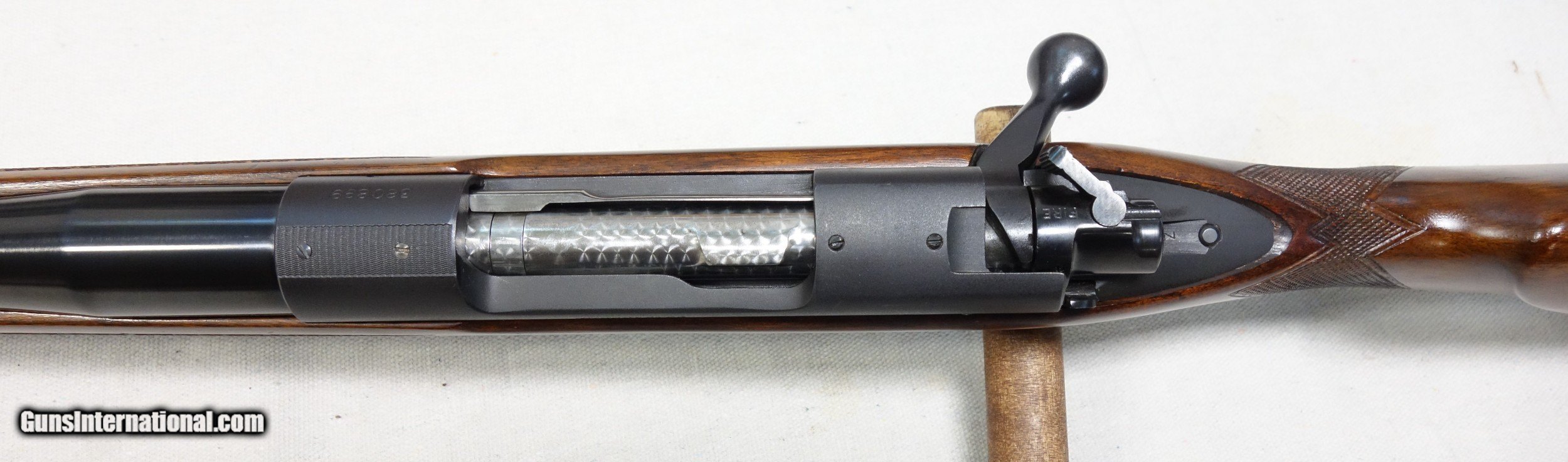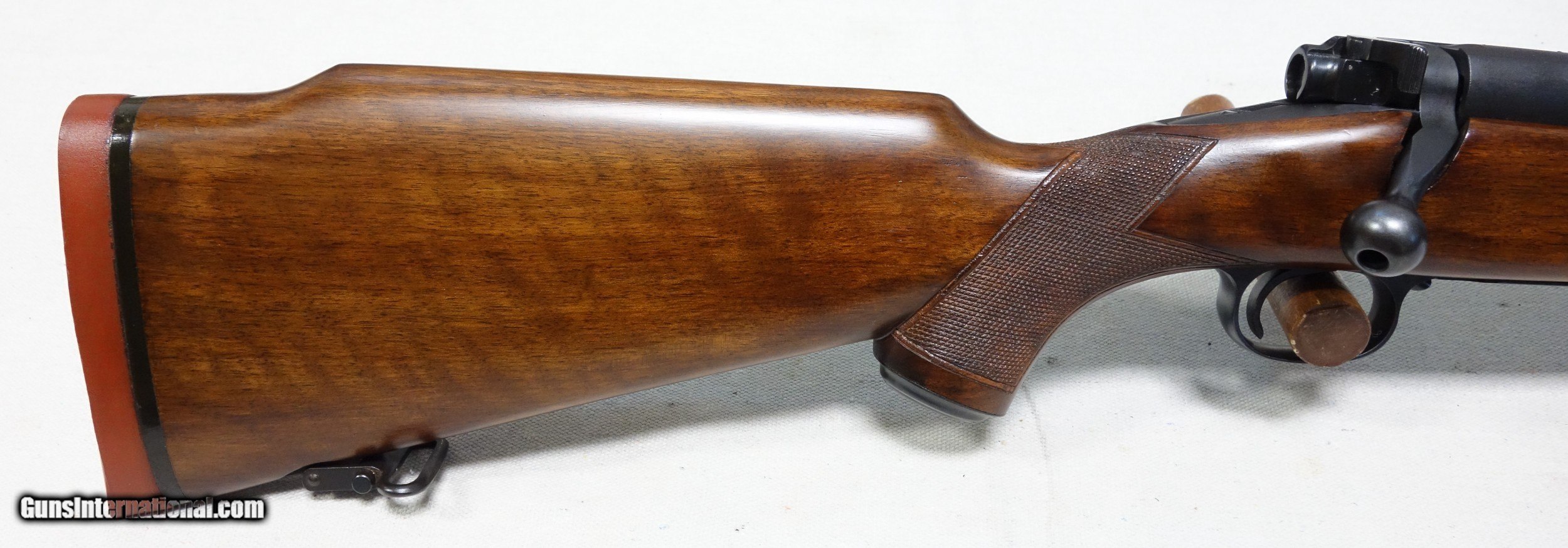 Description: ***SOLD*** Ultra rare (only 1226 ever made) 458 Winchester Magnum African in pristine condition! S/N 380*** with matching scribed bolt made in 1956. 99% plus condition throughout with perfect bore and mechanics. These few incredible rifles were actually put together much like Super Grades, so have most of the usual appointments such as deluxe stock with cheekpiece and contrasting foreend tip, Super Grade stamped floorplate, detachable swivels, etc. The inner action components of bolt body, extractor, and follower are also factory jeweled with properly applied S/N scribe on top of that jeweling. There is also a factory installed single cross bolt to prevent cracking, factory installed solid red pad, and a unique Lyman 37 front sight. A truly beautiful and highly collectible rifle! Expedited and fully insured shipping from Alaska to your FFL in a custom cut foam lined box is $100. SOLD Curio/Relic: Yes |