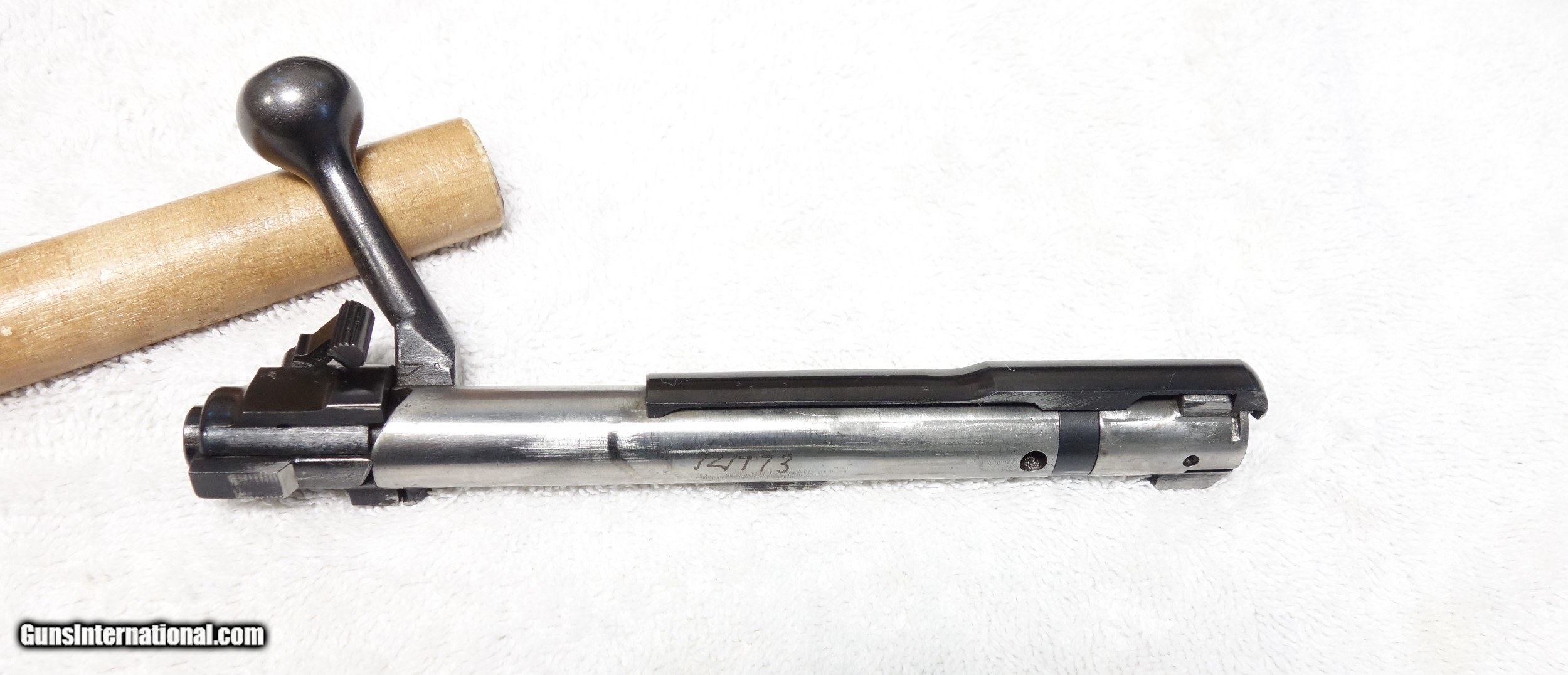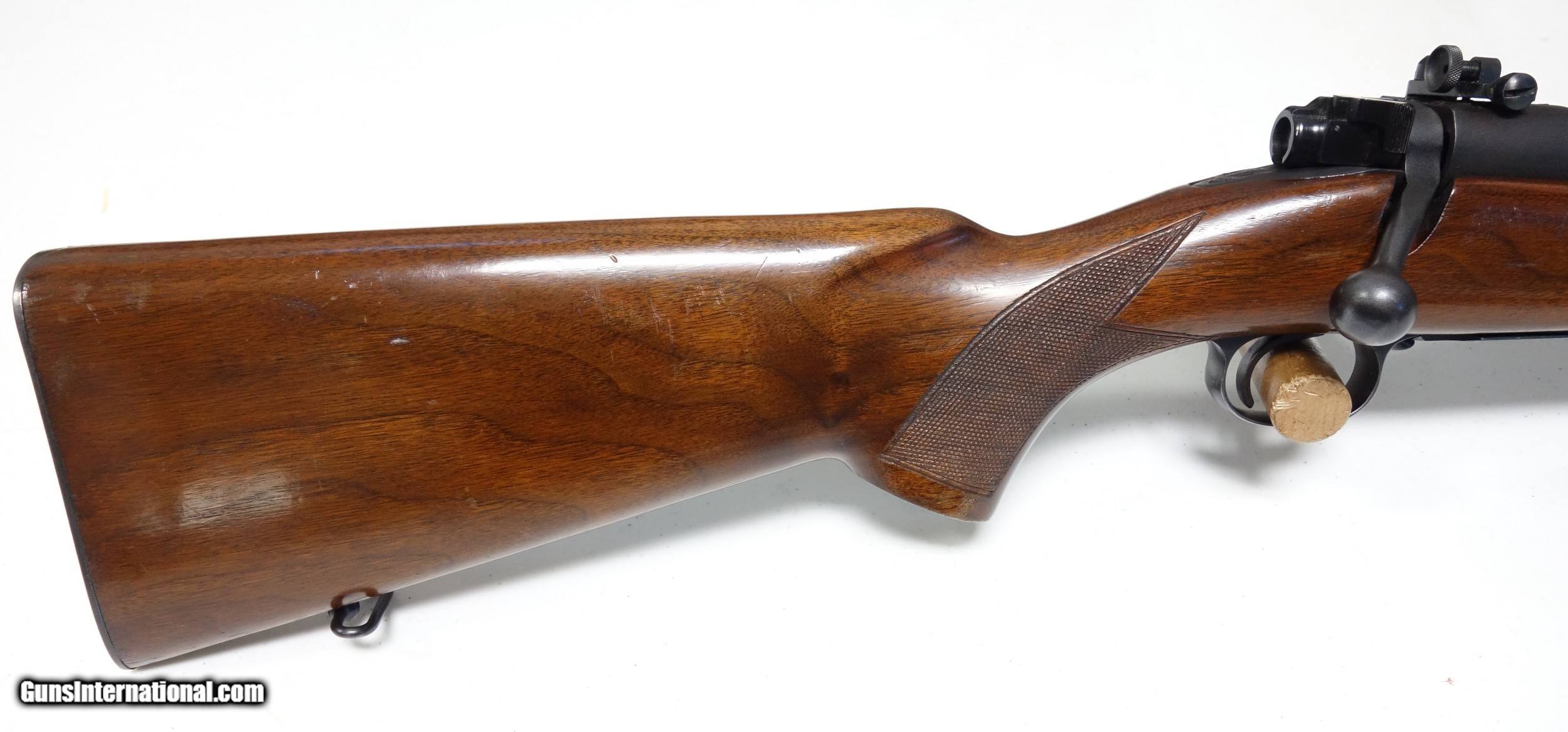 Description: Very late S/N'd Transition era Winchester Model 70 in the highly popular and versatile .270 Win. caliber. S/N 121*** with matching scribed bolt made in 1949. This is one of the last transition period rifles with the Pre War style "clover leaf" tang ever produced. Condition is quite nice at about 96-97% original finishes overall with only light handling marks. This is a nice dark stock with a slight grain pattern. There are no noteworthy dents, gouges or cracks anywhere. The rifle has a factory installed Lyman 48 WJS receiver sight with Lyman 12S filler plug in the rear sight boss dovetail. There is absolutely no elevator mark on top of the barrel, suggesting that this rifle has never worn the more commonly issued 22g rear sight. This is the correct Lyman 48 style introduced in 1947 with the scalloped base which did not require a notch to be cut in the stock. The sight's component numbers are all matching. There are no marks whatsoever from the receiver sight's base, which is well clear of the wood, nor is there a bore hole from the elevation screw. This is a very clean and somewhat unique rifle in a highly useful caliber. SOLD Curio/Relic: Yes |