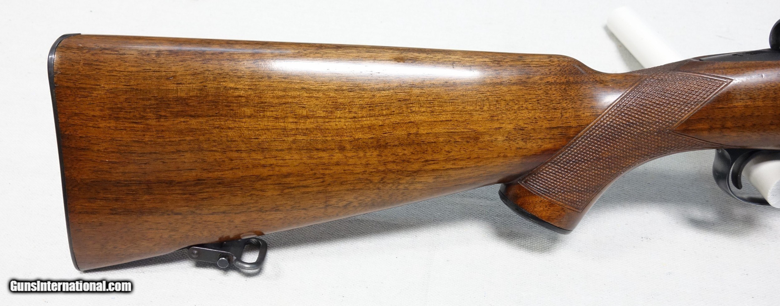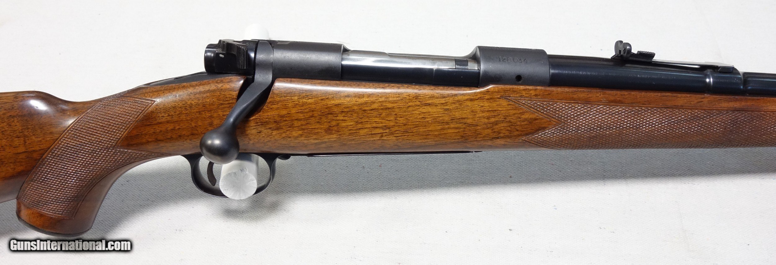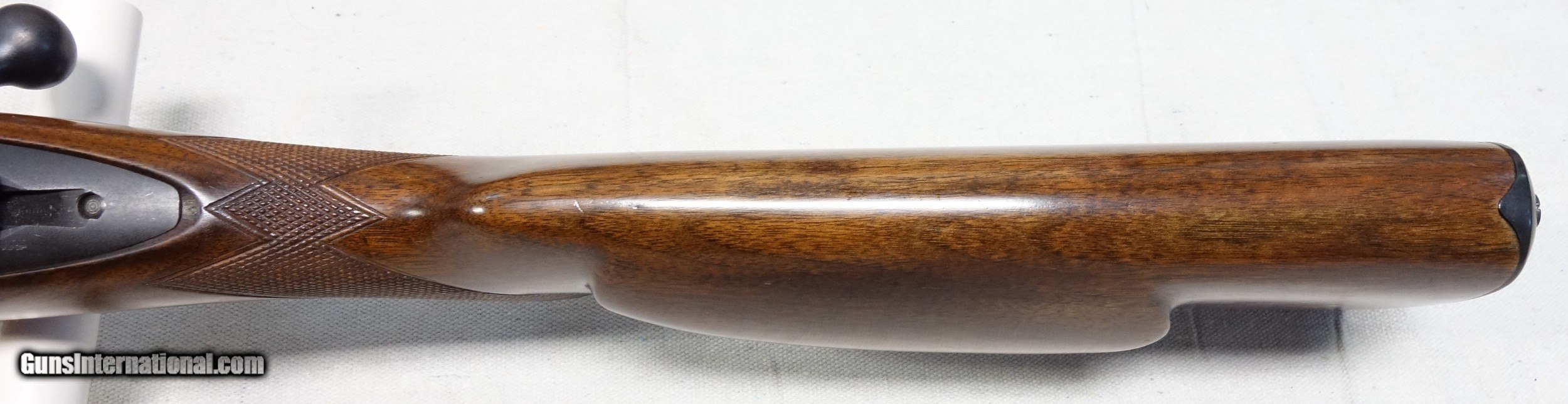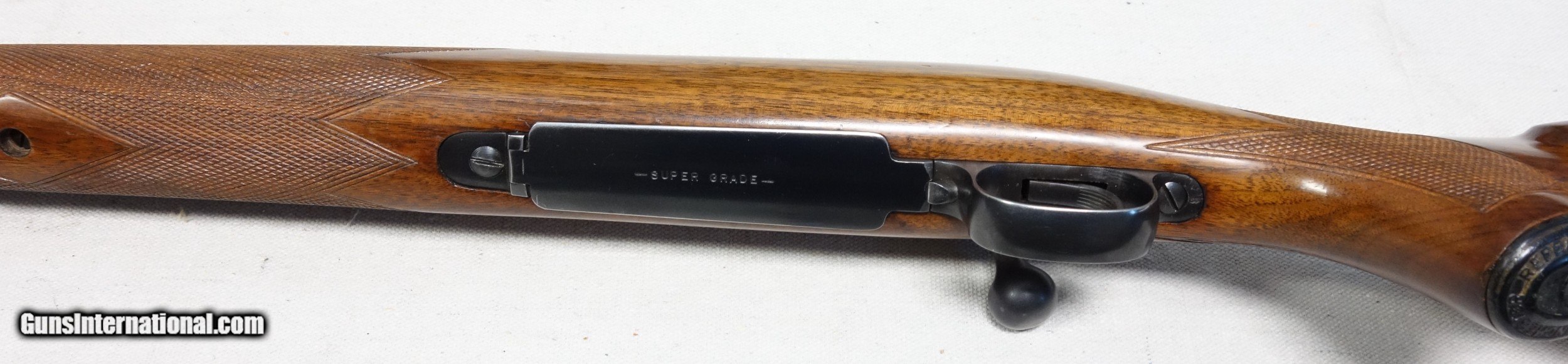 Description: Excellent example of an early post war 270 Super Grade in all original condition. Clean inside and out. S/N 128*** with matching bolt made in 1949. 98% Blue and 97% Varnish throughout. All correct Super Grade components present including a solid low combed SG stock with pancake cheekpiece, Super Grade stamped floorplate, Redfield 255 gold bead front sight, 22G rear sight w/ correct 4 step elevator, and proper detachable swivels. 24" Barrel. Excellent bore and mechanics. You won't see too many "common" caliber Supers these days, and this is among the nicest ones you will see. Expedited and fully insured shipping from Alaska to your FFL is additional $100. SOLD Curio/Relic: Yes |