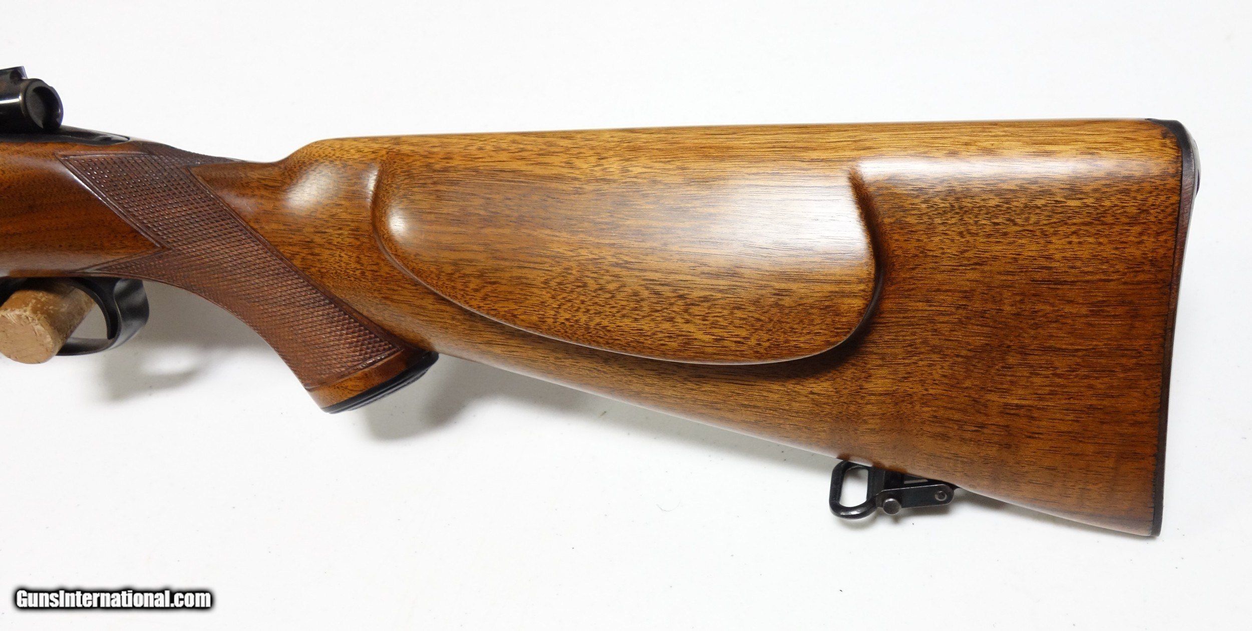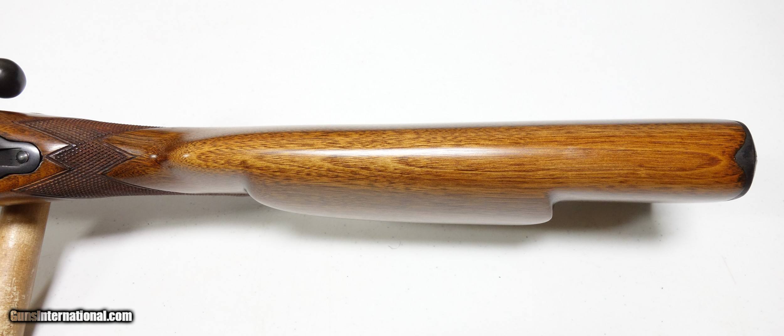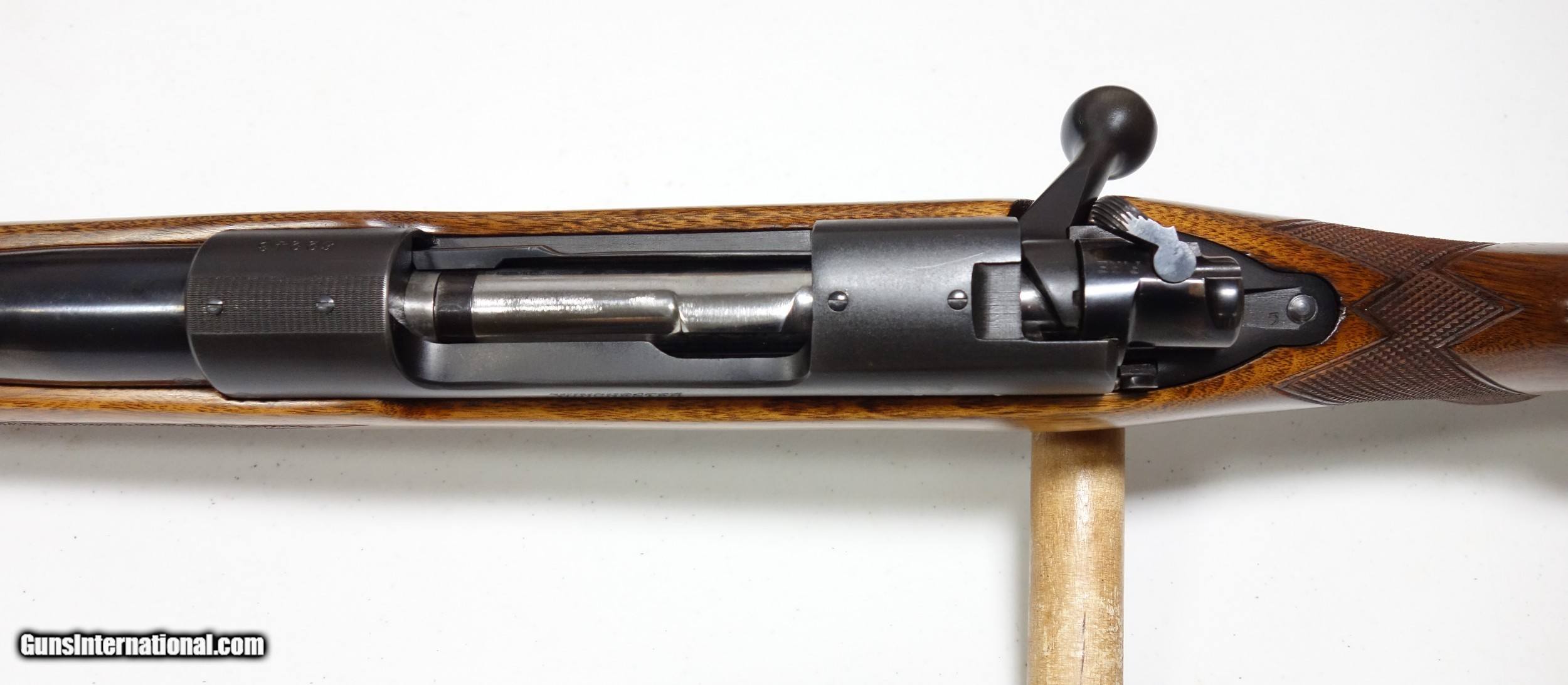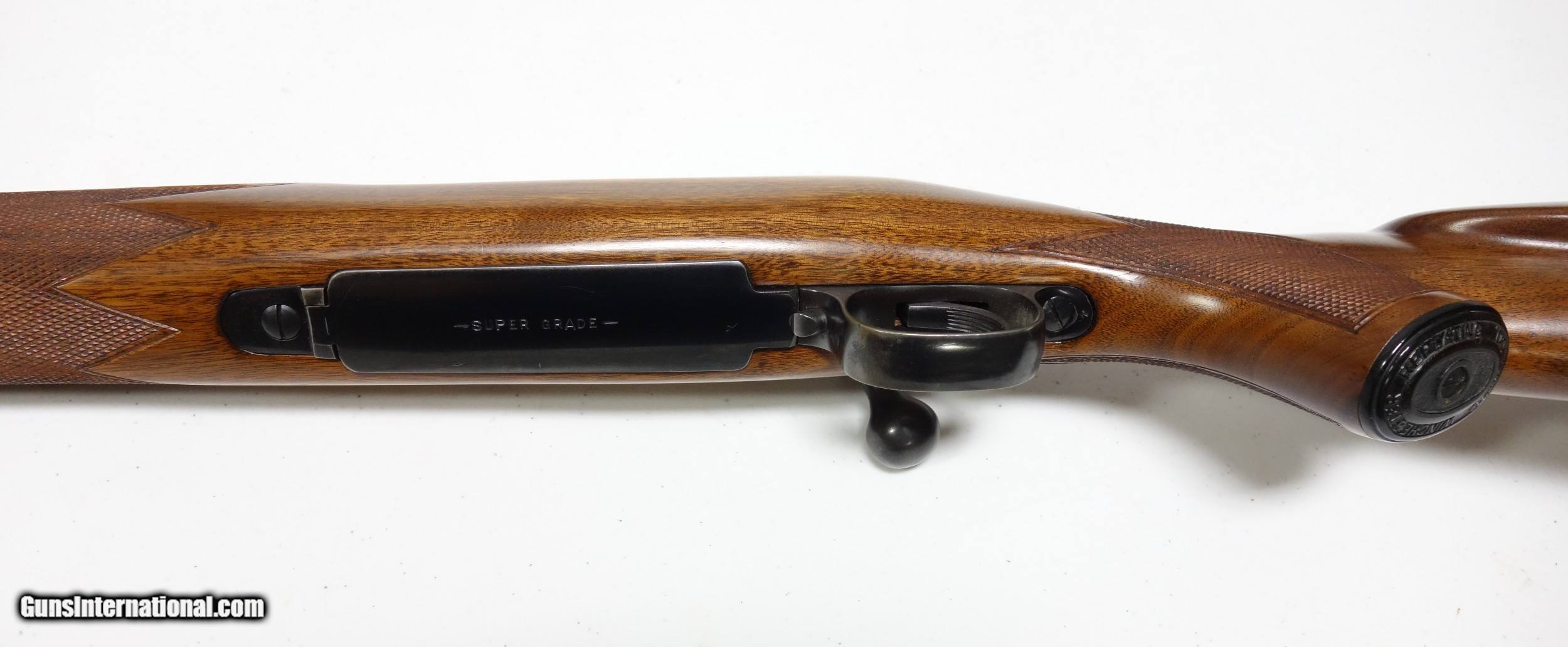 Description: ***SOLD*** Incredible and rare transition era .270 Super Grade with a VERY unique piece of wood. S/N 62*** with matching scribed bolt made in 1947. Beautiful condition throughout showing 98%-99% original finishes. All correct Super Grade components are present including the special Redfield front sight and detachable swivels. Bore and mechanics are flawless, as are the internals. This scarce early post war rifle retains the Pre War style receiver with a clover leaf tang and has the unique to this era "clam shell" aka "rabbit's foot" safety. The beautiful wood shows quite a unique color pattern with very light streak running along the comb, then reemerges along the L. side forearm. There is another lighter section on the toe. I have seen this phenomenon before, but to a lesser degree. There are absolutely no blends or refinish that I can detect and I think I've seen it all! It's just a really cool and different piece of wood. Certainly a conversation piece for any collection! Expedited and fully insured shipping from Alaska to your FFL is an additional $75. SOLD Curio/Relic: Yes |