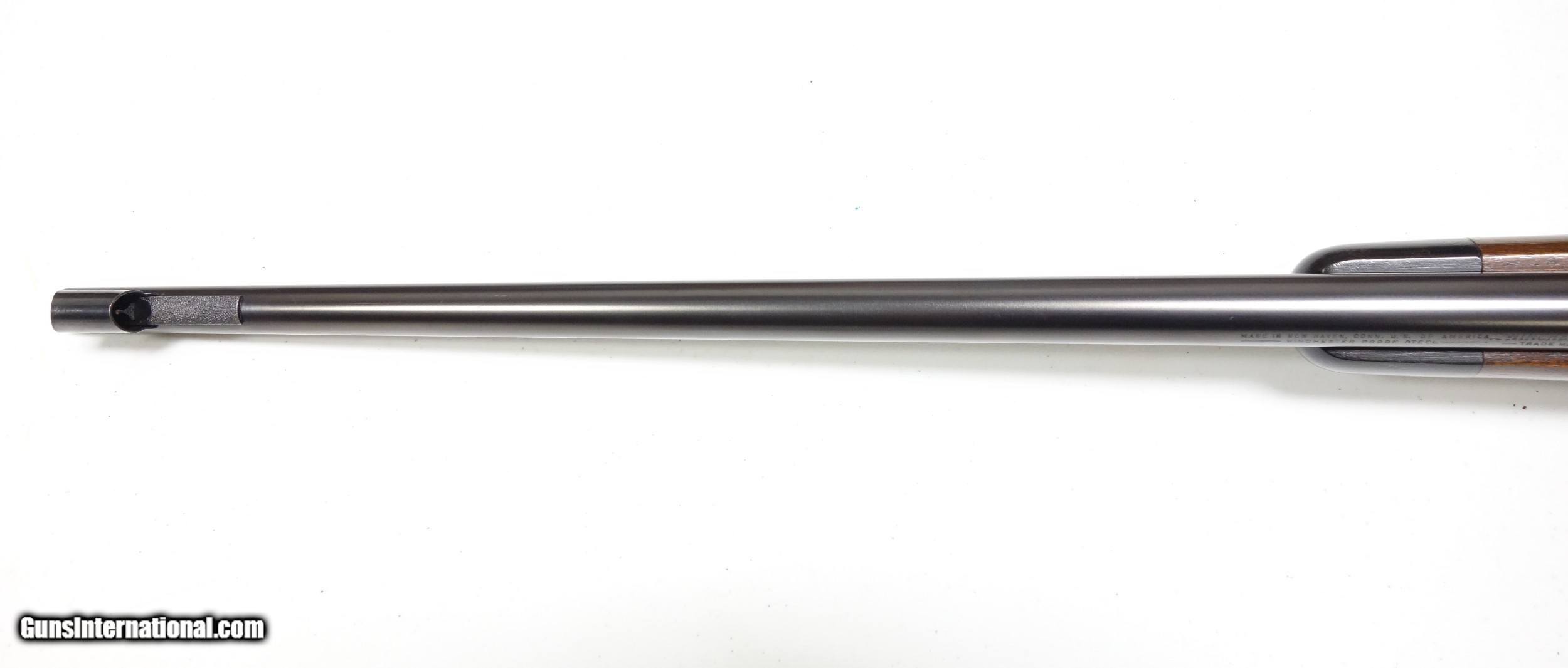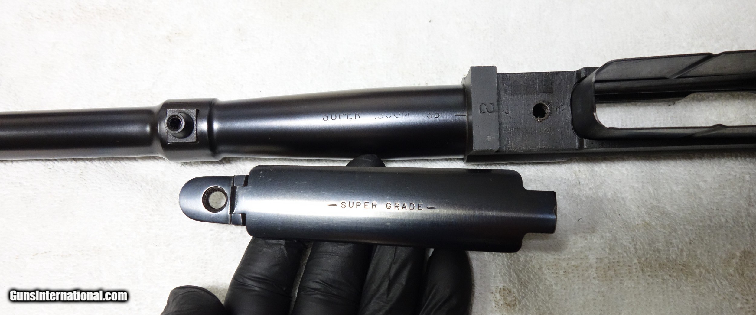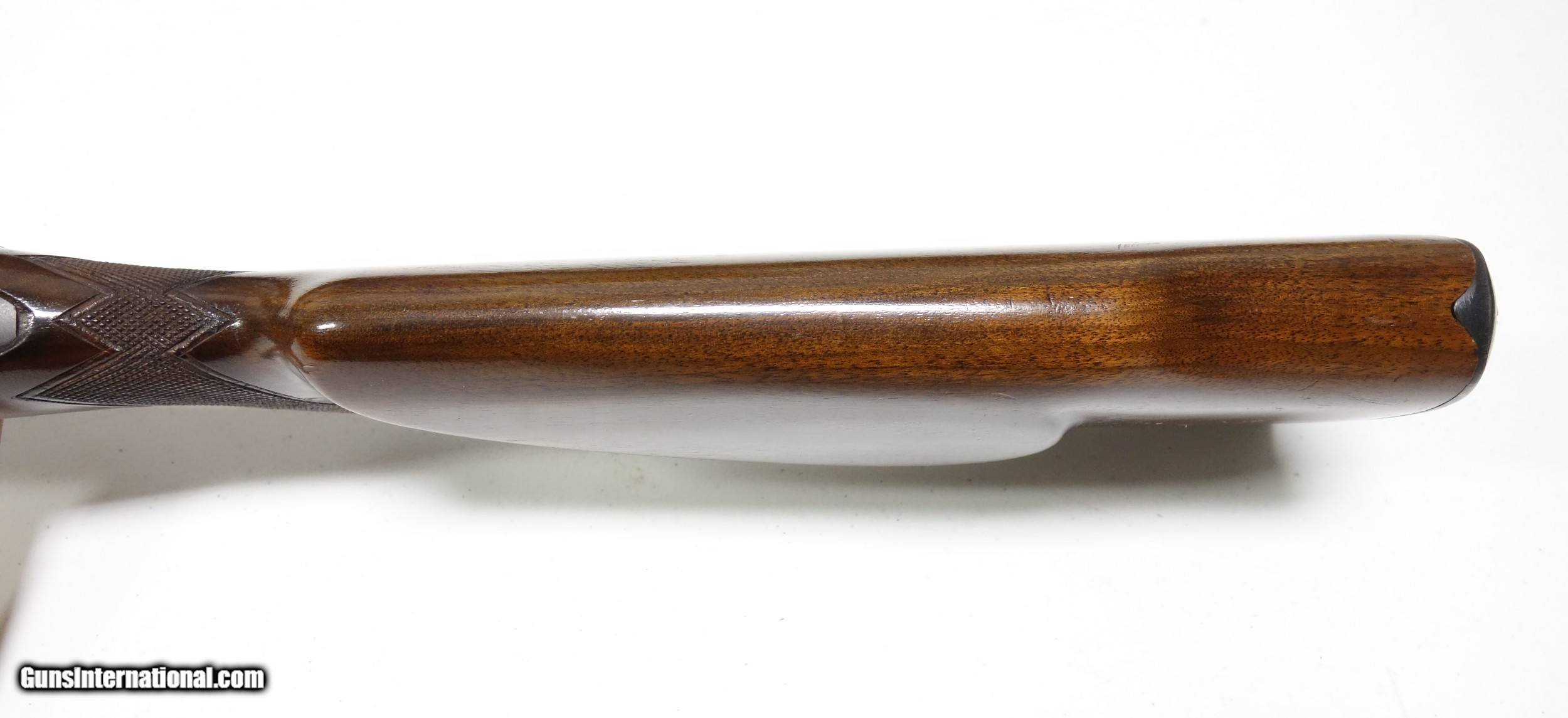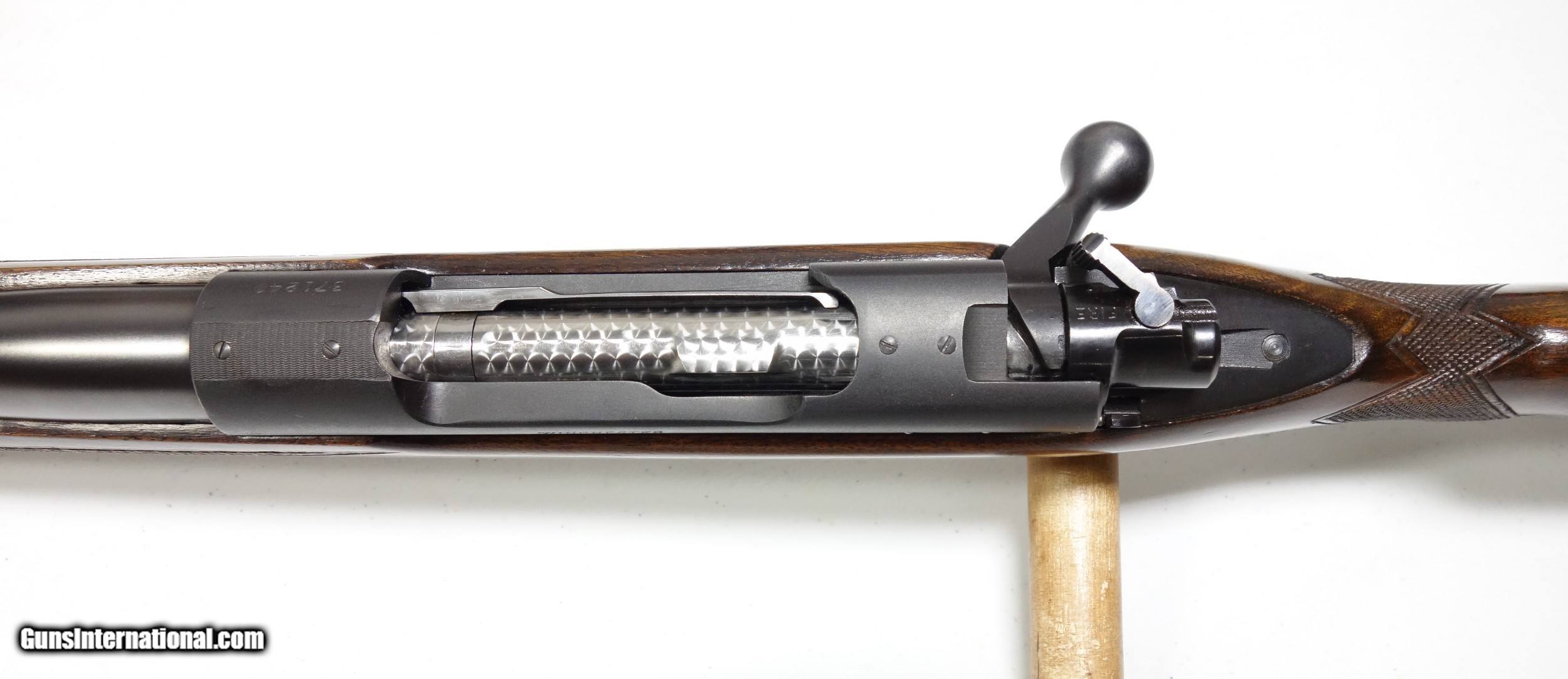 Description: Scarce Pre 64 Winchester Model 70 Super Grade in 300 H&H caliber. S/N 371*** with matching scribed bolt made in 1956. Excellent original condition showing 98% Blue, 97% Varnish. All of the correct SG components and markings unique to a mid-1950s rifle are present including SUPER GRADE stamps on the underside of the barrel and on the floorplate, backwards "S" on recoil lug, beautiful rust blued barrel, "jeweled" action components, Redfield 255 gold bead front sight, genuine SG swivels, etc. The leather sling is also included. The bore and mechanical functions of this rifle are excellent. The chamber has NOT been reamed out to Weatherby. A GREAT rifle in a very hard to find caliber and configuration from this production era! SOLD Curio/Relic: Yes |