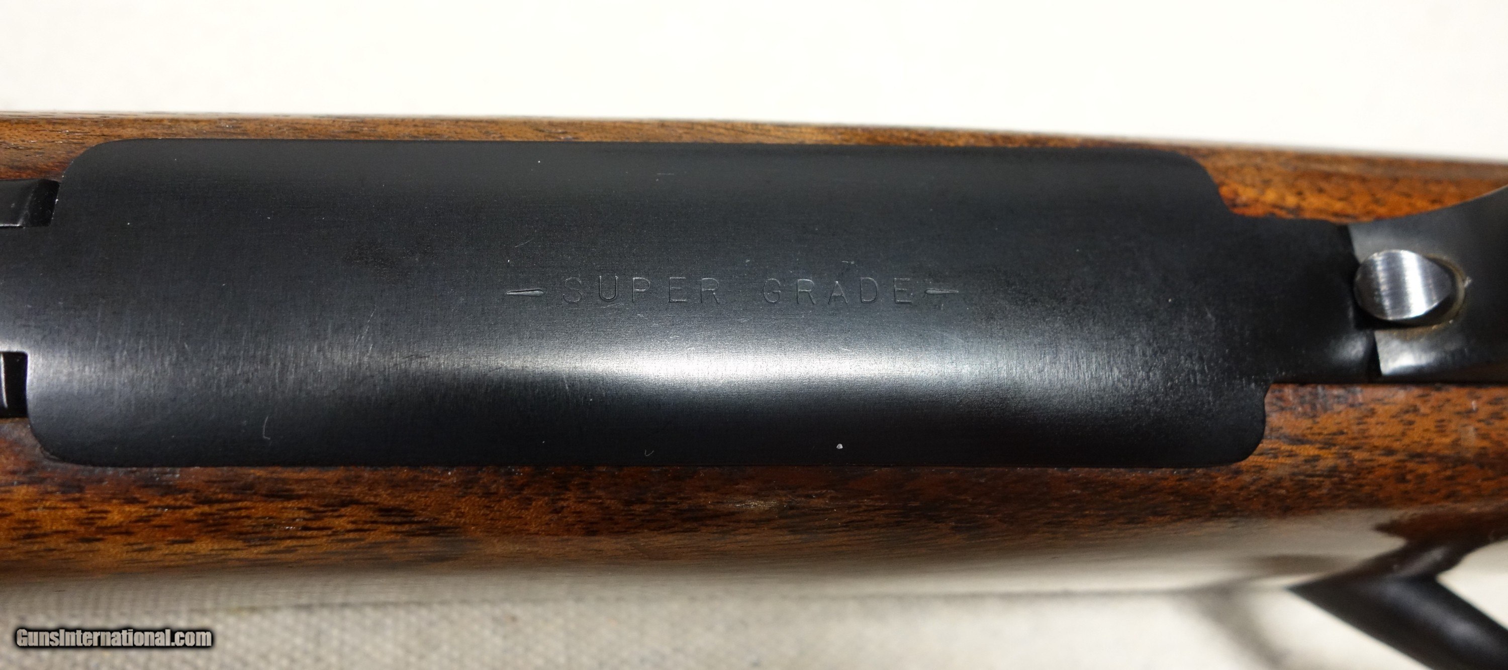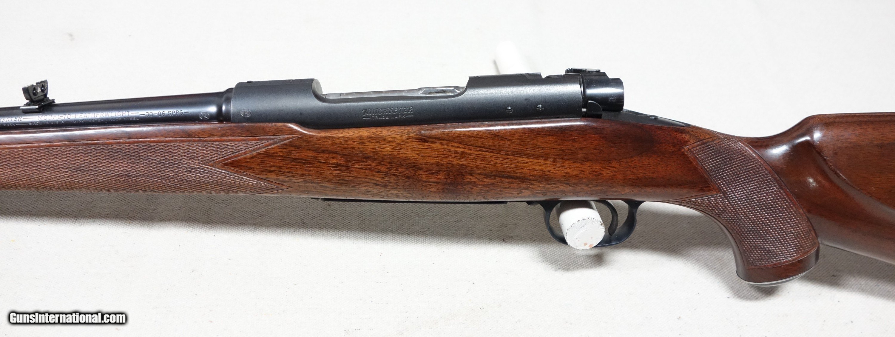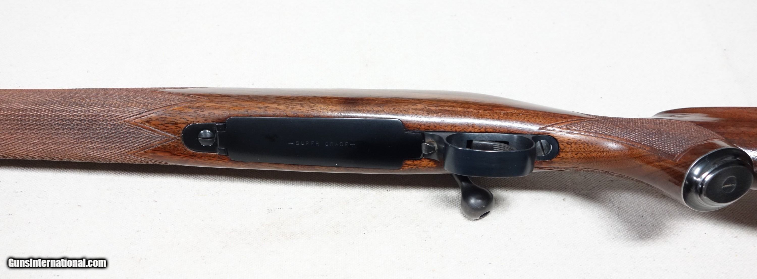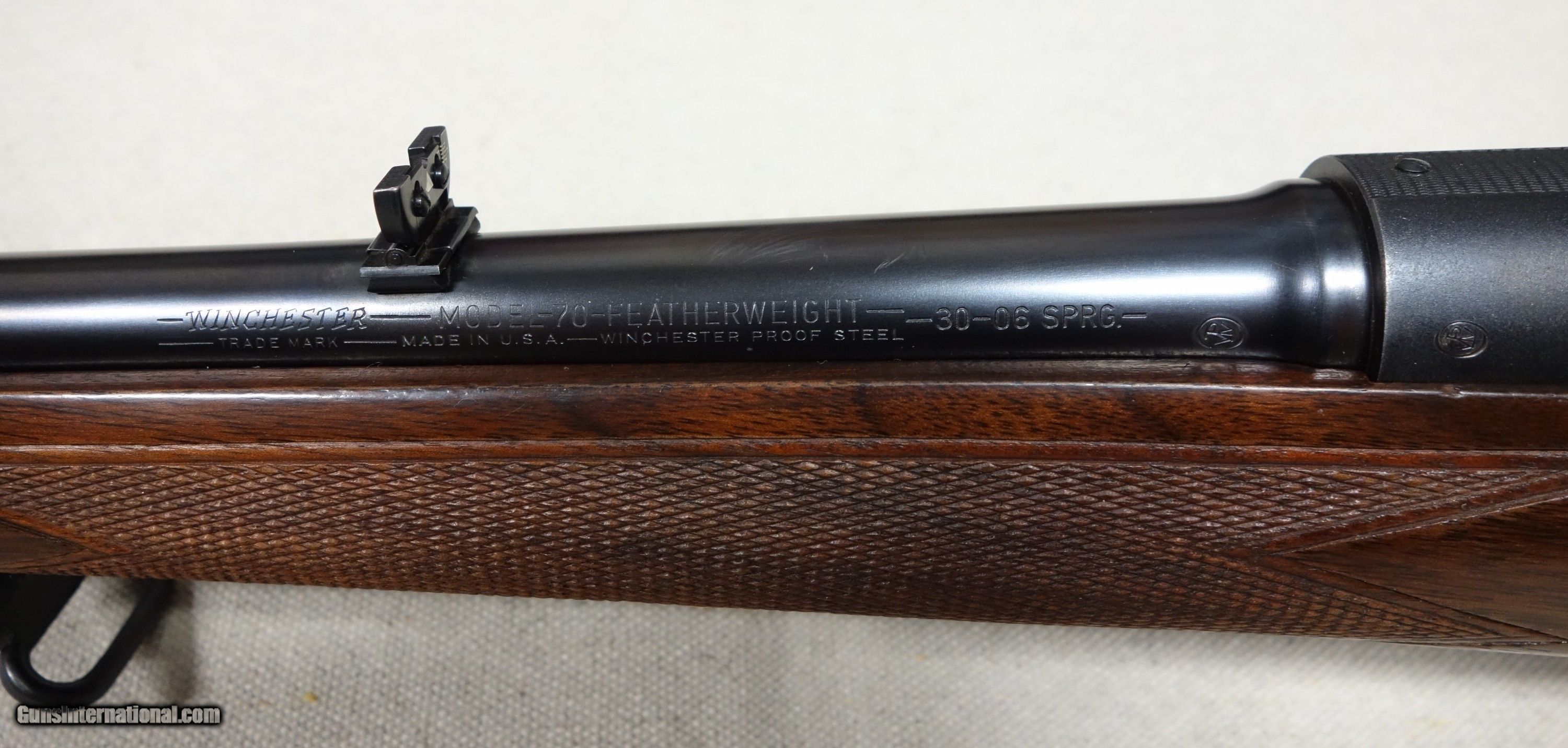 Description: Outstanding and incredibly rare Model 70 Super Grade FEATHERWEIGHT in 30-06 Caliber! S/N 374346 with a matching scribed bolt made in 1956. This is the absolute rarest style of ANY Model 70 ever produced, with only 930 made in the 4 cataloged calibers. This one is in 30-06 caliber which accounted for only 321 of that total, and would have to be considered among the finest of the few. This amazing rifle has all the right "stuff" and is guaranteed to be of 100% genuine components in every regard. Showing 98% original finishes throughout, with a few scattered scuffs on the barrel. The aluminum floorplate, trigger guard, and buttplate remain in nearly perfect condition. Correct and original SUPER grade underbarrel stampings, 22" factory rust blued barrel, jeweled action components, Redfield 255 front sight, proper detachable swivels, etc. Excellent bore and mechanical functions of course. A truly fantastic rifle worthy of any advanced Model 70 collection! Please add $100 for expedited and fully insured shipping from Alaska in a custom cut, foam lined box. SOLD Curio/Relic: Yes |