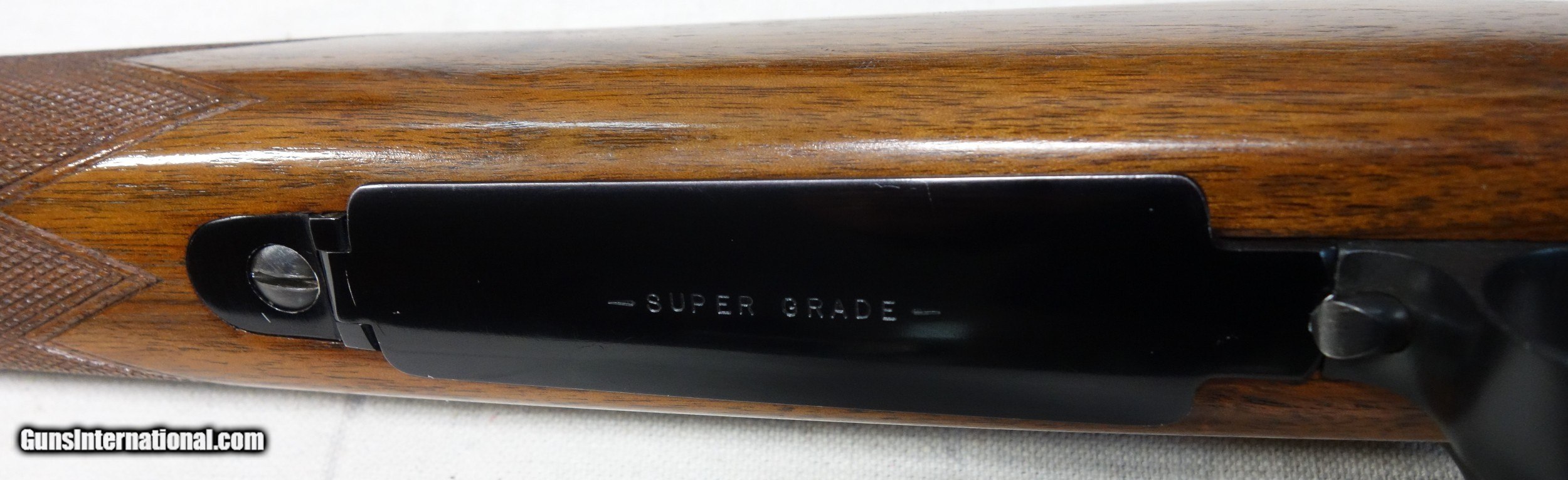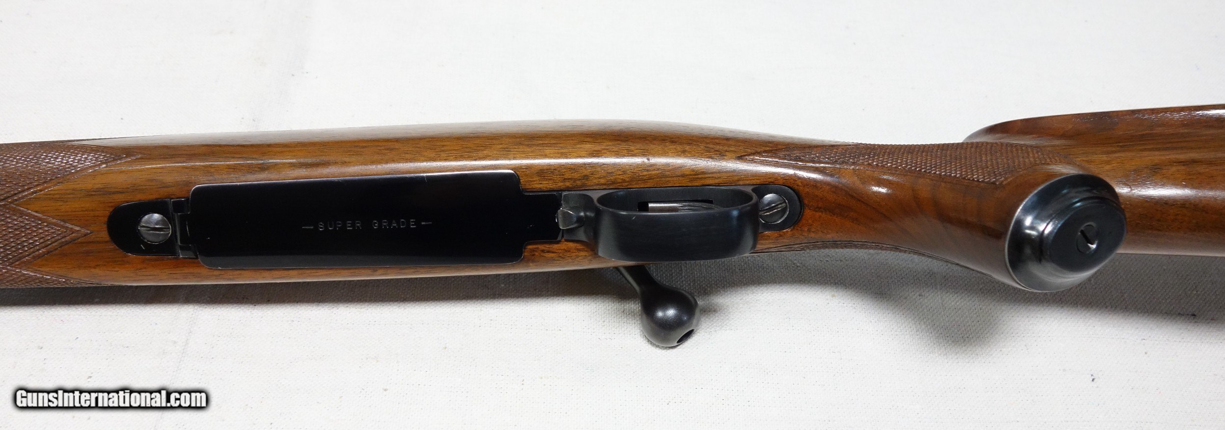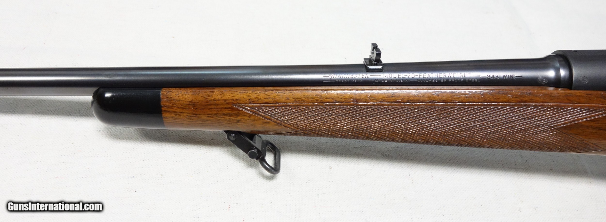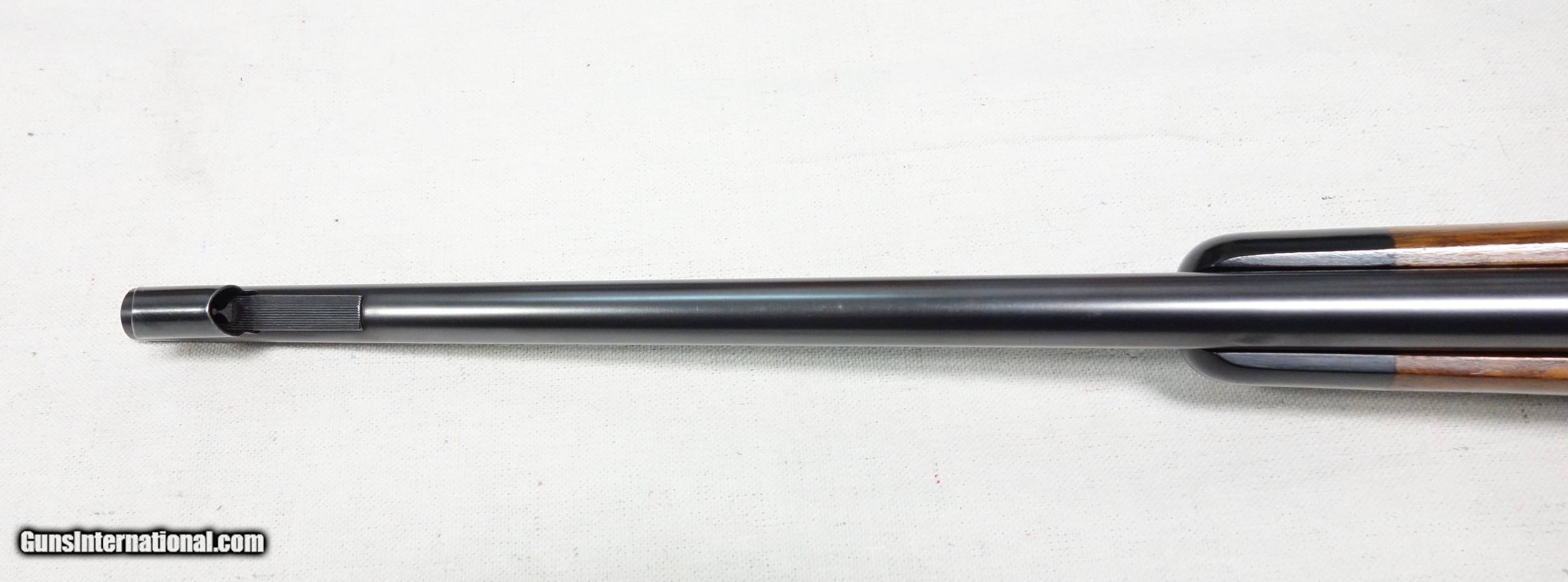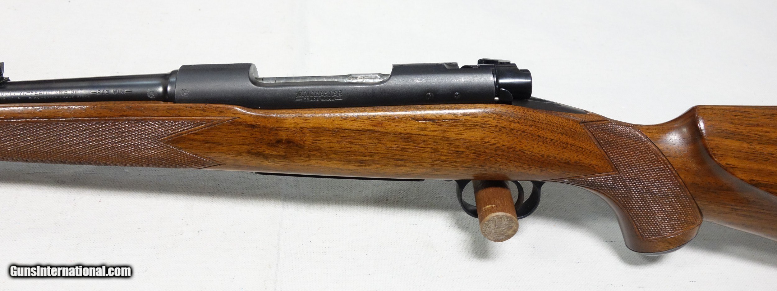 Description: Superb and incredibly rare Model 70 Super Grade FEATHERWEIGHT in 243 Caliber. This is the rarest configuration of ANY Model 70. Of the 4 calibers catalogued, only 260 were ever made in 243. This amazing rifle has all the right "stuff" and is guaranteed to be 100% genuine in every regard. These are seldom faked anyway, due to the difficulty of replicating their numerous unique features, and are always easily spotted by the expert's eye if an attempt is made. S/N 424*** with matching scribed bolt made in 1957. 98% original condition throughout, including the fragile aluminum components of floor plate and butt plate. Correct and original underside stampings, rust blued barrel, jeweled action components, Redfield 255 front sight, etc. A fabulous find worthy of any advanced Model 70 collection! SOLD Curio/Relic: Yes |