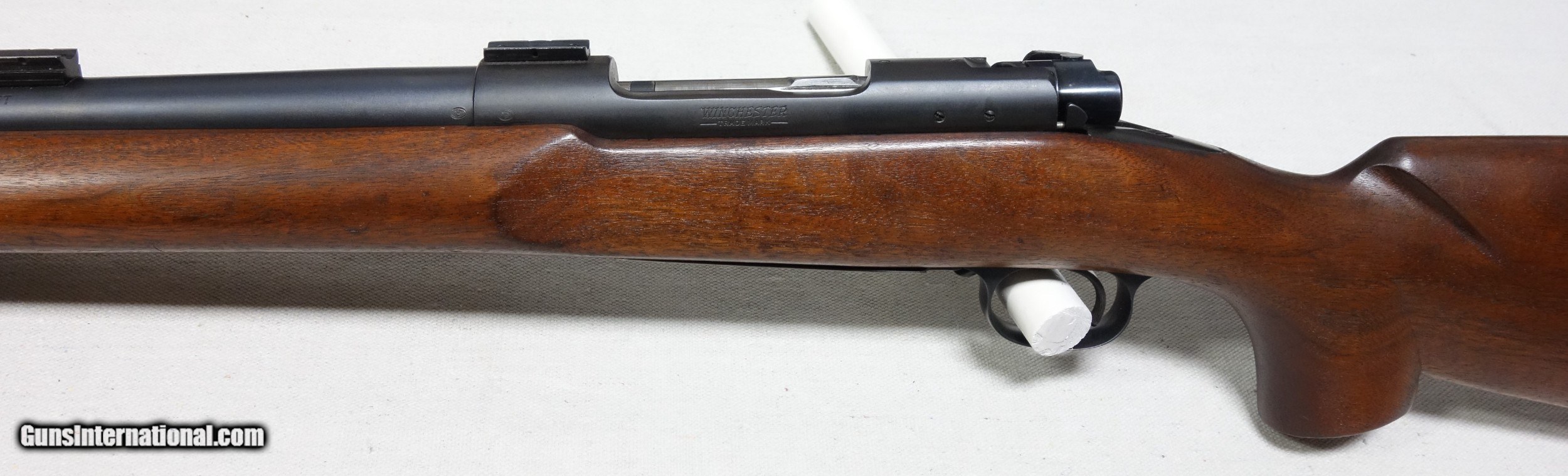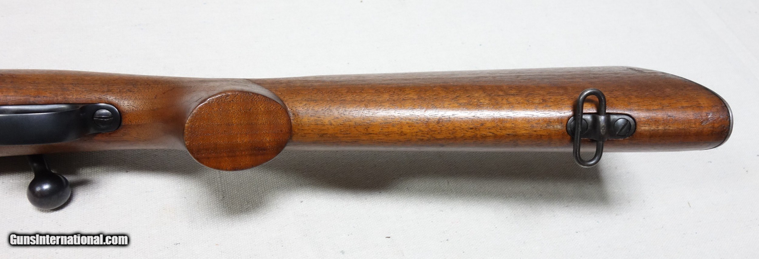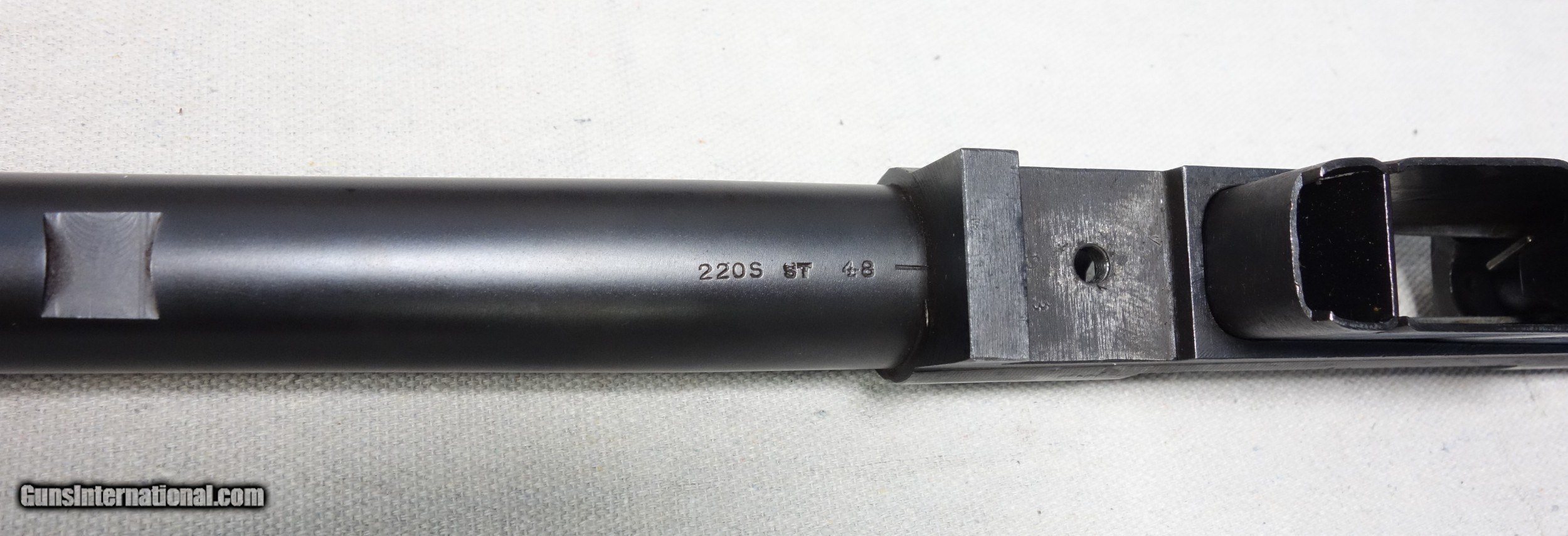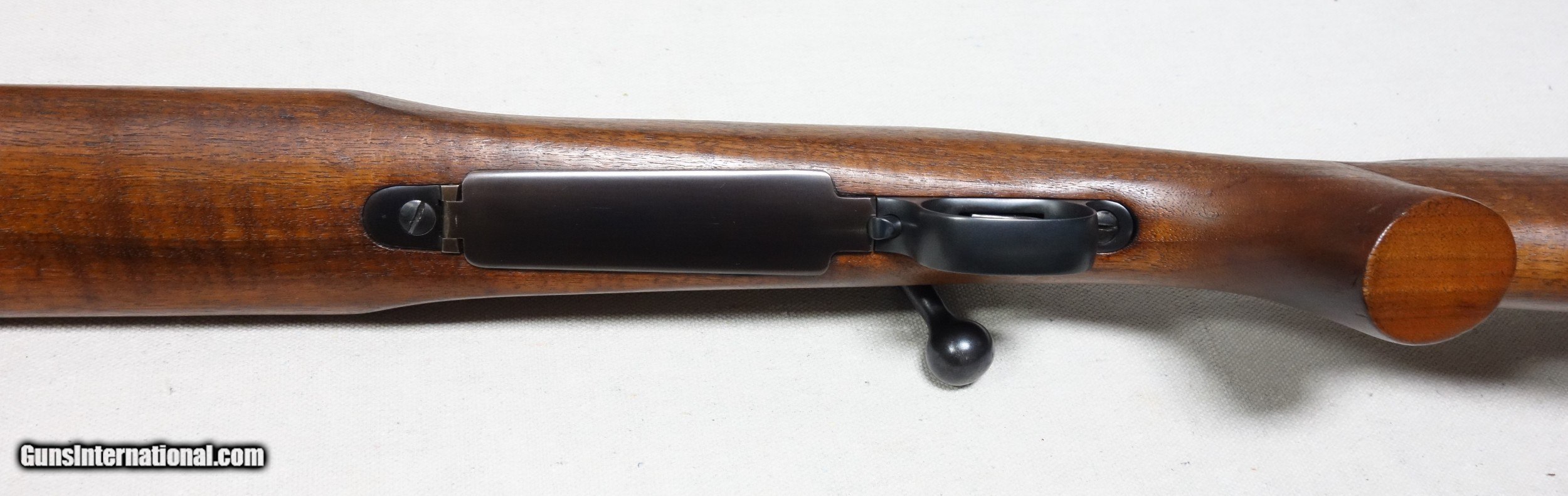 Description: *SOLD* Very clean Target style Model 70 in 220 Swift caliber. S/N 89*** with matching scribed bolt. This is a "transition" era rifle sharing both pre and post war characteristics of a 1948 S/N and underbarrel stamp, a pre war "clover leaf" shaped tang, the unique to this era "clam shell" or "rabbit's foot" safety lever, yet a straight tapered Type III receiver tang, surely one of the very first rifles to incorporate this minor tang shape change which would sustain throughout the remainder of production. This rifle is in nice condition showing 96% original finishes and clean internals. The bore and mechanical functions are very good. The barrel is 26" stainless steel with muzzle face left in the white as were all matte finished stainless barrels to avoid "shooting off" the film of blued iron oxide they were treated with. Expedited and fully insured shipping from Alaska to your FFL is an additional $100. SOLD Curio/Relic: Yes |