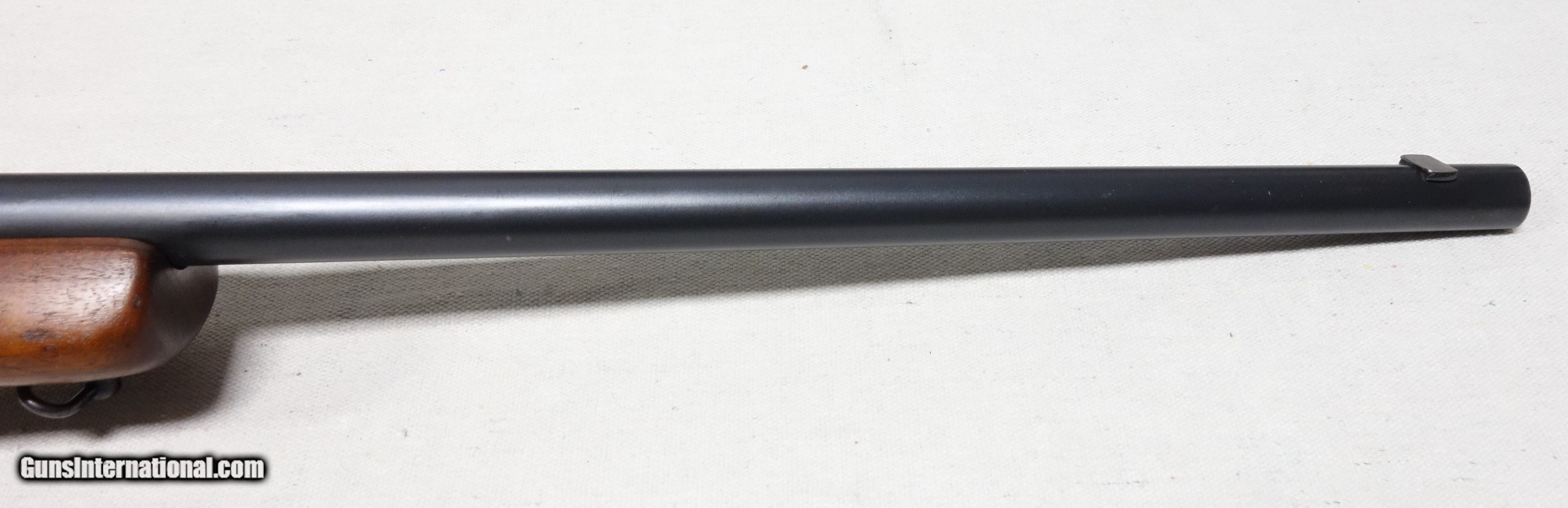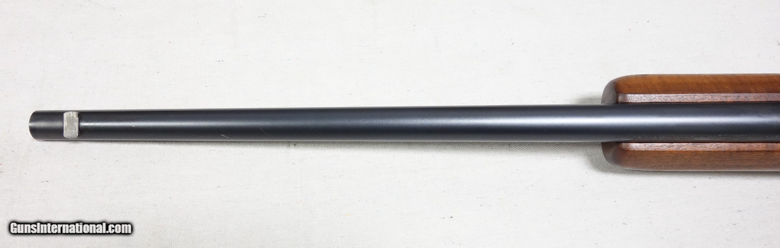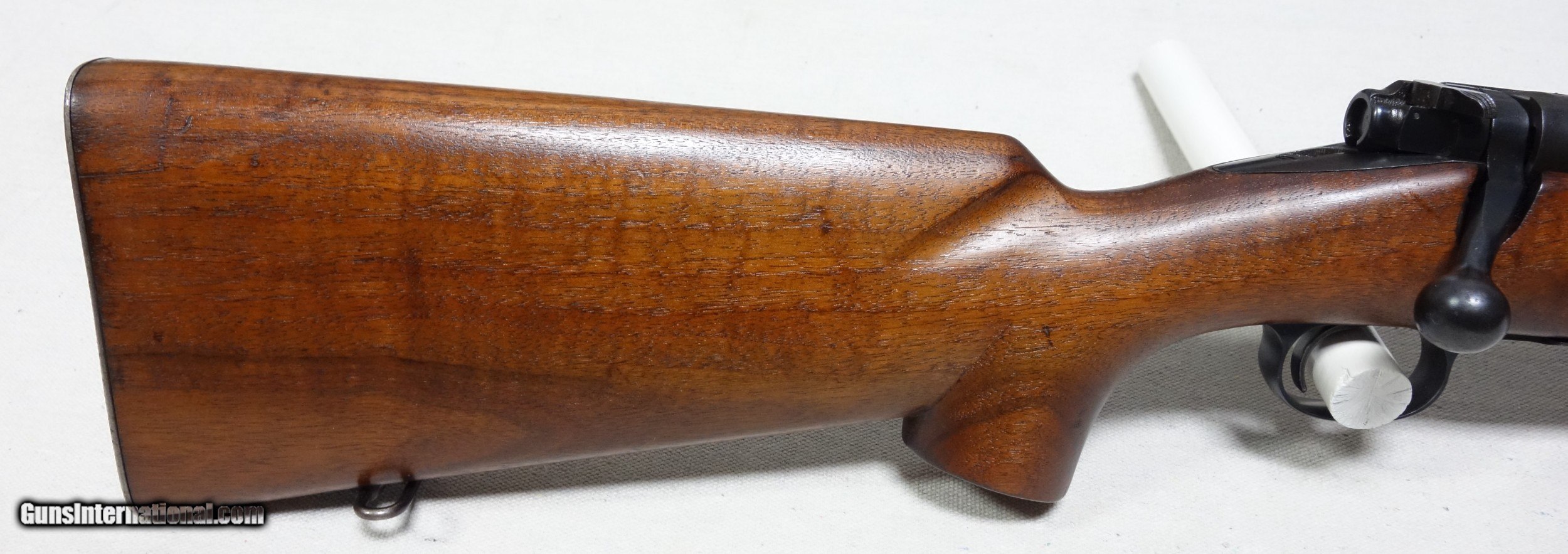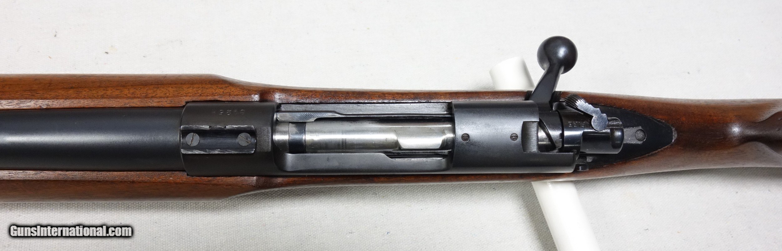 Description: *SOLD* Very clean Target style Model 70 in 220 Swift caliber. S/N 89*** with matching scribed bolt. This is a "transition" era rifle sharing both pre and post war characteristics of a 1948 S/N and underbarrel stamp, a pre war "clover leaf" shaped tang, the unique to this era "clam shell" or "rabbit's foot" safety lever, yet a straight tapered Type III receiver tang, surely one of the very first rifles to incorporate this minor tang shape change which would sustain throughout the remainder of production. This rifle is in nice condition showing 96% original finishes and clean internals. The bore and mechanical functions are very good. The barrel is 26" stainless steel with muzzle face left in the white as were all matte finished stainless barrels to avoid "shooting off" the film of blued iron oxide they were treated with. Expedited and fully insured shipping from Alaska to your FFL is an additional $100. SOLD Curio/Relic: Yes |