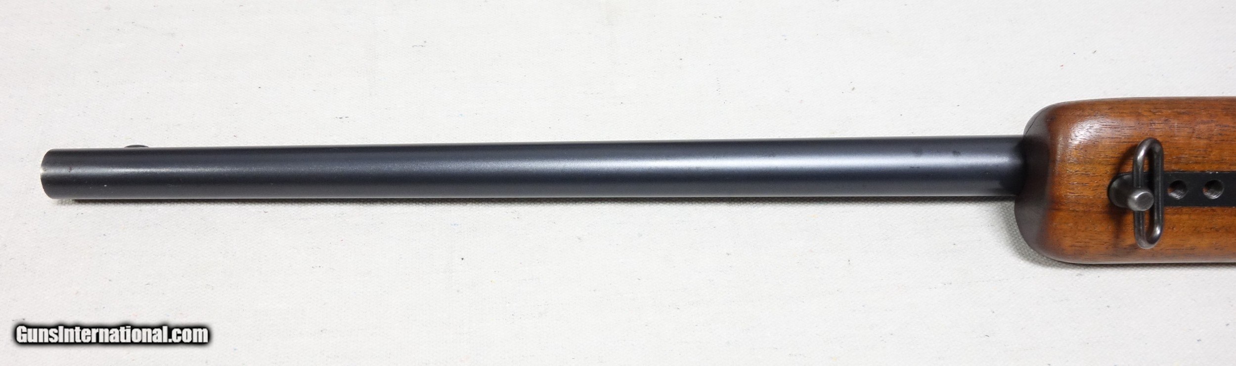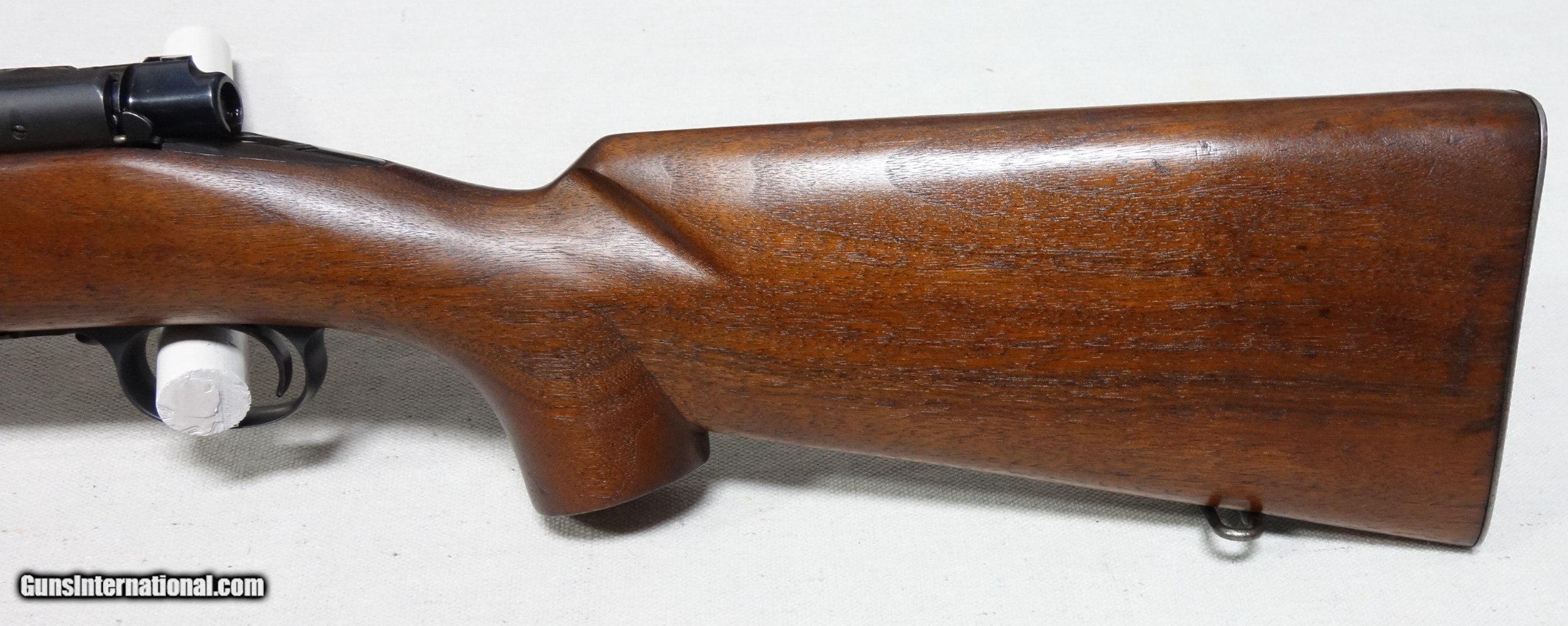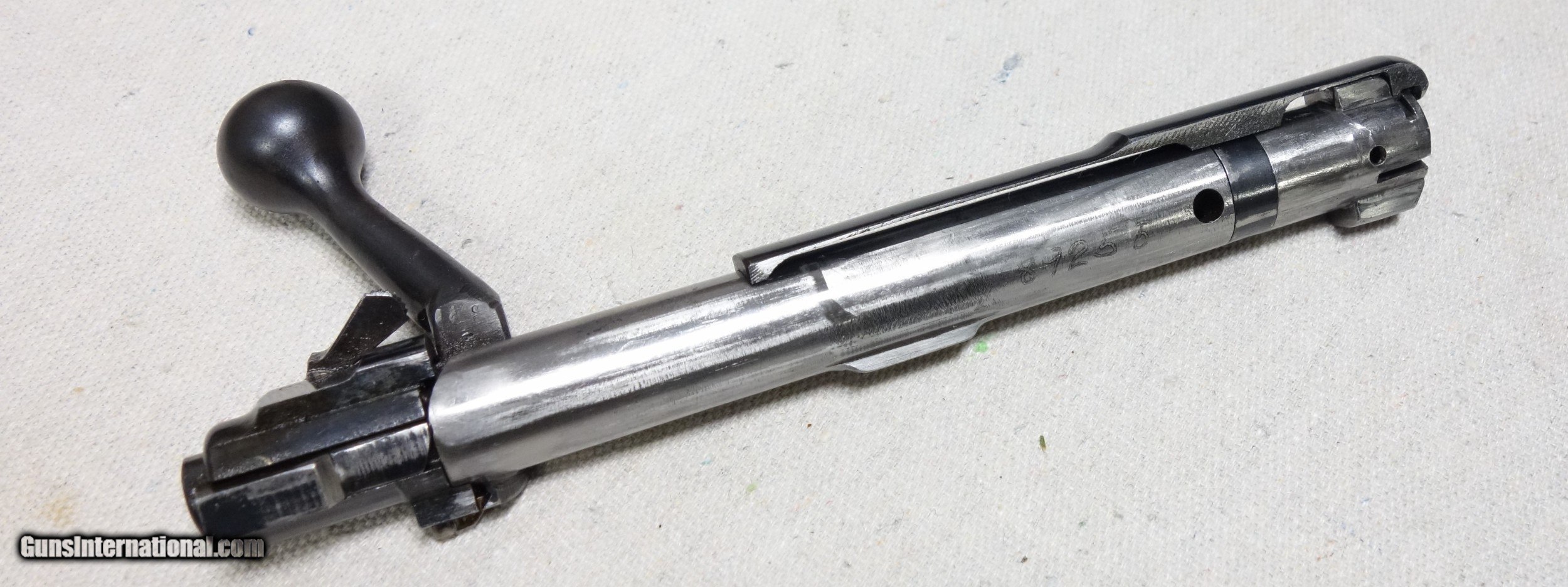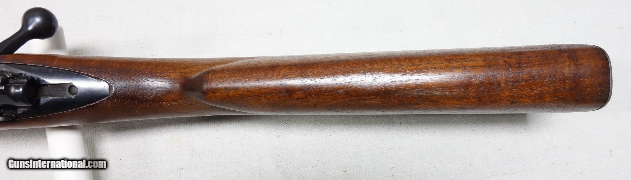 Description: *SOLD* Very clean Target style Model 70 in 220 Swift caliber. S/N 89*** with matching scribed bolt. This is a "transition" era rifle sharing both pre and post war characteristics of a 1948 S/N and underbarrel stamp, a pre war "clover leaf" shaped tang, the unique to this era "clam shell" or "rabbit's foot" safety lever, yet a straight tapered Type III receiver tang, surely one of the very first rifles to incorporate this minor tang shape change which would sustain throughout the remainder of production. This rifle is in nice condition showing 96% original finishes and clean internals. The bore and mechanical functions are very good. The barrel is 26" stainless steel with muzzle face left in the white as were all matte finished stainless barrels to avoid "shooting off" the film of blued iron oxide they were treated with. Expedited and fully insured shipping from Alaska to your FFL is an additional $100. SOLD Curio/Relic: Yes |