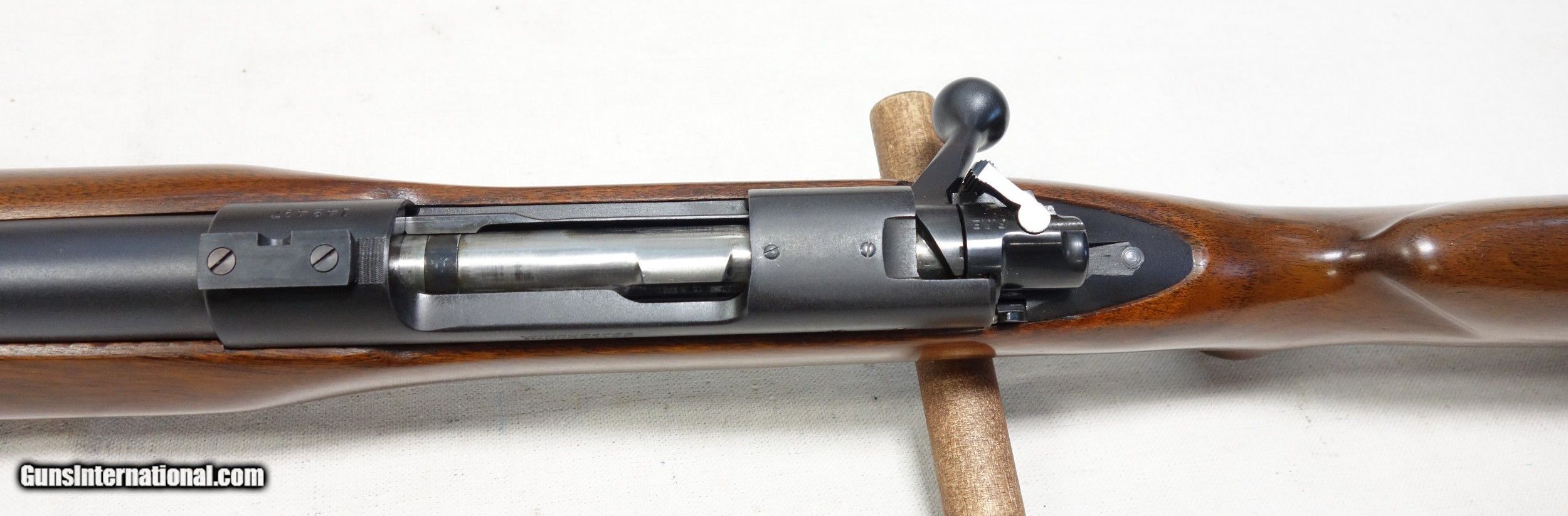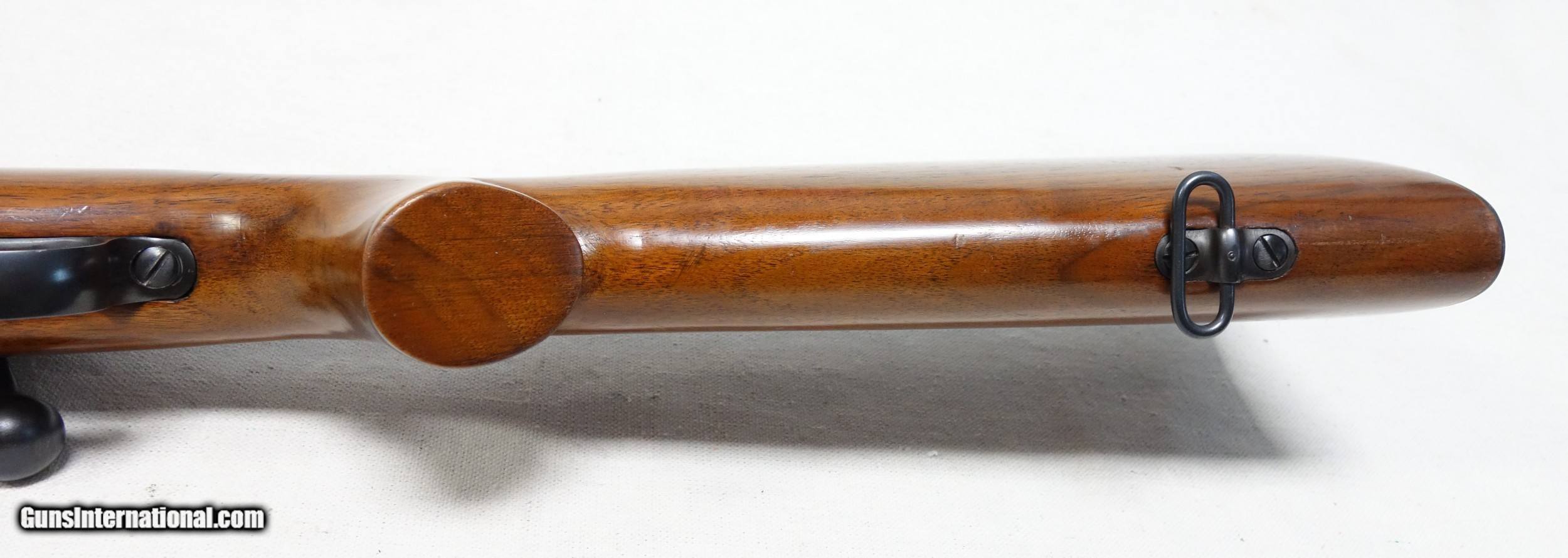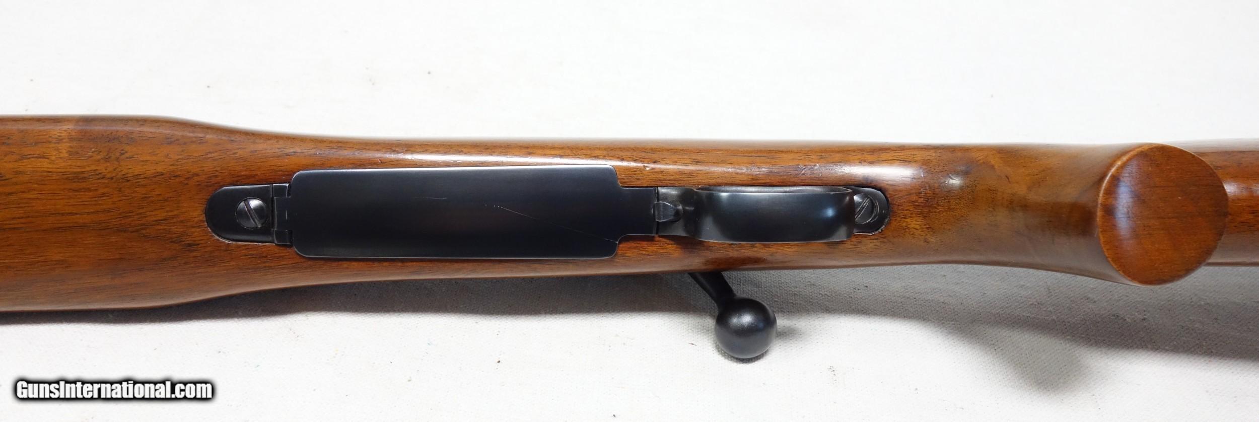 Description: Outstanding Model 70 Target rifle in scarce .220 Swift caliber. S/N 142*** with matching scribed bolt made in 1950. 98-99% original Blue, 97-98% Varnish with some scattered minor marks. Excellent bore, throat and mechanical function. Factory drilled on receiver and barrel for standard Winchester target scope blocks which are included. Front sight dovetail has original Lyman 12S filler plug. 26" Stainless Steel Barrel, correctly iron oxide coated and blued with muzzle face left in the white. A very clean Swift Target! Shipping from Alaska is $75 via Priority Mail with full insurance in a custom cut foam lined box for maximum protection. Credit card users please add 3%. SOLD Curio/Relic: Yes |