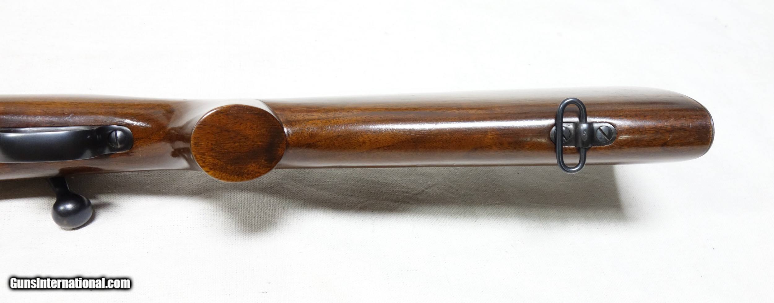 Description: Incredible Model 70 Target rifle in scarce .220 Swift caliber. S/N 241*** with matching scribed bolt made in 1953. Somehow the original bolt hang tag has also survived all of these years! 99-100% original Blue, 98% Varnish with a few minor marks. Excellent bore, throat and mechanical function. Factory drilled on receiver and barrel for standard Winchester target scope blocks which are included. Front and rear sight dovetail have original Lyman 12SS and 12S filler plugs. 26" Stainless Steel Barrel, correctly iron oxide coated and blued with muzzle face left in the white. Would be very hard to find one any nicer than this! Shipping from Alaska is $75 via Priority Mail with full insurance in a custom cut foam lined box for maximum protection. Credit card users please add 3%. SOLD Curio/Relic: Yes |