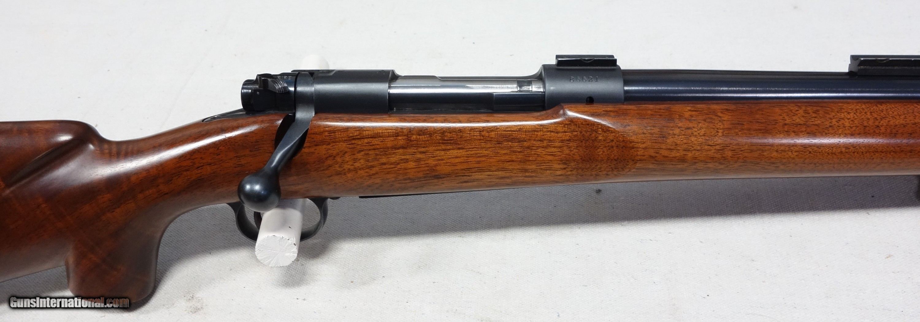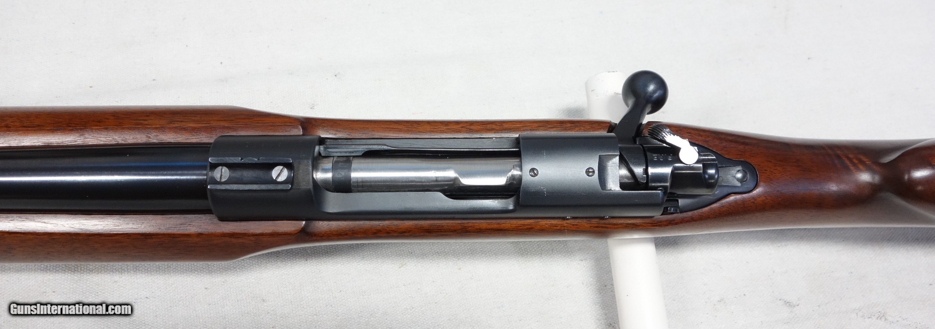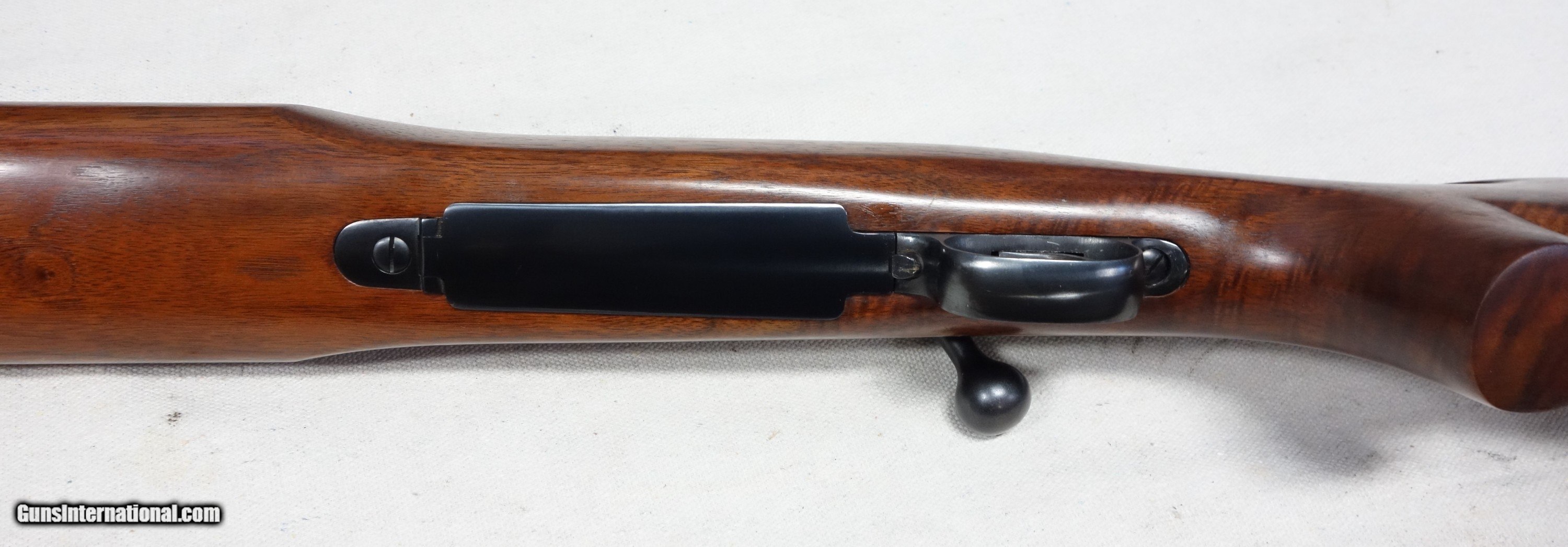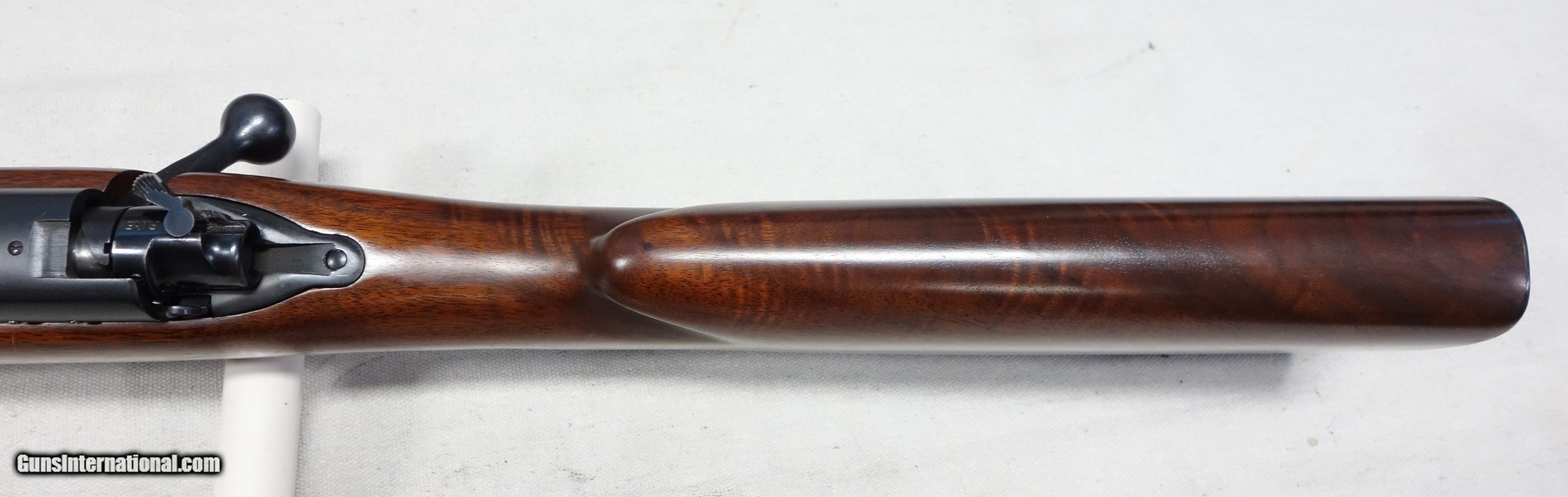 Description: ***SOLD*** Among the very finest looking Winchester Model 70 Target styles I have had or seen! In addition to its supreme 99% nearly new condition, this rifle has several unique and rare features including: Scarce "transition era" production date between Pre and Post WWII guns (made for only 3 years from 1946-48) with a clover leaf receiver tang and the special "clam shell" safety lever. This one is S/N 86621 made in 1948. Select grade walnut stock almost never seen on a target style, which has semi-fancy grain approaching 3x quality in the butt region and hardly a mark of any kind on it. Very difficult to find 270 caliber, even scarcer than a 257 Roberts caliber in this target style! T stamped trigger group. Correct factory scope blocks with dimples and crescents. 24" medium heavy barrel with a mint bore. Superb condition throughout with only a few very light scratches/scuffs on the rear of receiver, likely the result of a previously mounted Lyman 48 WH receiver sight. Mechanical functions are all working smoothly and properly. A beautiful piece for your collection which would be nearly impossible to improve upon. Please add $100 for expedited and fully insured shipping from Alaska to your receiving FFL dealer. SOLD Curio/Relic: Yes |