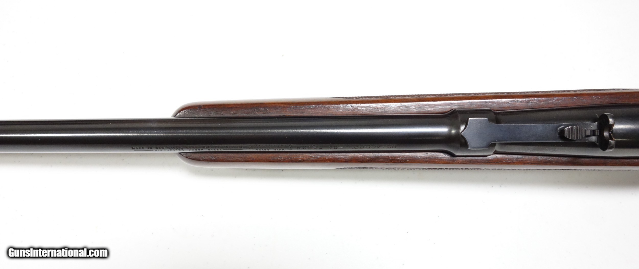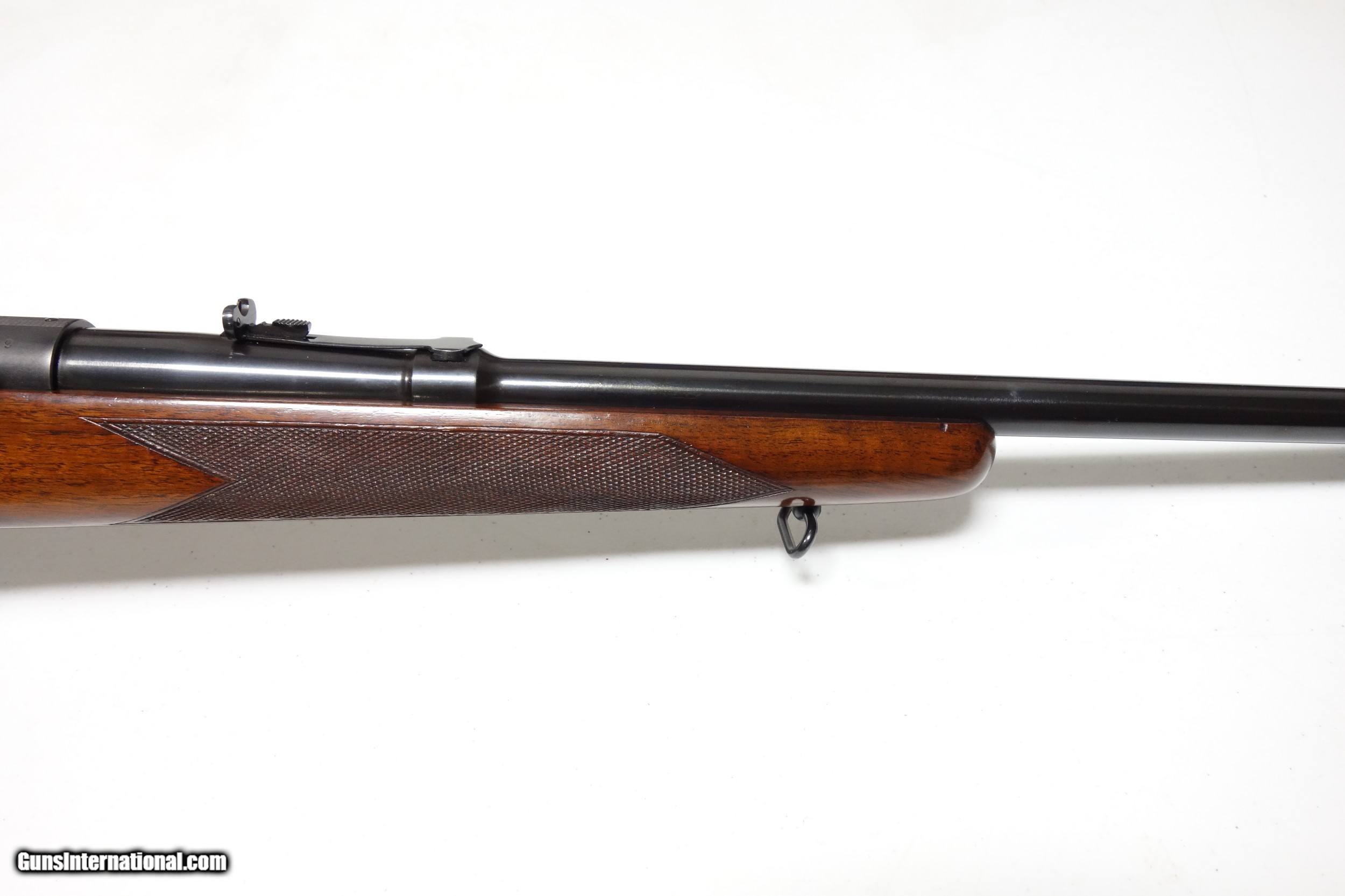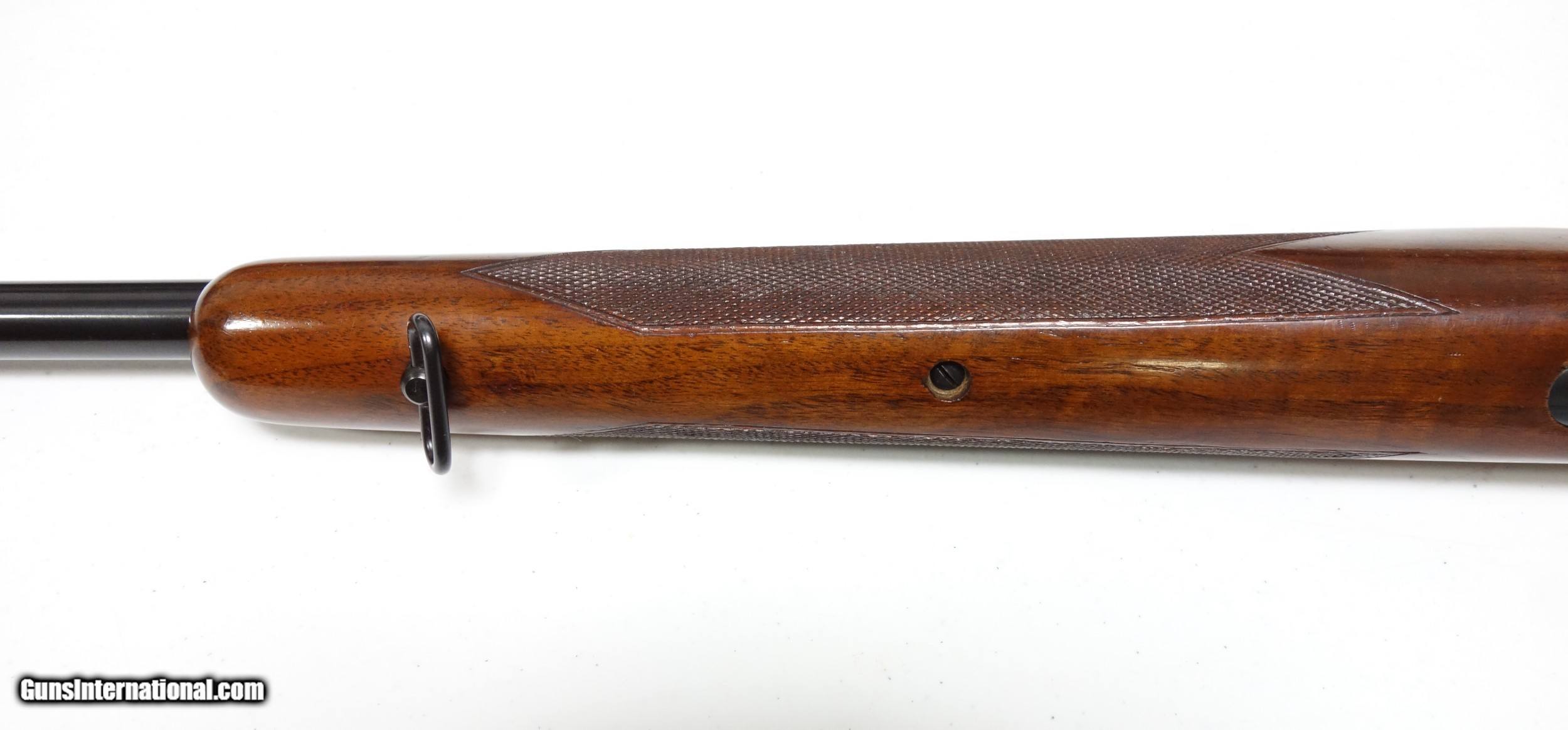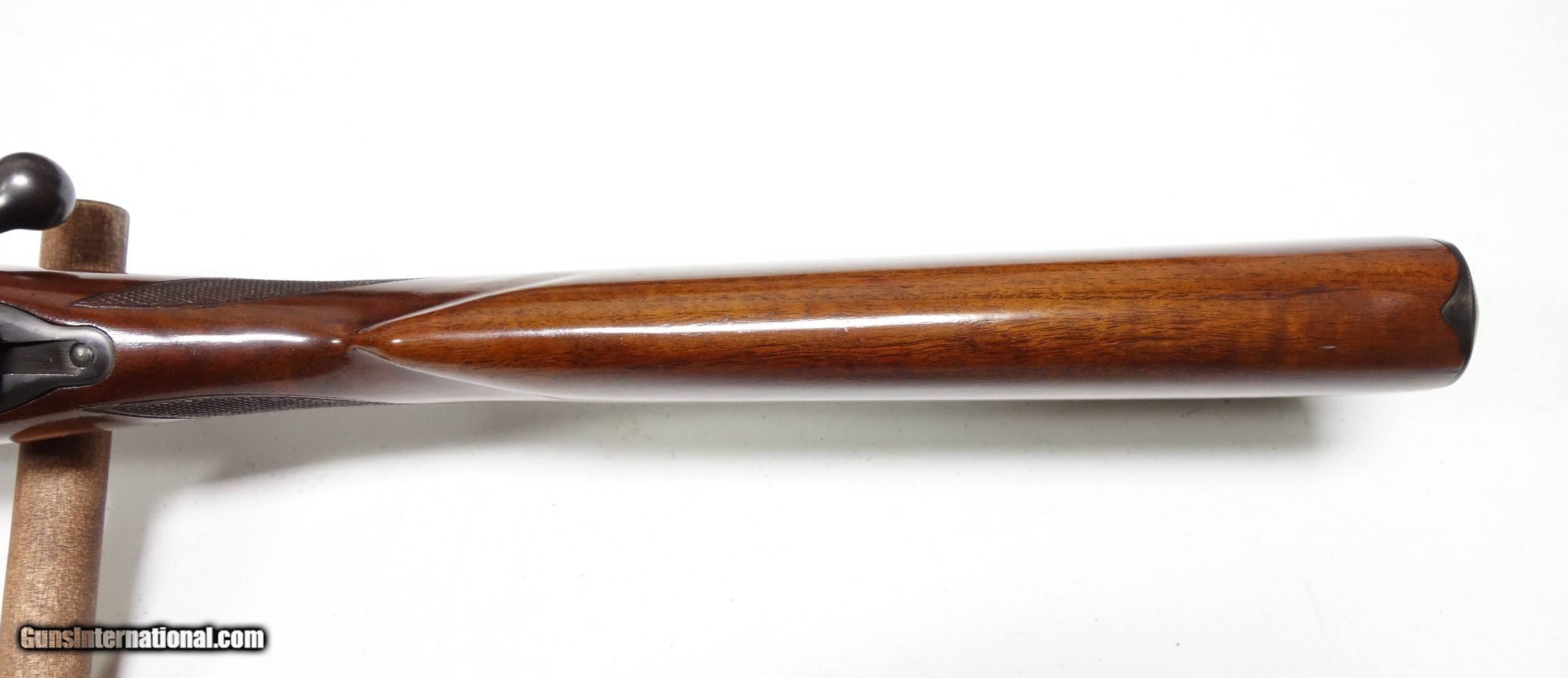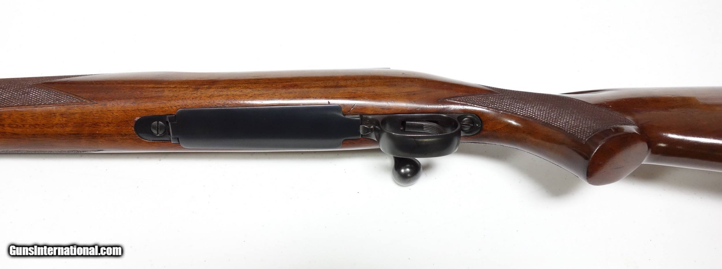 Description: Weeks of non payment forces relist...Outstanding example of a scarce transition era Winchester 70 in favorite 30-06 caliber. S/n 76*** with matching scribed bolt made in 1947. Excellent 98% condition throughout with a few light marks. 24" Barrel. Mechanics and bore are excellent. Has the unique pre war type clover leaf tang and the "clam shell" aka "rabbit's foot" safety used only during this short production period. A beautiful and hard to come by rifle in this shape. SOLD Curio/Relic: Yes |