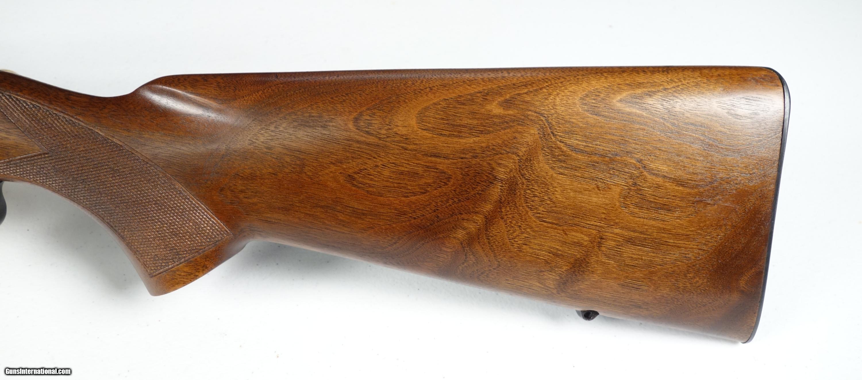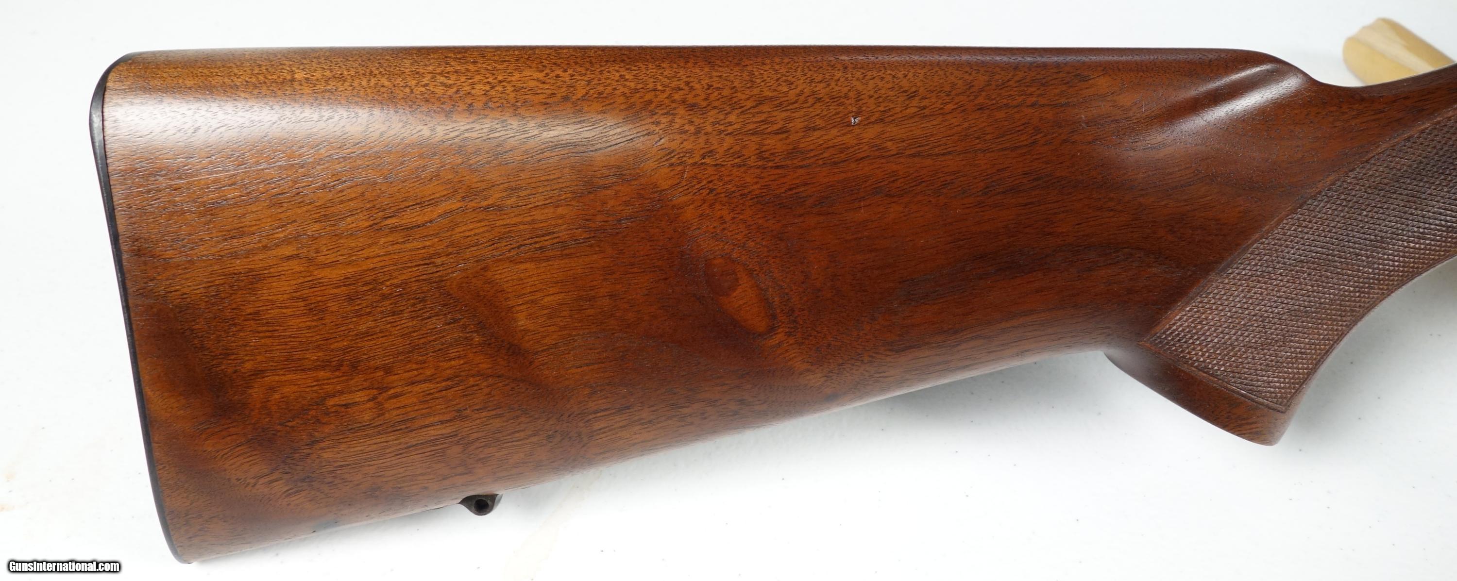 Description: 1948 transition style Winchester Model 70 30-06. 24" Barrel. This rifle is in excellent condition inside and out but with a few collector type discrepancies. Blue is original at 97% with nicely refinished wood in equally great shape. The stock has factory Super Grade 70 swivel studs installed, which were added post production. There is also a small inlet in the wood near rear of receiver area to make clearance for an elevation screw of a previously mounted receiver sight. These transition models were produced between 1946-48 and usually incorporate features of both pre and post WWII rifles. This one has the early clover leaf tang and clam shell safety but is correctly drilled for scope mounts on the smooth topped receiver with 2 holes each both front and back. However, there is an extra 6x48 hole in the rear receiver bridge that is not visible under this scope set-up or any other unless removed to shoot open sights. The scope is a 2-4 power Bausch & Lomb Balvar in mint condition with clear optics on a matching B&L mount. Windage and elevation adjustments are made on the bases of this slick set-up, not on the scope itself which has no turrets. The scope plunges out of the mounts for removal and back in with no loss of zero. One of the nicest looking "shooter" priced rifles you are liable to ever find. SOLD Curio/Relic: Yes |