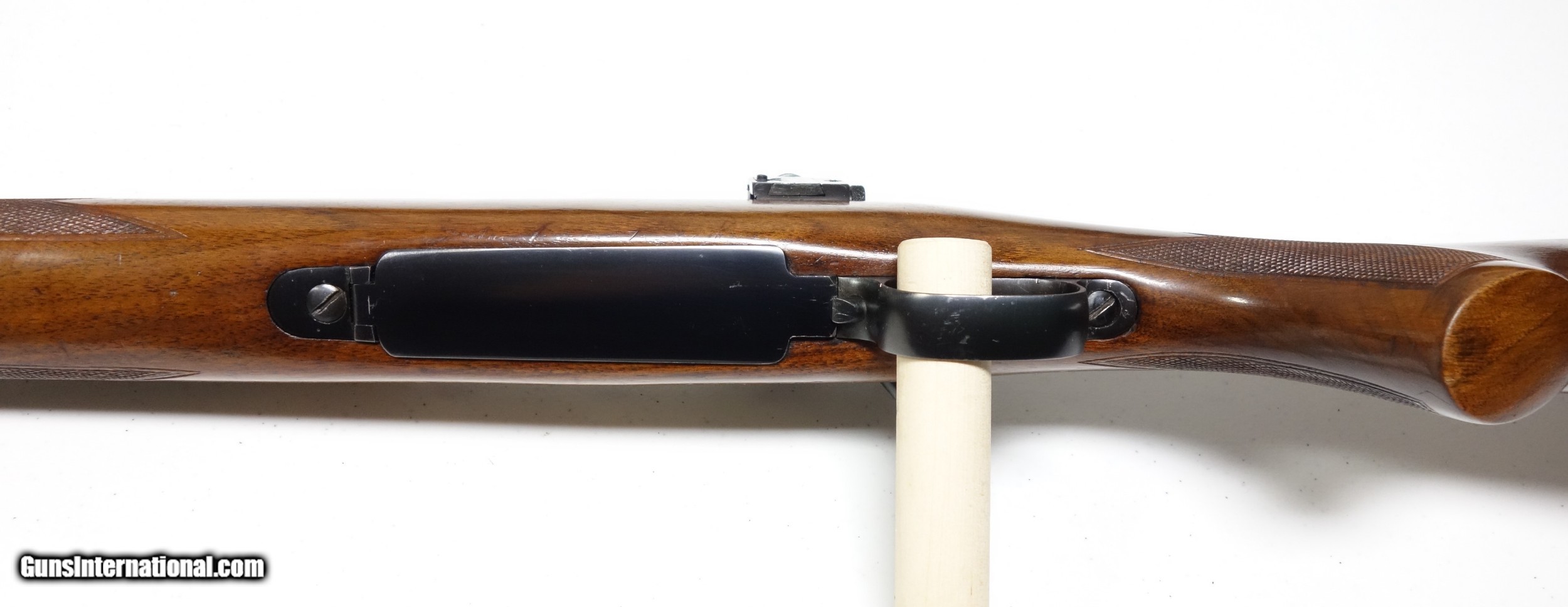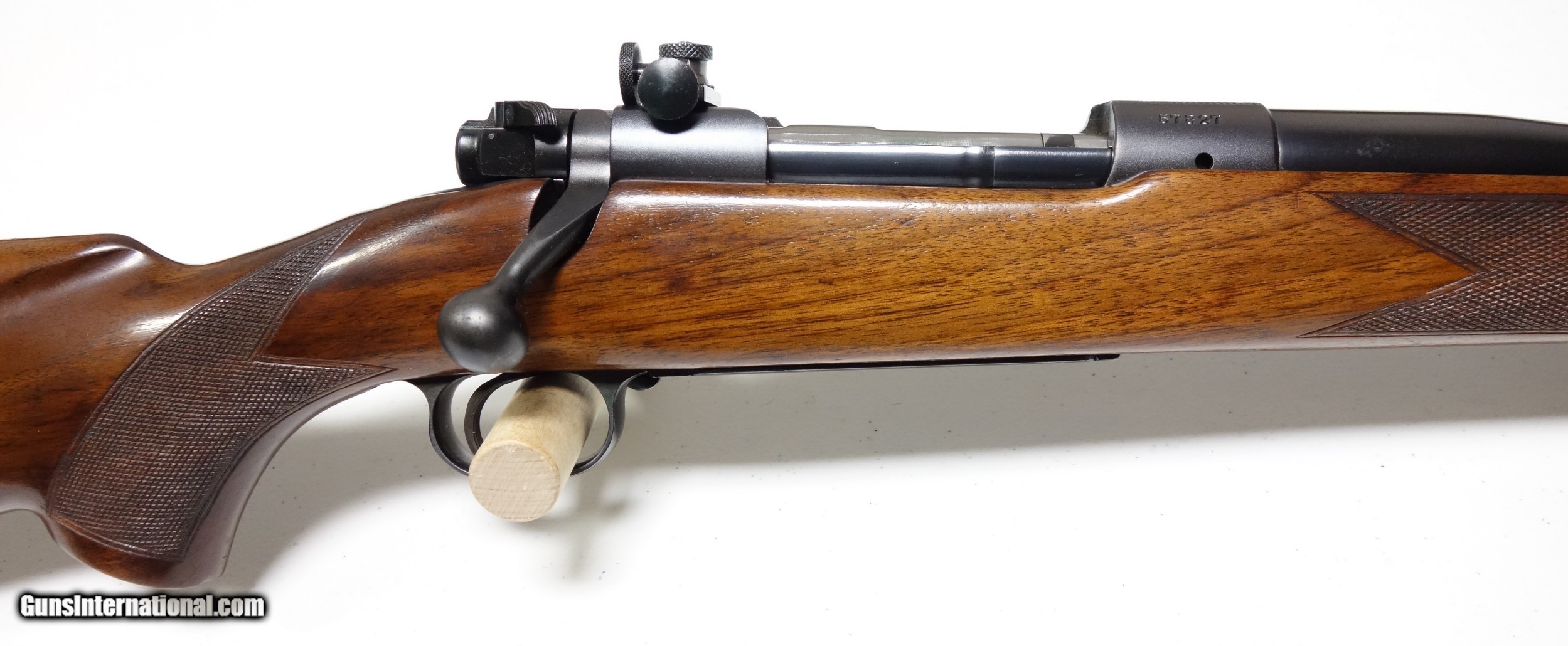 Description: Beautiful and very scarce Winchester Model 70 early "transition" rifle in .375 mag with primarily pre war features including rust blued barrel, clover leaf tang, and matted, undrilled rear bridge! S/N 57*** with matching bolt Mfg. 1946. Overall condition is Excellent with only a few slight handling marks and one notable impression/gouge in center of butt R side. 97%+ Blue, 97% Varnish. Barrel is factory drilled for standard 2 leaf rear sight with filler plugs installed. Current rear sight is a Lyman 48 WJS receiver sight which was a factory option. Pad is factory issued as on all 375s, is genuine (not a repro) and looks virtually new beyond some slight patina. This is a difficult rifle to locate in this configuration and condition, and with an undrilled rear bridge. SOLD Curio/Relic: Yes |