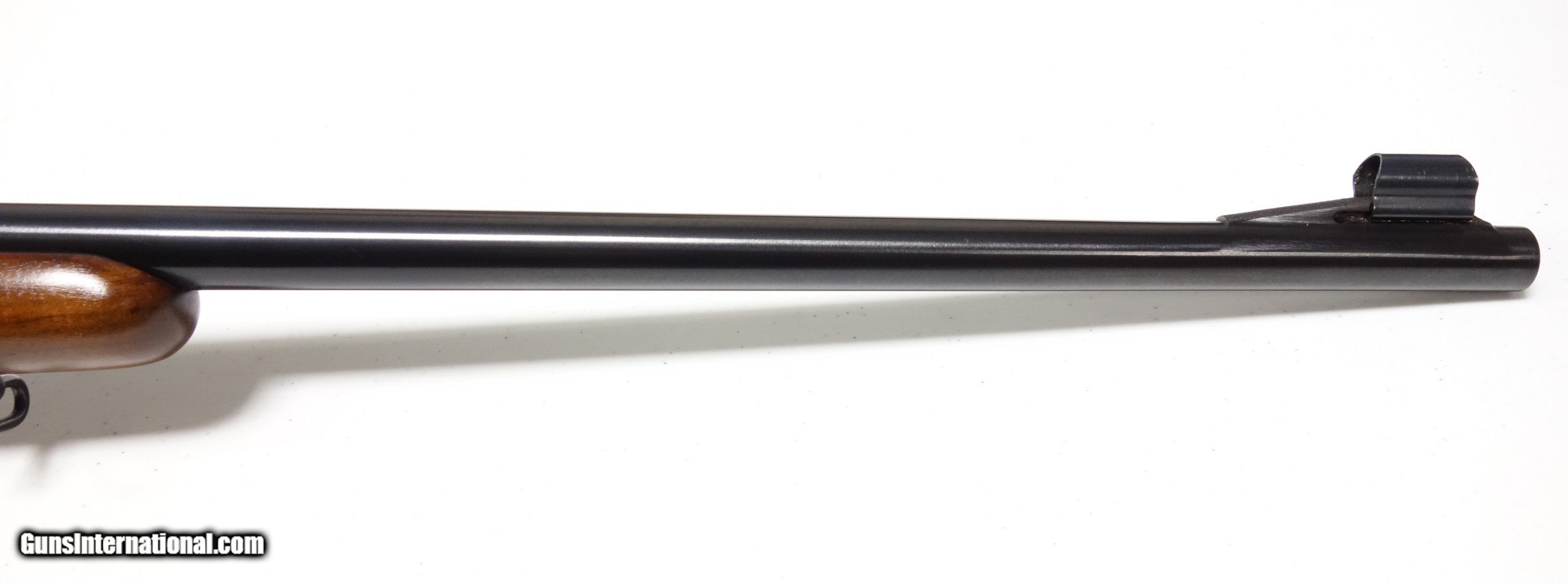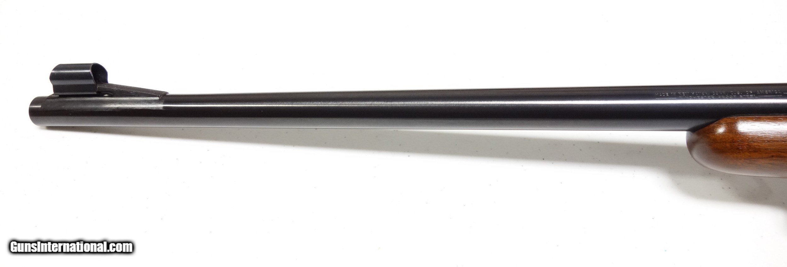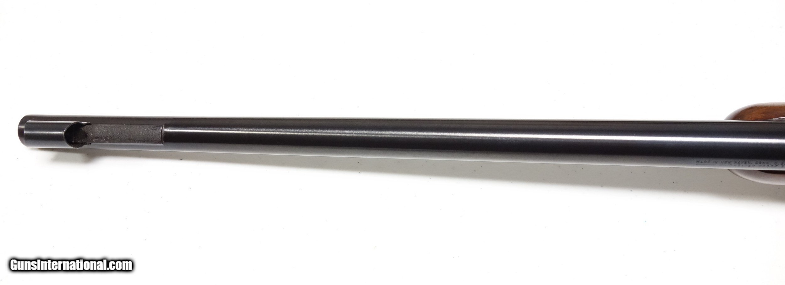 Description: Exceedingly scarce Winchester Model 70 "transition" rifle in .375 mag with smooth topped, undrilled rear bridge! S/N 78*** with matching bolt Mfg. 1948. Has the contoured 25" Barrel. Bore and mechanical function are like new. Overall condition is superb with only a few slight handling impressions in wood. 99% Blue, 99% Varnish. Pad is factory issued as on all 375s, is genuine (not a repro) and looks virtually new beyond some slight patina. This is an extremely hard rifle to locate in this configuration and condition, and with an undrilled rear bridge. Likely the best example you will ever see. SOLD Curio/Relic: Yes |