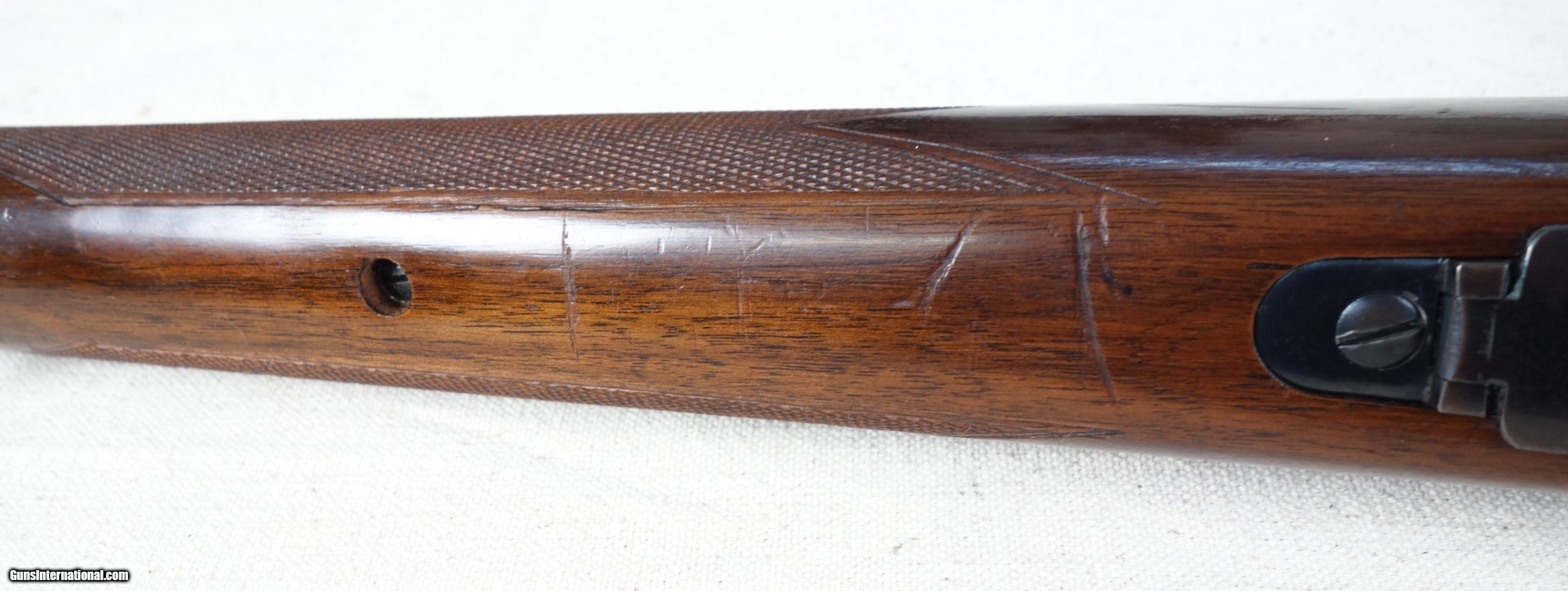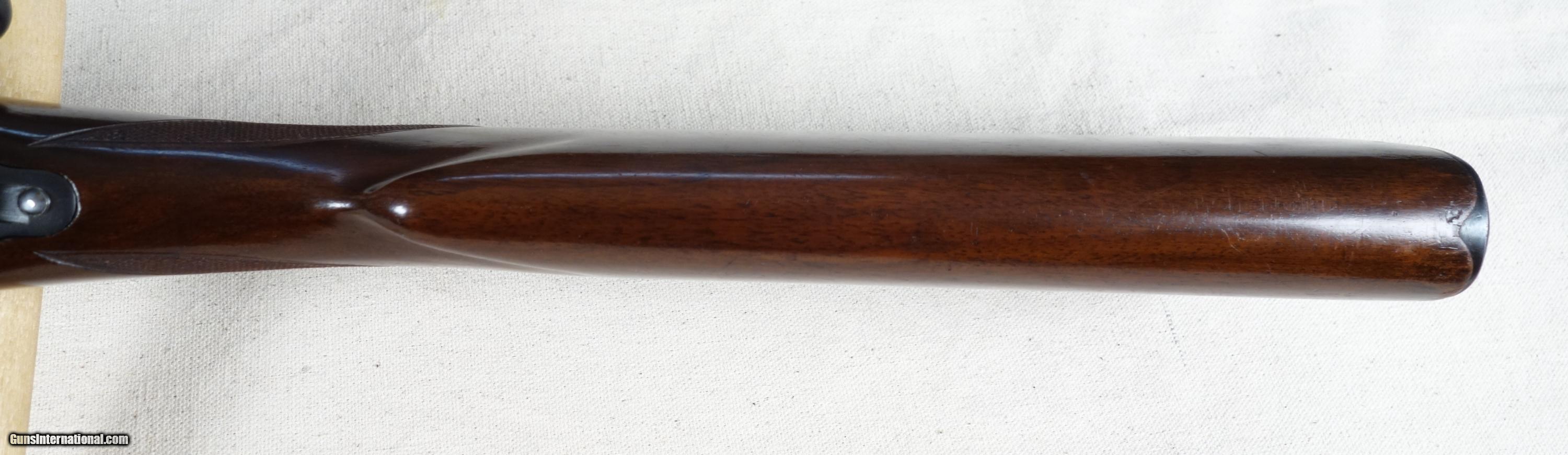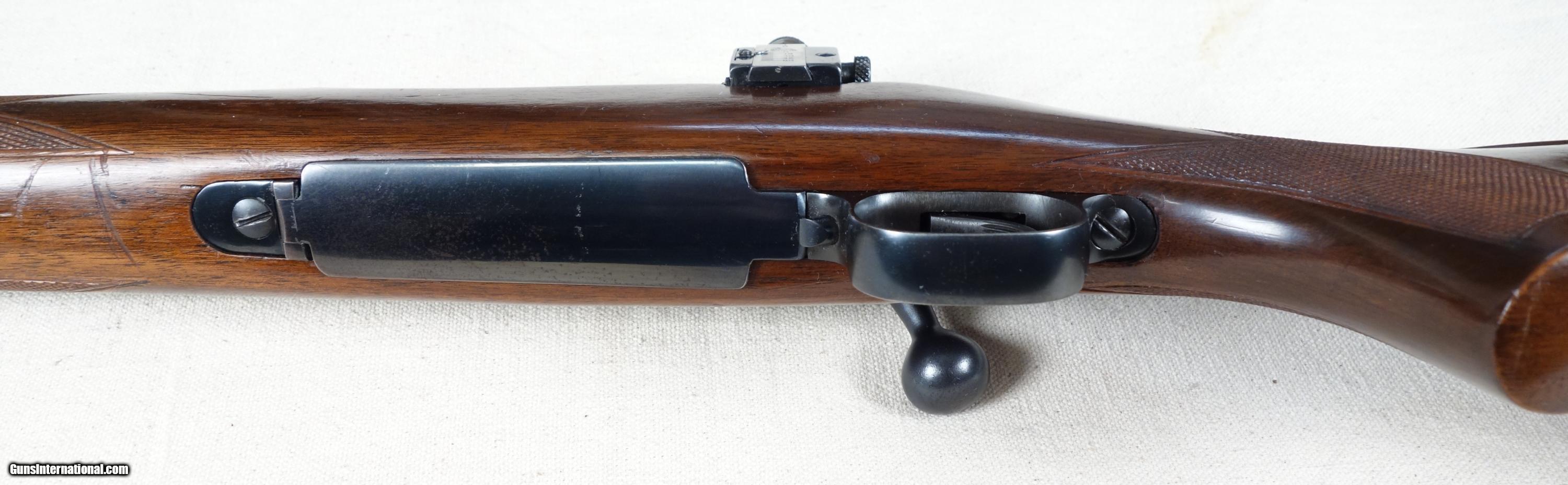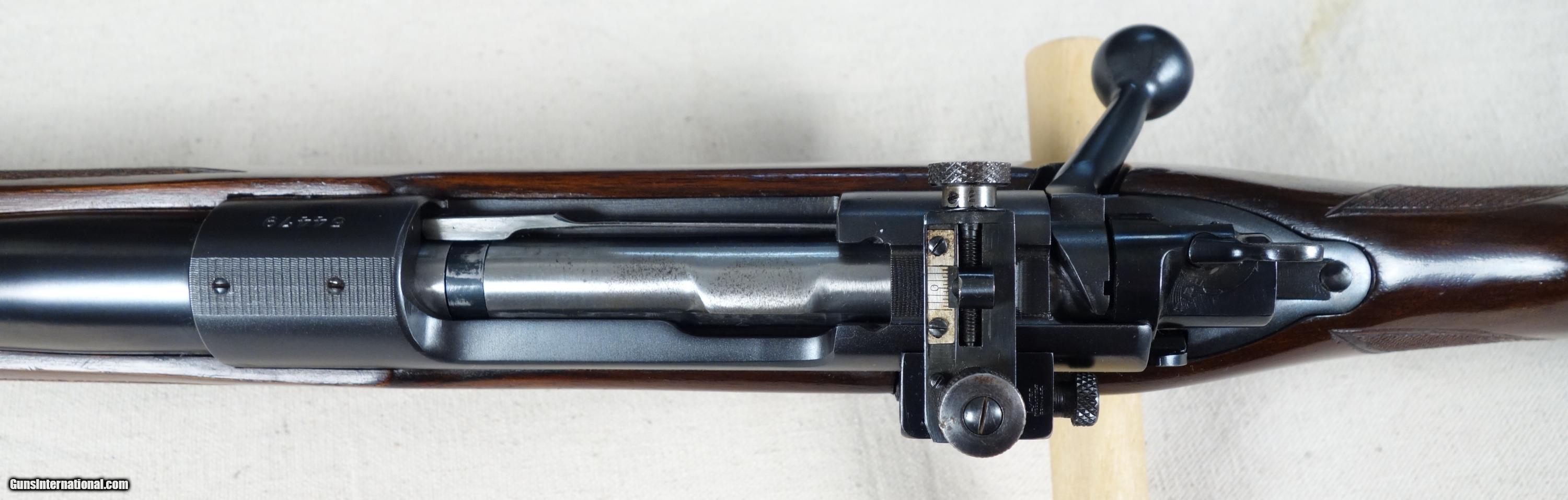 Description: Great rifle inside and out. Winchester Model 70 standard rifle in .30GOV'T.'06. 24" barrel. UNDRILLED rear receiver bridge. S/N 54*** with matching bolt. Assembled in 1946 but 100% Pre War in fit, finishes and all components. Factory inletted full base Lyman 48 WJS receiver sight. Rifle is about 96% overall with some light handling marks on wood and a few creases under the fore end, along with a bit of spotting on floor plate. 100% original. Function and bore condition are excellent. SOLD Curio/Relic: Yes |