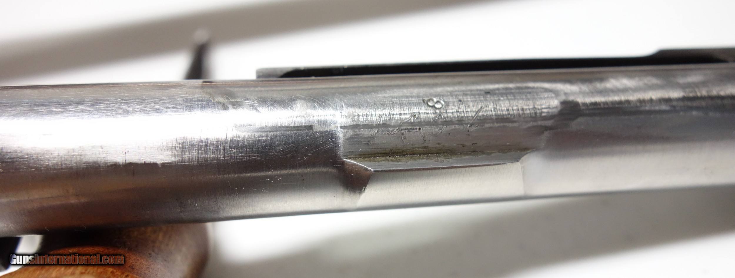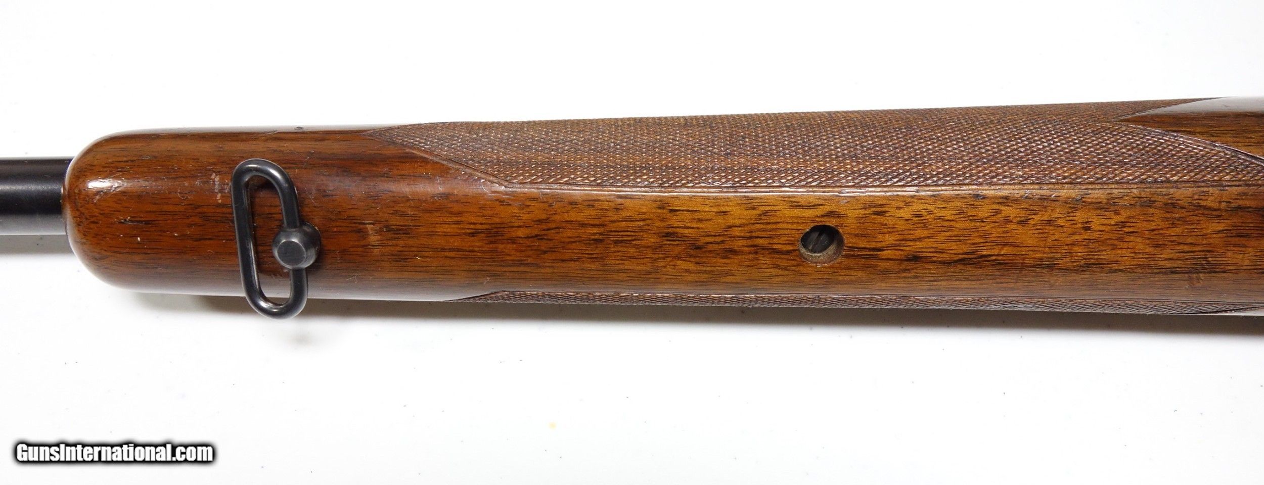 Description: Beautiful and seldom seen First Year production Winchester Pre War Model 70! 4 digit S/N 14** made in 1936. The bolt also has a faintly scribed but present and matching number. The 24 " barrel has a very good bore with strong rifling. Mechanics are perfect. Overall condition is excellent with typical light handling wear throughout. I would rate at 95% original Blue and Varnish with the exception of the butt plate which has faded toward silver. Thankfully, the top matted area of rear receiver bridge remains UNDRILLED. These EARLY 70s are the finest of the entire lot, and are special in several ways, most notably the fabulous carbonum blued, polished receivers which in my experience had about disappeared by around early to mid 1940. Also present is the unique frost blued extractor and correct squared off magazine floor plate release seen only on the very earliest rifles. This rifle has obviously been very well cared for over the last 83 years and would make a worthy addition to most any collection. Flat rate expedited/insured shipping from Alaska only $55. SOLD Curio/Relic: Yes |