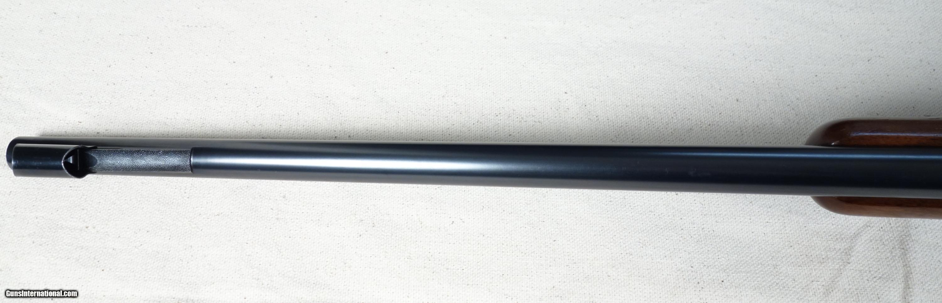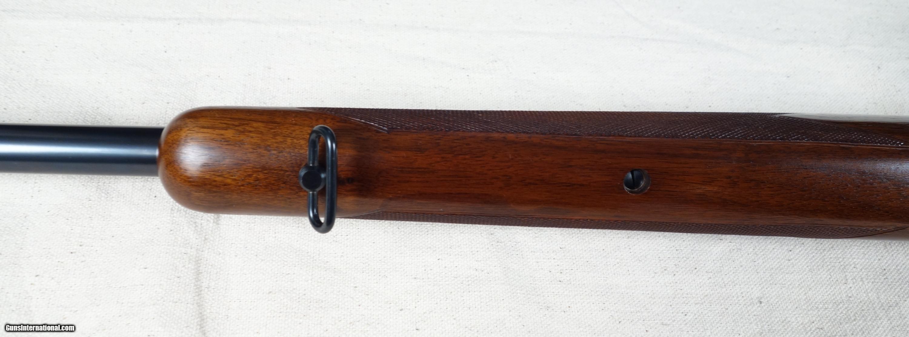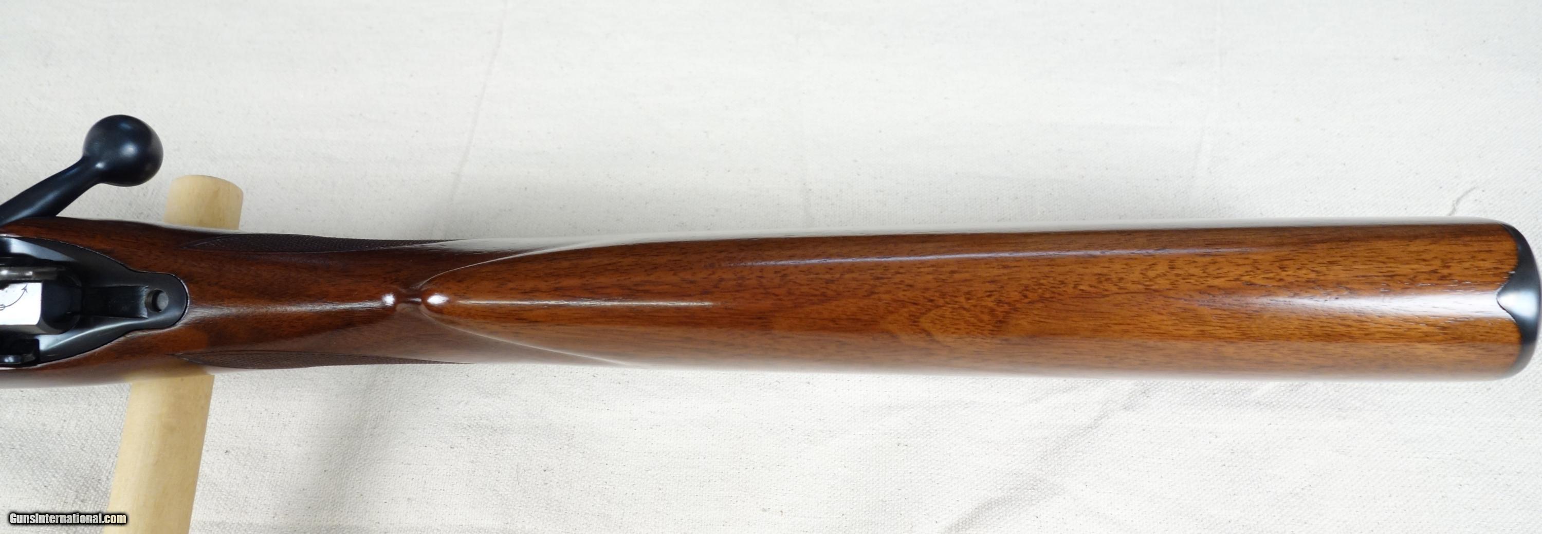 Description: Gorgoeous 1936 first year production Pre War Winchester Model 70 standard rifle in 30 '06 Caliber. 24" Barrel. Undrilled, matted rear receiver bridge. S/N 1xxx with matching Bolt. 99% Blue features the equisite rust blued barrel of all true pre wars and the highly desirable carbonum blued receiver seen only on the earliest models. There is a faint rub on back left side of receiver as shown, but does not detract much. 99% Varnish. Note the rare squared off magazine floor plate release button which changed to a beveled style early on the 2nd year of production. Mechanics and bore are excellent. SOLD Curio/Relic: Yes |