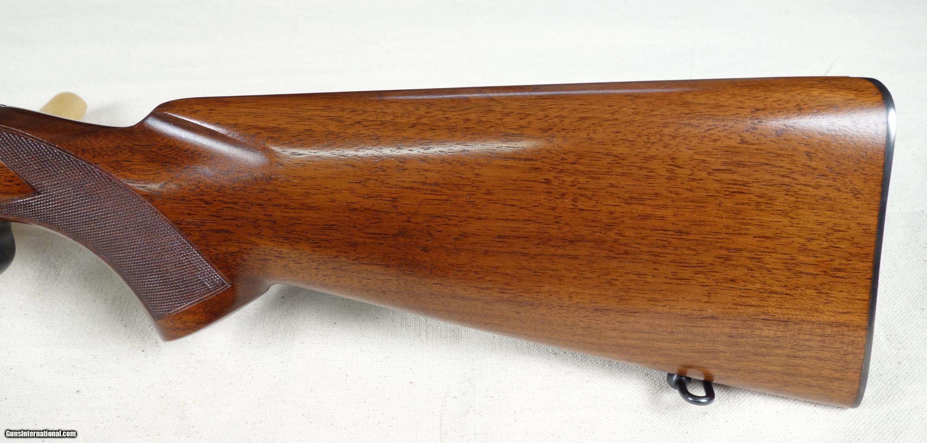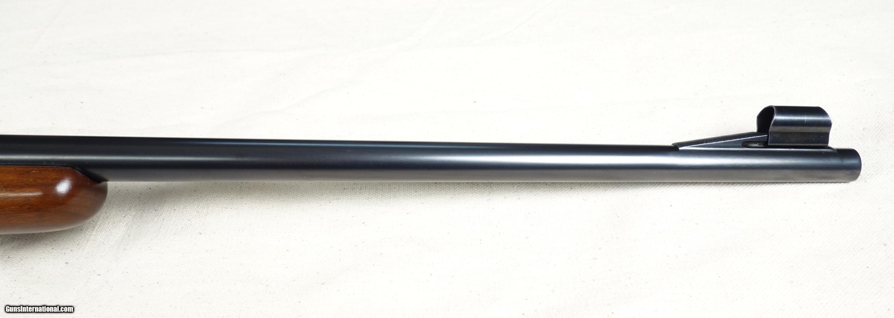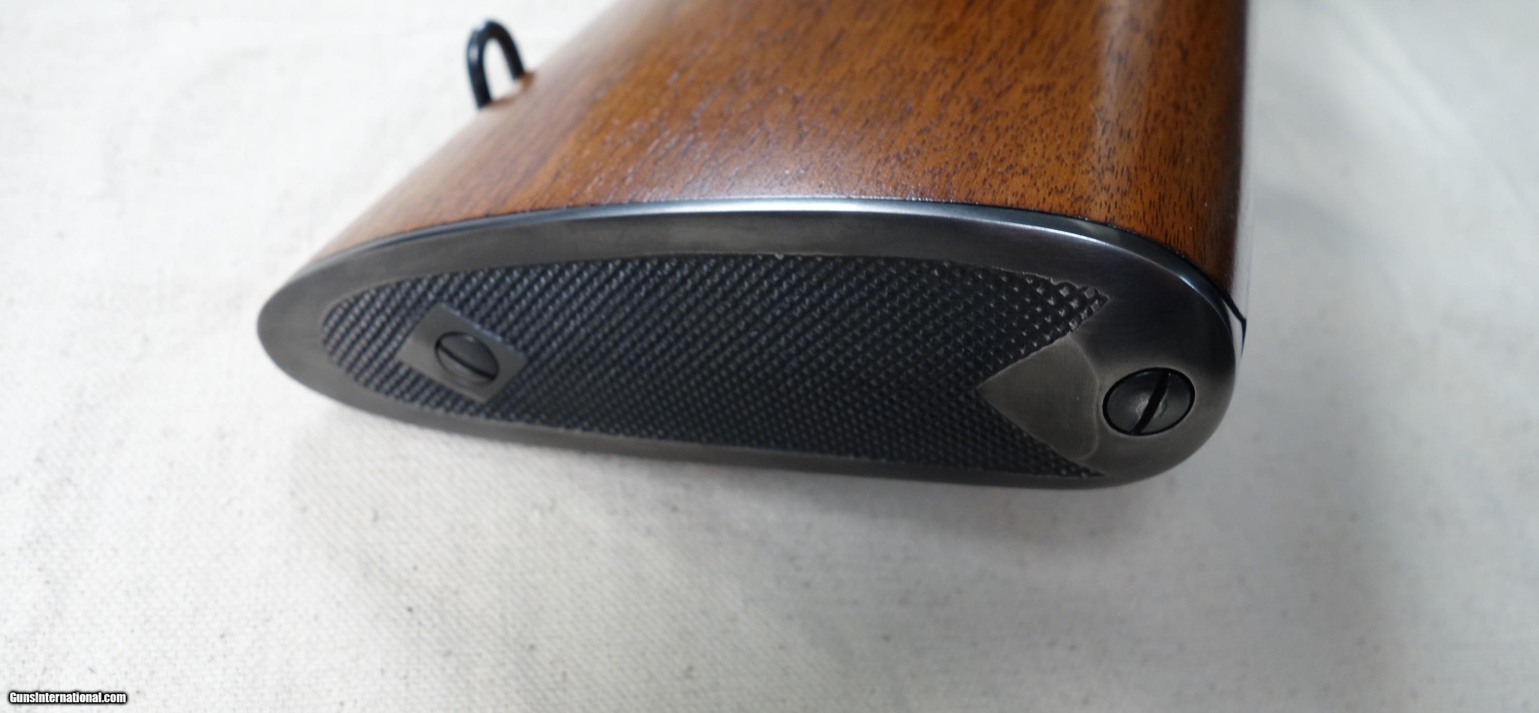 Description: Gorgoeous 1936 first year production Pre War Winchester Model 70 standard rifle in 30 '06 Caliber. 24" Barrel. Undrilled, matted rear receiver bridge. S/N 1xxx with matching Bolt. 99% Blue features the equisite rust blued barrel of all true pre wars and the highly desirable carbonum blued receiver seen only on the earliest models. There is a faint rub on back left side of receiver as shown, but does not detract much. 99% Varnish. Note the rare squared off magazine floor plate release button which changed to a beveled style early on the 2nd year of production. Mechanics and bore are excellent. SOLD Curio/Relic: Yes |