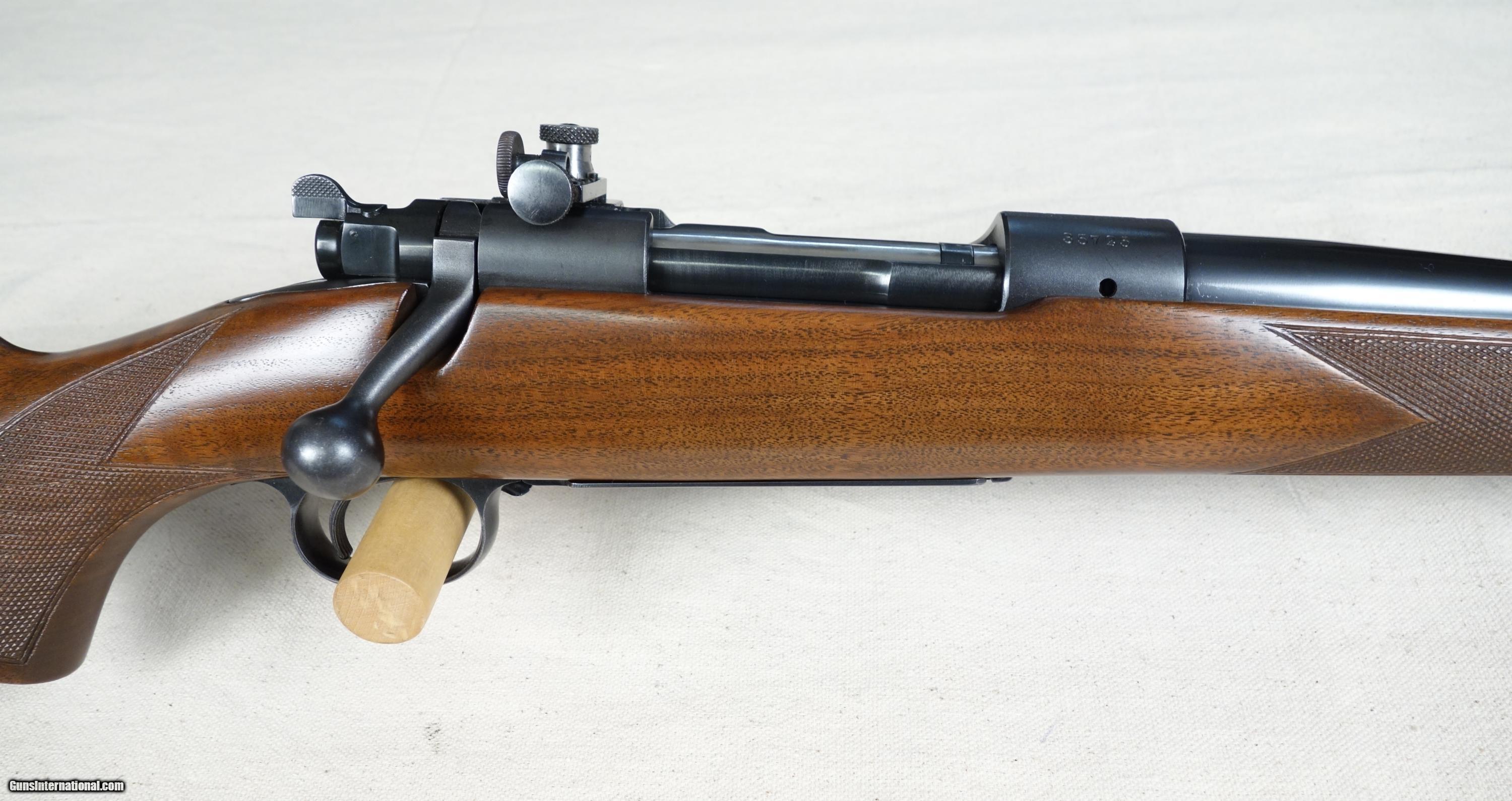 Description: Immaculate Pre War Winchester 70 standard rifle in 30-06. 24" Barrel. S/N 35xxx w/ matching bolt Mfg. 1941. Mechanics are flawless with mirror bore. 98% Blue slightly thinner on floor plate. 99%+ Varnish which has likely been top coated or refinished. There are 2 non factory drill holes in rear receiver bridge. Has the correct full base (non scalloped) Lyman 48 WJS peep sight which were often factory issued with these early rifles, but the cut out in stock is somewhat oversized from that of factory work. A beautiful rifle with a few collector discrepancies offered at a considerably discounted price from all original. SOLD Curio/Relic: Yes |