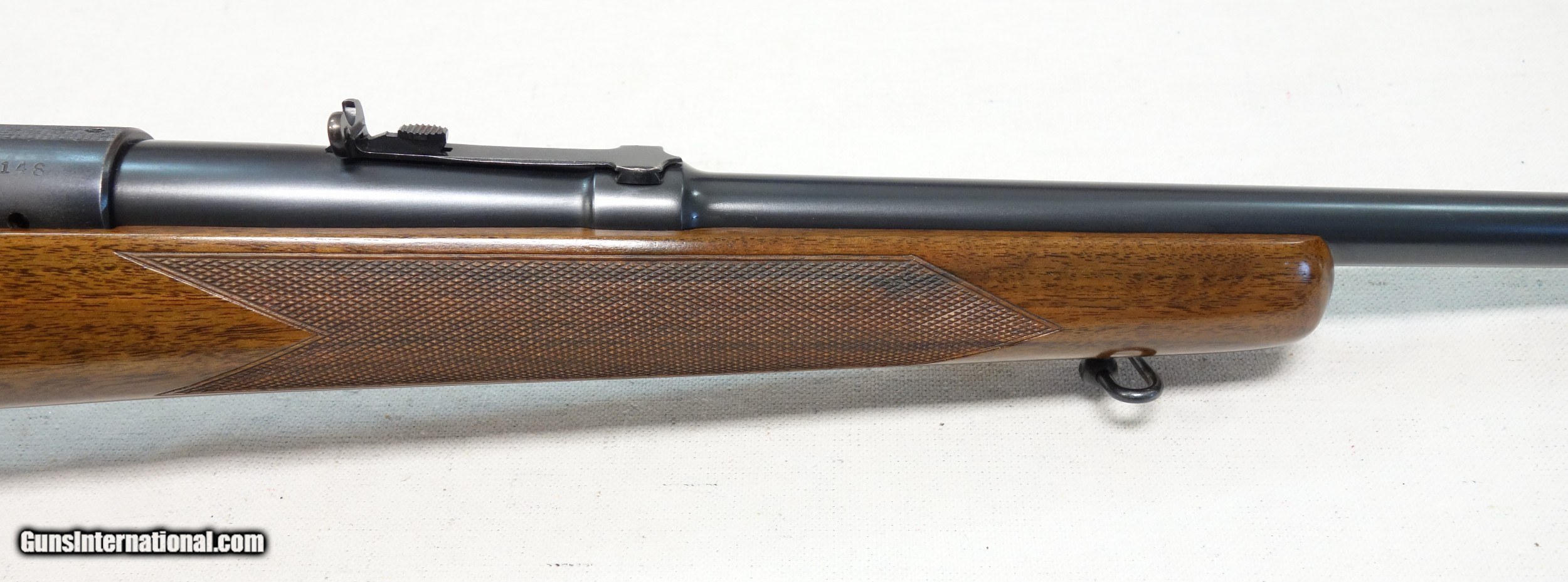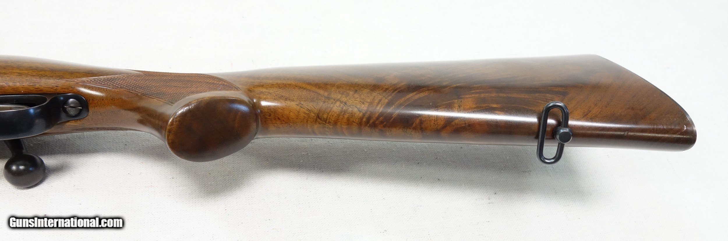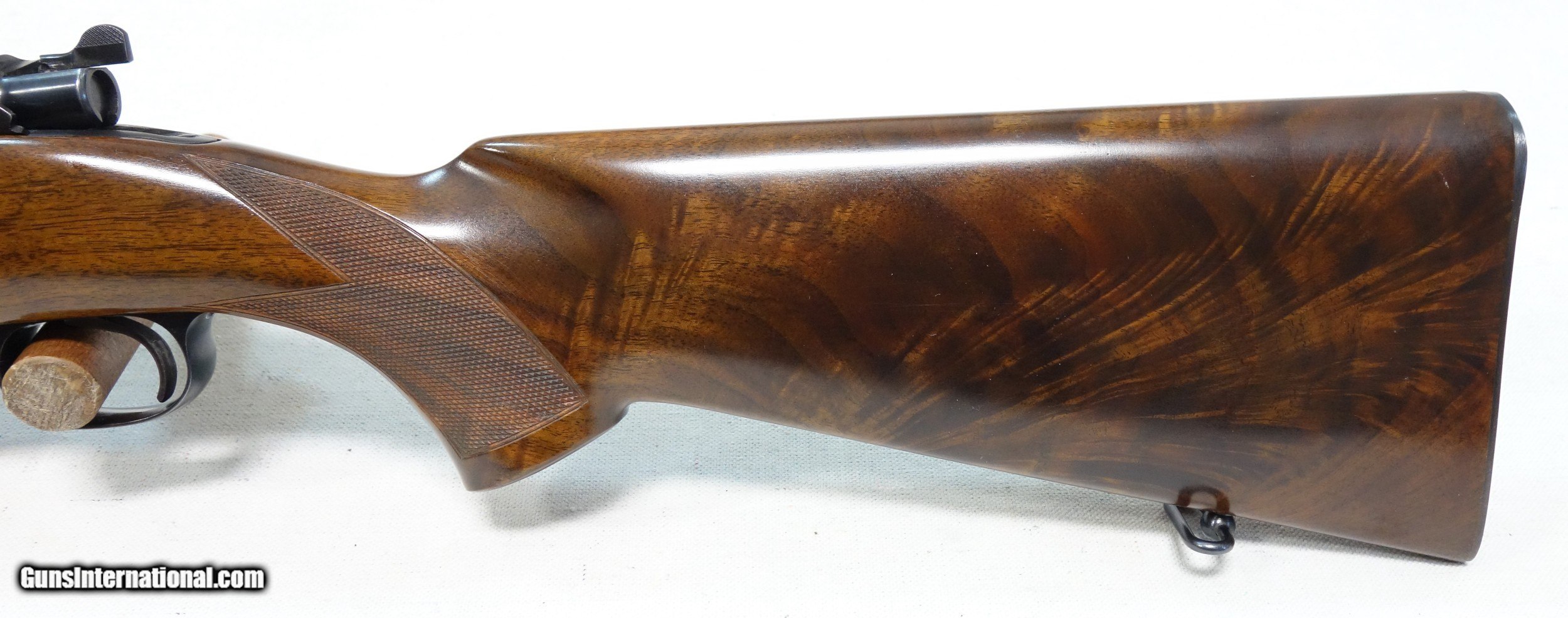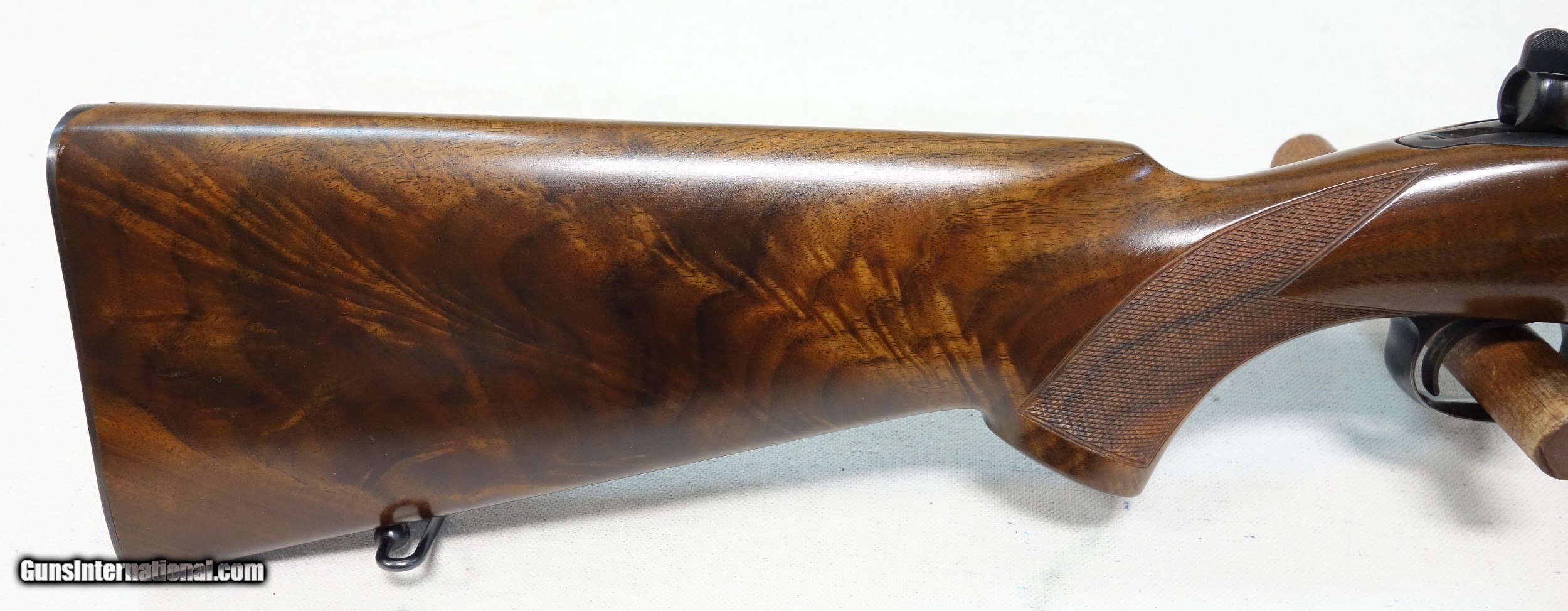 Description: ***SOLD*** Quite possibly one of the rarest and most beautiful Model 70s you will ever lay eyes on. Class 4 Special Order non standard chambering CARBINE in 25-35 W.C.F. As if that were not enough, it has a breathtaking piece of factory wood which has flame grain showing throughout the buttstock. This is not a restock, so was presumably also special ordered. S/N 60*** with matching scribed bolt made in 1947, but of 100% Pre War components including clover leaf shaped receiver tang, matted and UNDRILLED rear receiver, rust bluing, etc. The chamber breech is FLAT to accommodate this rimmed cartridge. 20" carbine barrel has minty bore, perfect: stampings, ramp transitions, stippling, crown etc. Overall condition is better than 99%. This incredible firearm is surely destined to be the centerpiece of even the most advanced M70 carbine collection. Shipping from Alaska is $75 via Priority Mail with full insurance in a custom cut foam lined box for maximum protection. I have a few other ultra rare caliber 70s from this magnificent collection, please inquire. SOLD Curio/Relic: Yes |