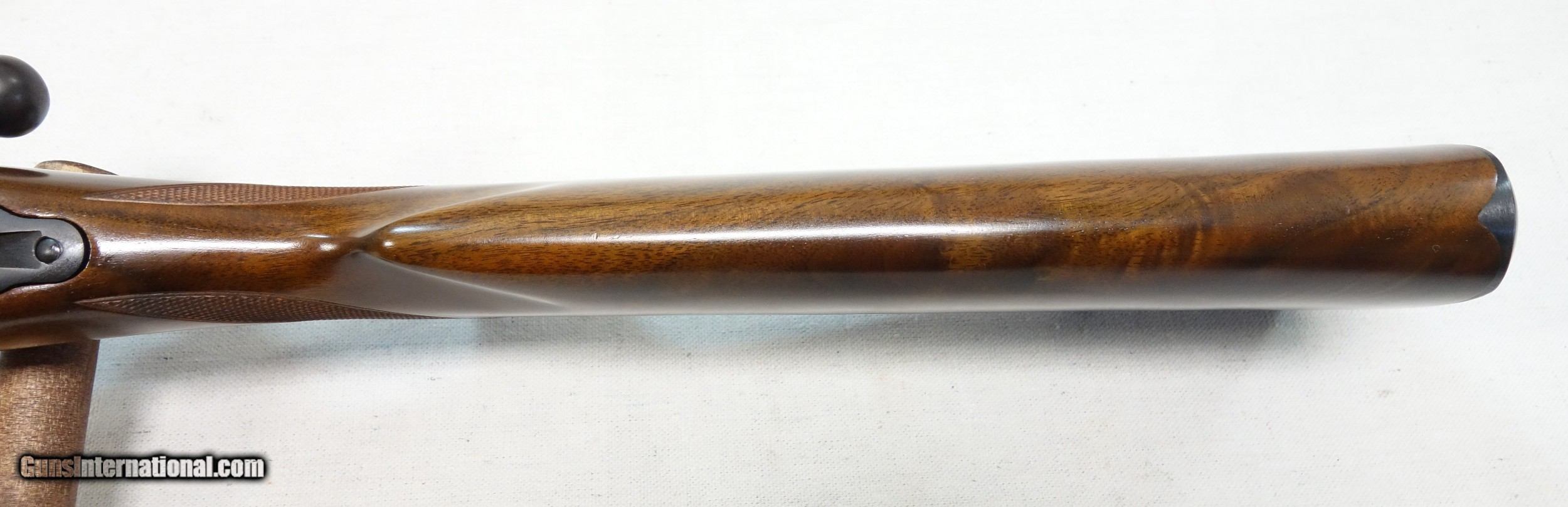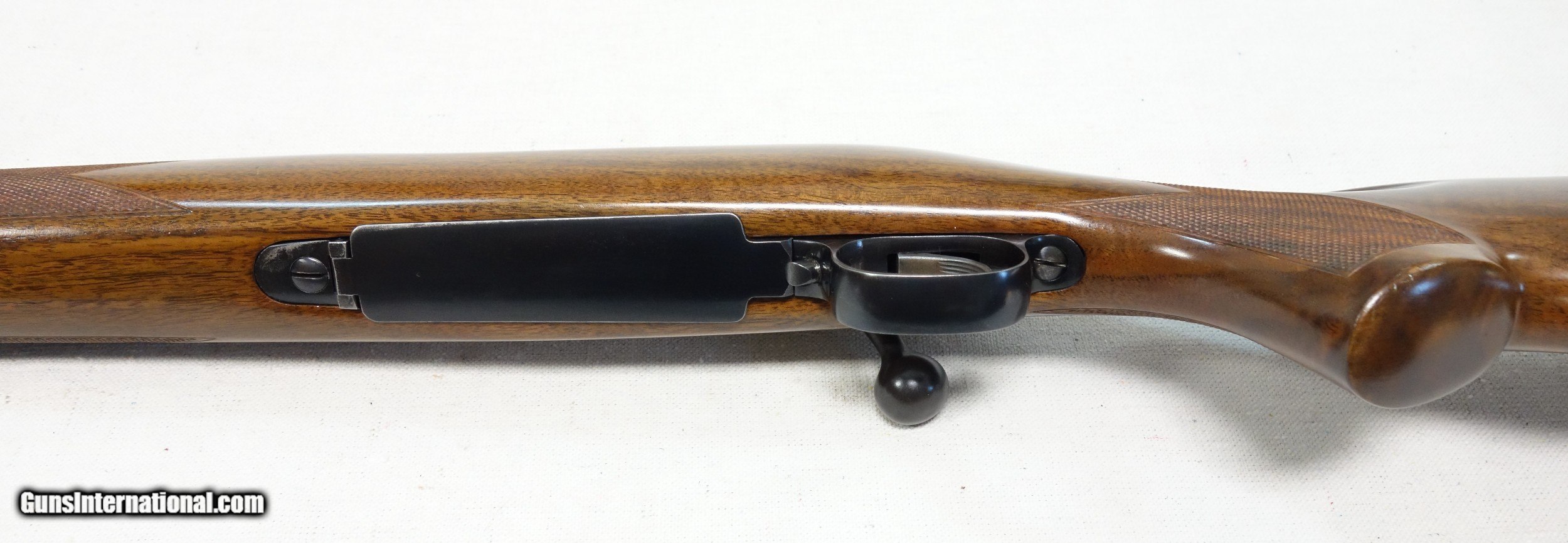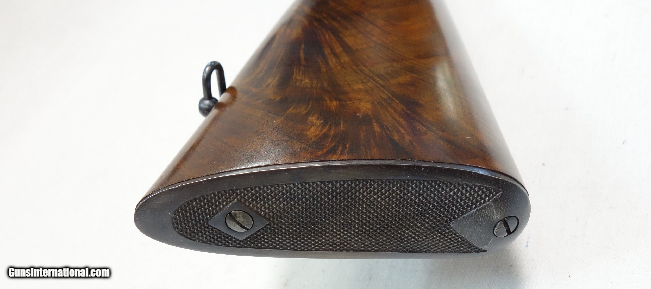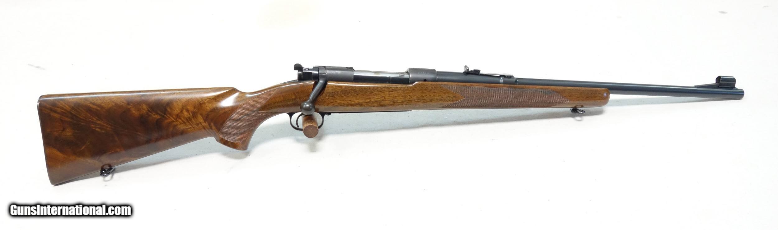Description: ***SOLD*** Quite possibly one of the rarest and most beautiful Model 70s you will ever lay eyes on. Class 4 Special Order non standard chambering CARBINE in 25-35 W.C.F. As if that were not enough, it has a breathtaking piece of factory wood which has flame grain showing throughout the buttstock. This is not a restock, so was presumably also special ordered. S/N 60*** with matching scribed bolt made in 1947, but of 100% Pre War components including clover leaf shaped receiver tang, matted and UNDRILLED rear receiver, rust bluing, etc. The chamber breech is FLAT to accommodate this rimmed cartridge. 20" carbine barrel has minty bore, perfect: stampings, ramp transitions, stippling, crown etc. Overall condition is better than 99%. This incredible firearm is surely destined to be the centerpiece of even the most advanced M70 carbine collection. Shipping from Alaska is $75 via Priority Mail with full insurance in a custom cut foam lined box for maximum protection. I have a few other ultra rare caliber 70s from this magnificent collection, please inquire. SOLD Curio/Relic: Yes |