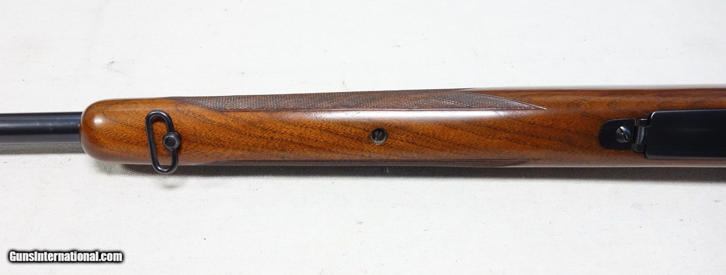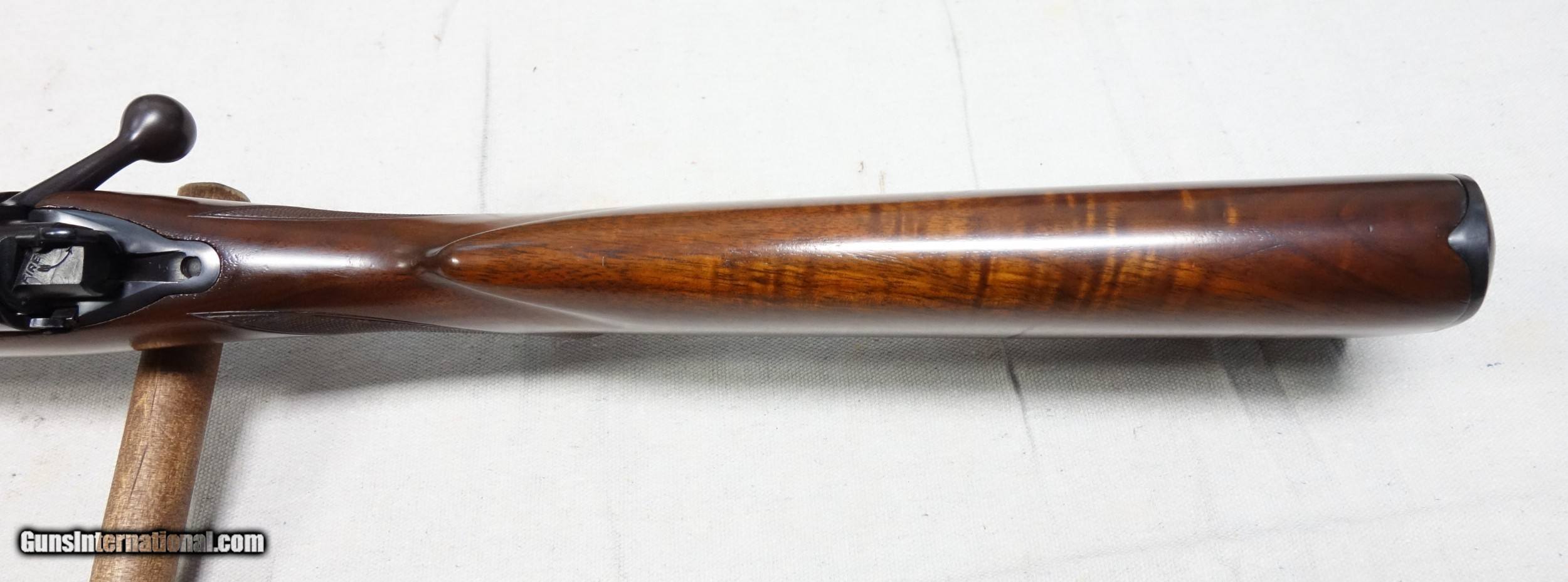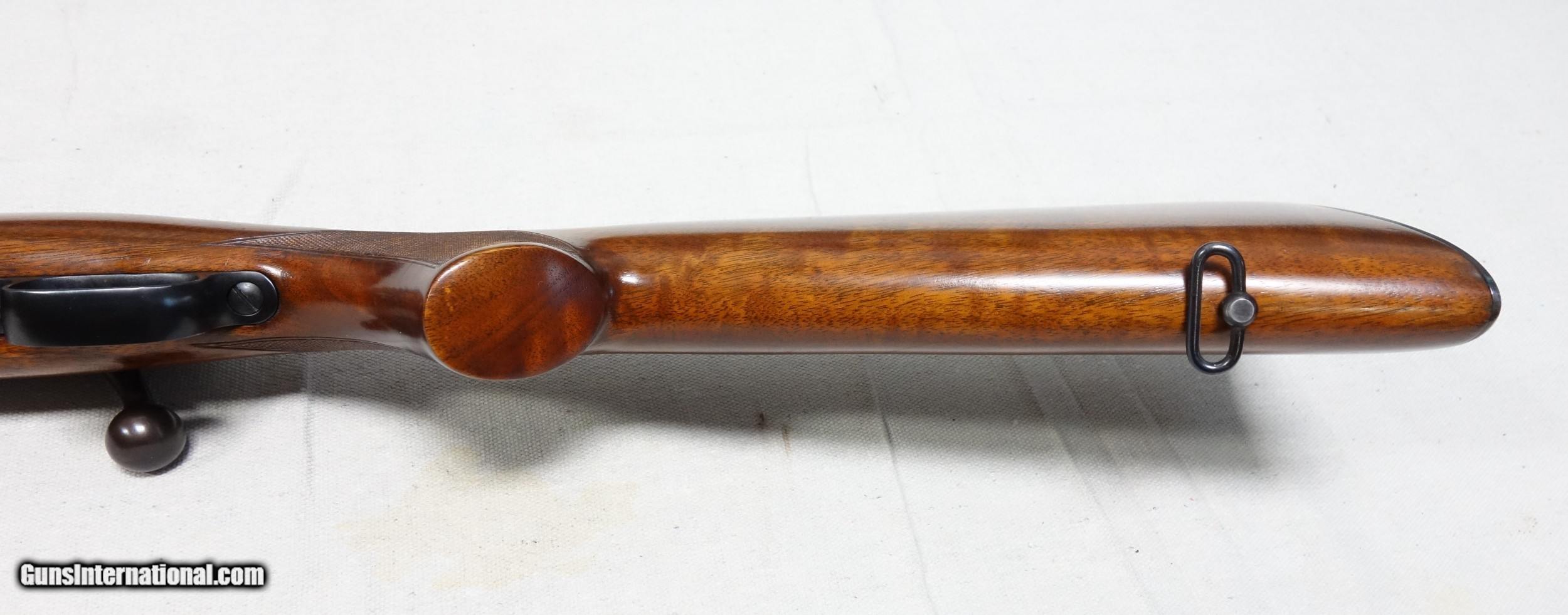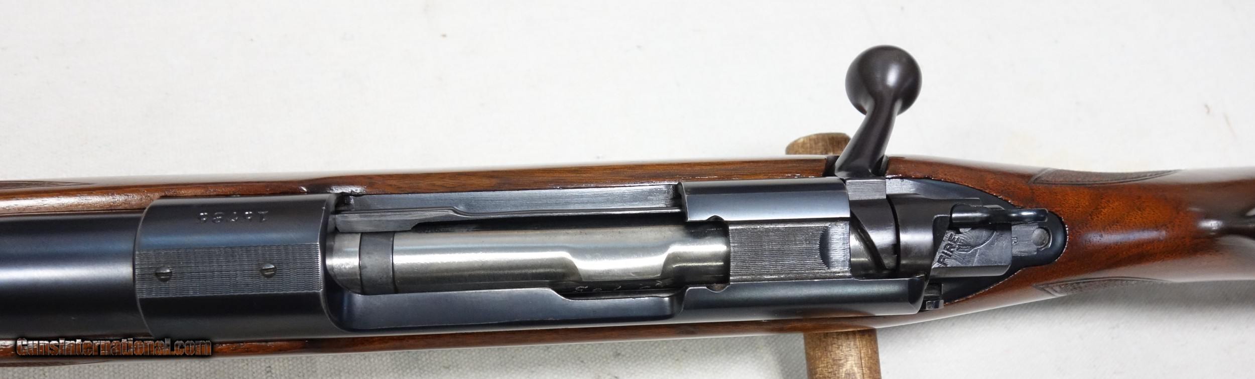 Description: ***SOLD, pending pmt.*** Beautiful, genuine, and rare Pre War 70 short rifle aka "Carbine" in the versatile and popular 30-06 caliber. S/N 15*** with matching scribed bolt made in 1938. The bluing is excellent showing 97% or better over most, other than the barrel which shows more wear due to some light use marks/scratches and a bit of wear at the sharp edge of the muzzle. Early frost blued extractor. 20" barrel with integral front sight ramp, no monkey business of a chopped and fabricated or fake barrel, this is the REAL deal with perfect ramp transitions, stippling, crown, etc.! The wood is also excellent with original lacquer showing only a few scattered impressions. There are NO cracks, gouges or discoloration anywhere. The beautiful polished carbonum blued receiver worn only by these earliest and finest rifles remains UNDRILLED, making this rifle particularly valuable and highly collectible. The bore and mechanics are superb and crisp as usual. This is a really nice and difficult to find rifle. Expedited and fully insured shipping from Alaska to your FFL is an additional $80. SOLD Curio/Relic: Yes |