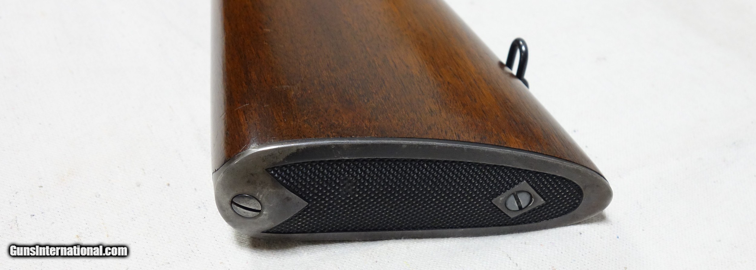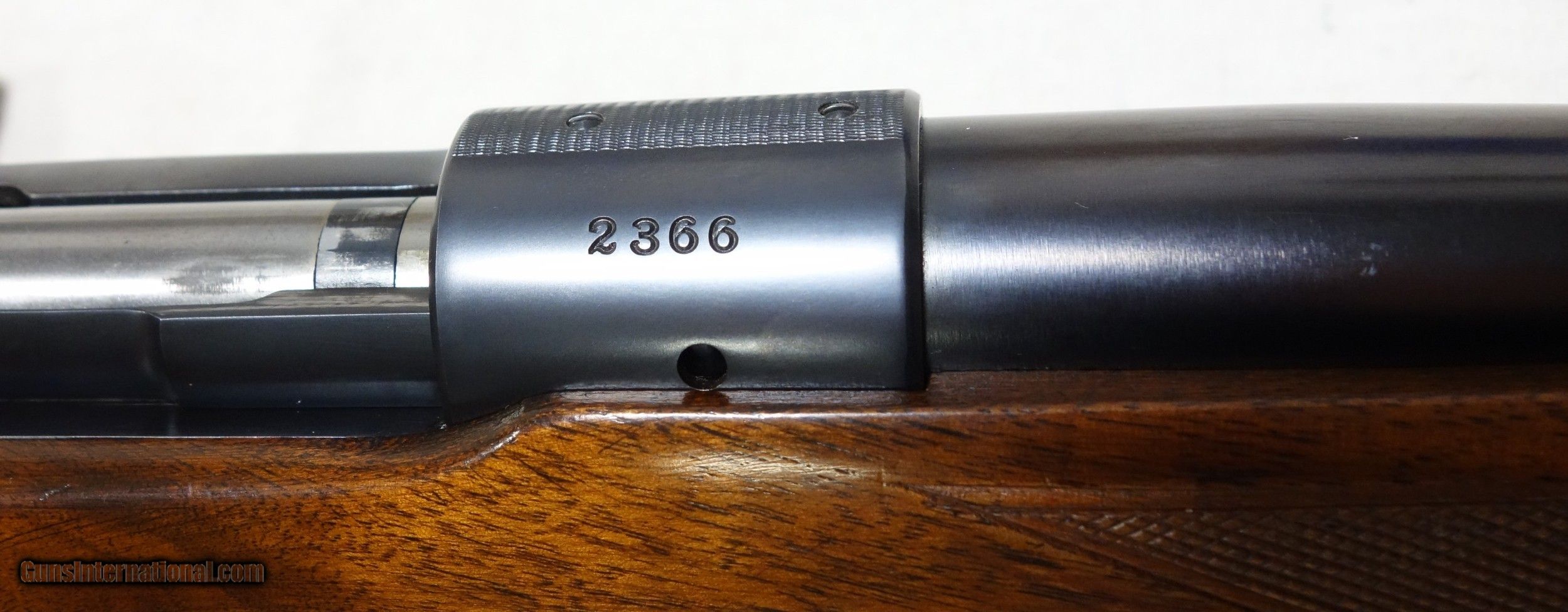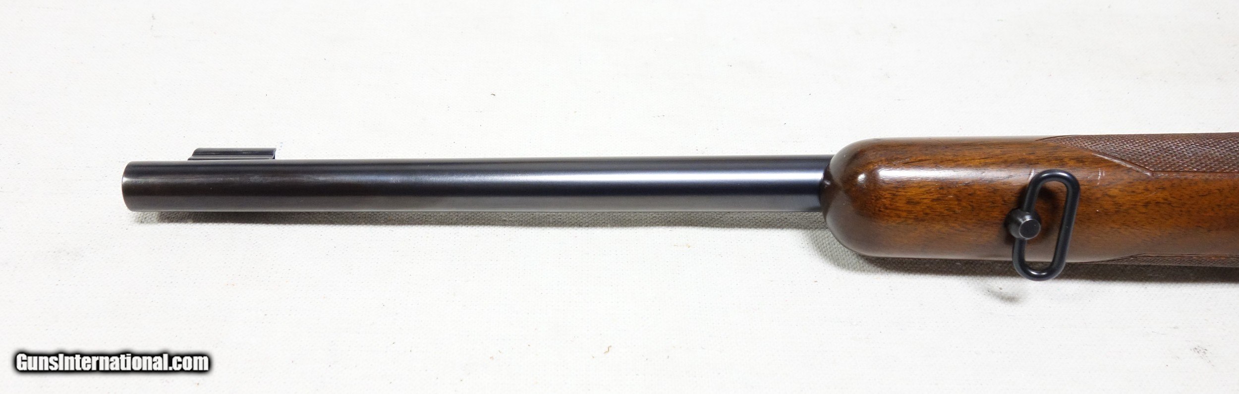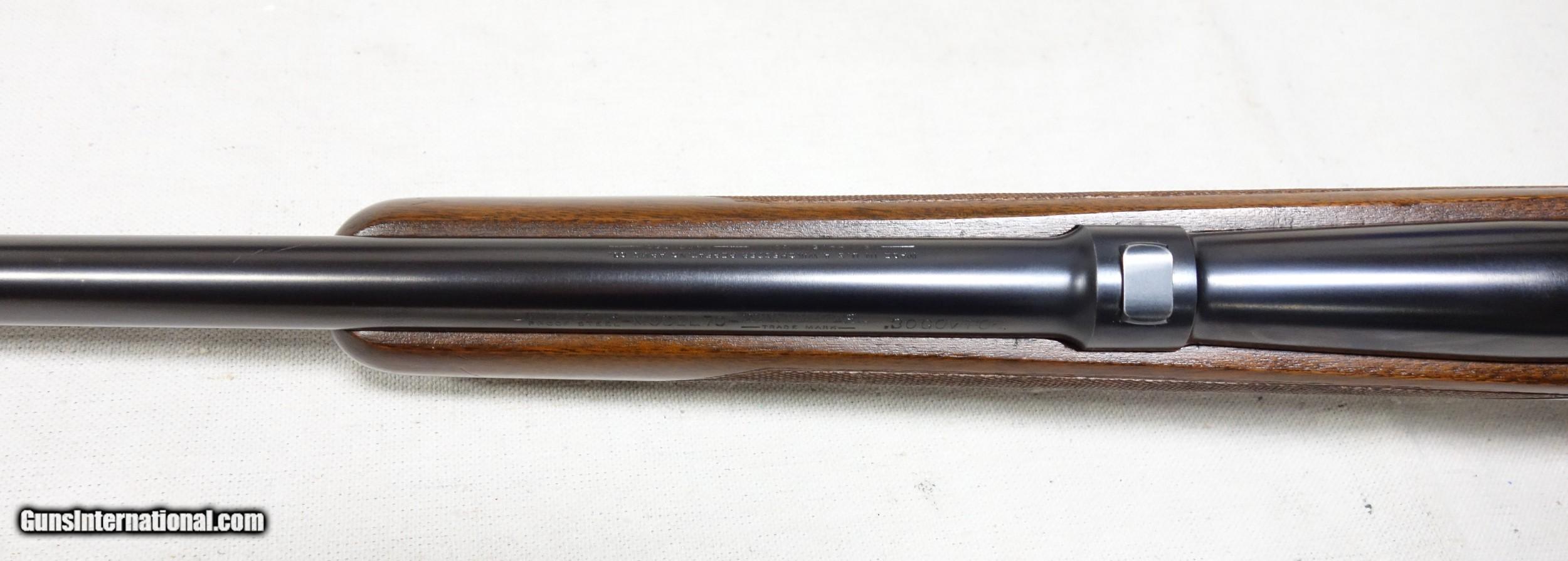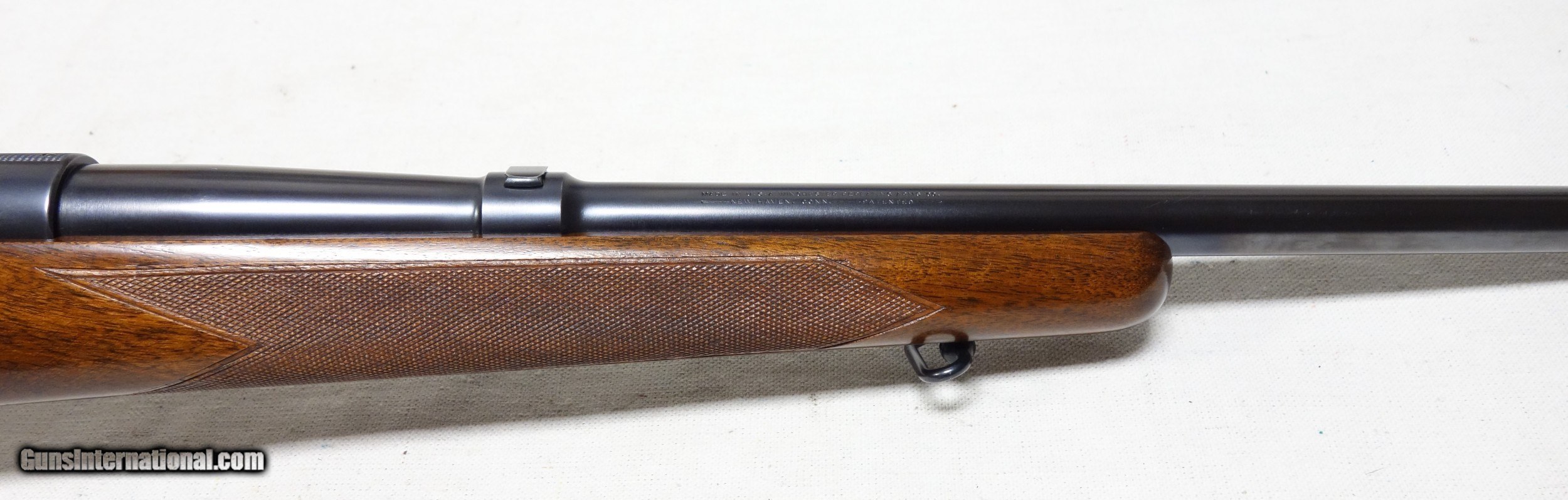 Description: Here's a TRUE 1st year Model 70 Carbine in .30 GOV'T. '06 (30-06) made in 1936, and in about as good of a condition as you will ever see. S/N 2366 with matching scribed bolt. 20" carbine barrel with excellent bore, perfect integral front sight ramp transition and crown. Mechanical function is flawless. A really great example showing about 97% original finishes with all of the desirable early features: polished carbonum blued receiver, frost blued extractor, rust blued barrel, square faced magazine release plunger, fine line checkering on stock, etc. The rear receiver bridge remains undrilled. There is a factory installed 1st generation Lyman 48 receiver sight with all matching inner component numbers and the thimble type adjustment knobs. A rare gun in this condition, configuration and vintage. Shipping from Alaska is $75 via Priority Mail with full insurance in a custom cut foam lined box for maximum protection. Credit card users please add 3%. SOLD Curio/Relic: Yes |