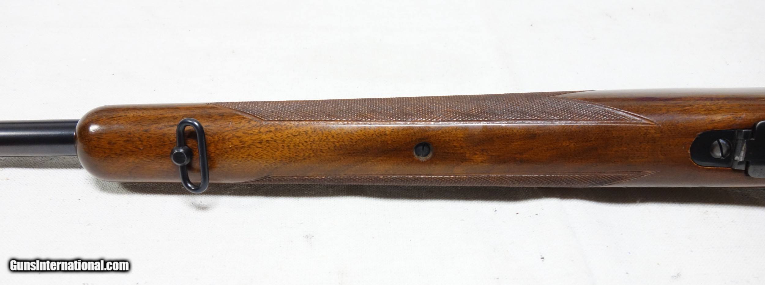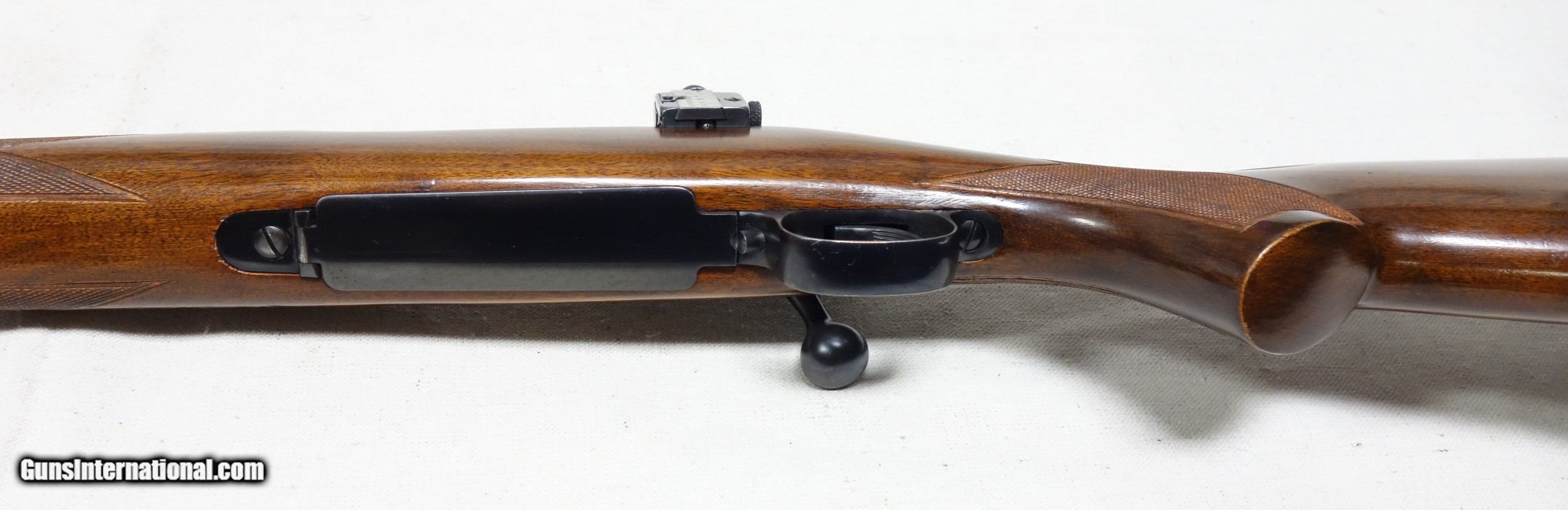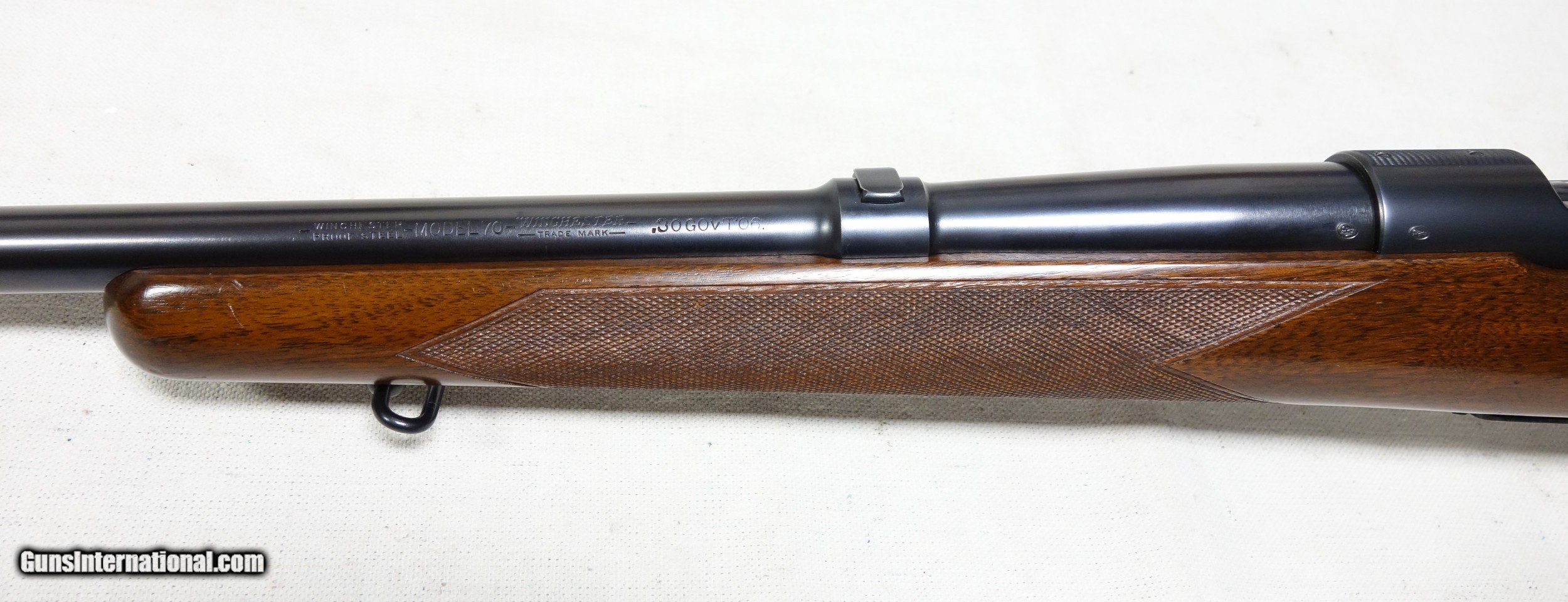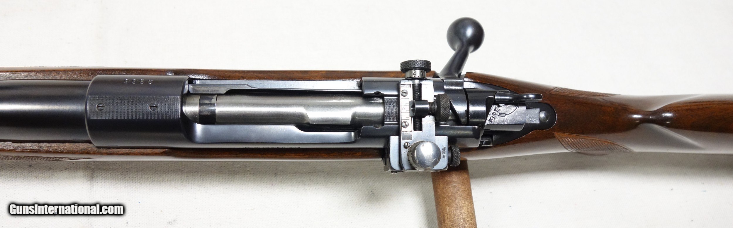 Description: Here's a TRUE 1st year Model 70 Carbine in .30 GOV'T. '06 (30-06) made in 1936, and in about as good of a condition as you will ever see. S/N 2366 with matching scribed bolt. 20" carbine barrel with excellent bore, perfect integral front sight ramp transition and crown. Mechanical function is flawless. A really great example showing about 97% original finishes with all of the desirable early features: polished carbonum blued receiver, frost blued extractor, rust blued barrel, square faced magazine release plunger, fine line checkering on stock, etc. The rear receiver bridge remains undrilled. There is a factory installed 1st generation Lyman 48 receiver sight with all matching inner component numbers and the thimble type adjustment knobs. A rare gun in this condition, configuration and vintage. Shipping from Alaska is $75 via Priority Mail with full insurance in a custom cut foam lined box for maximum protection. Credit card users please add 3%. SOLD Curio/Relic: Yes |