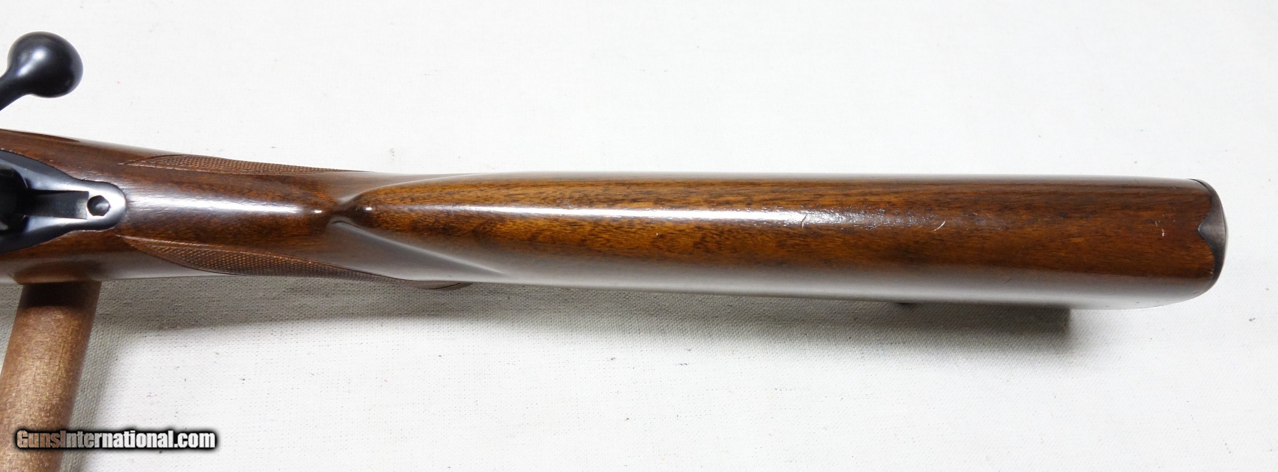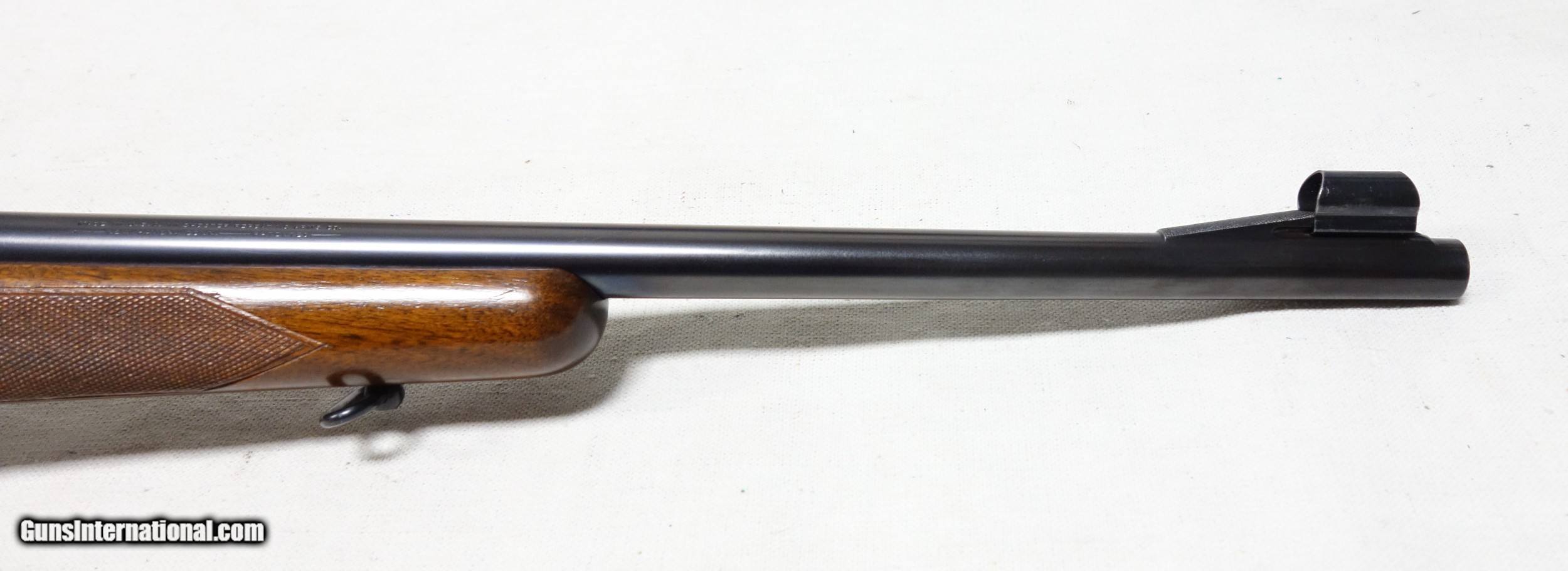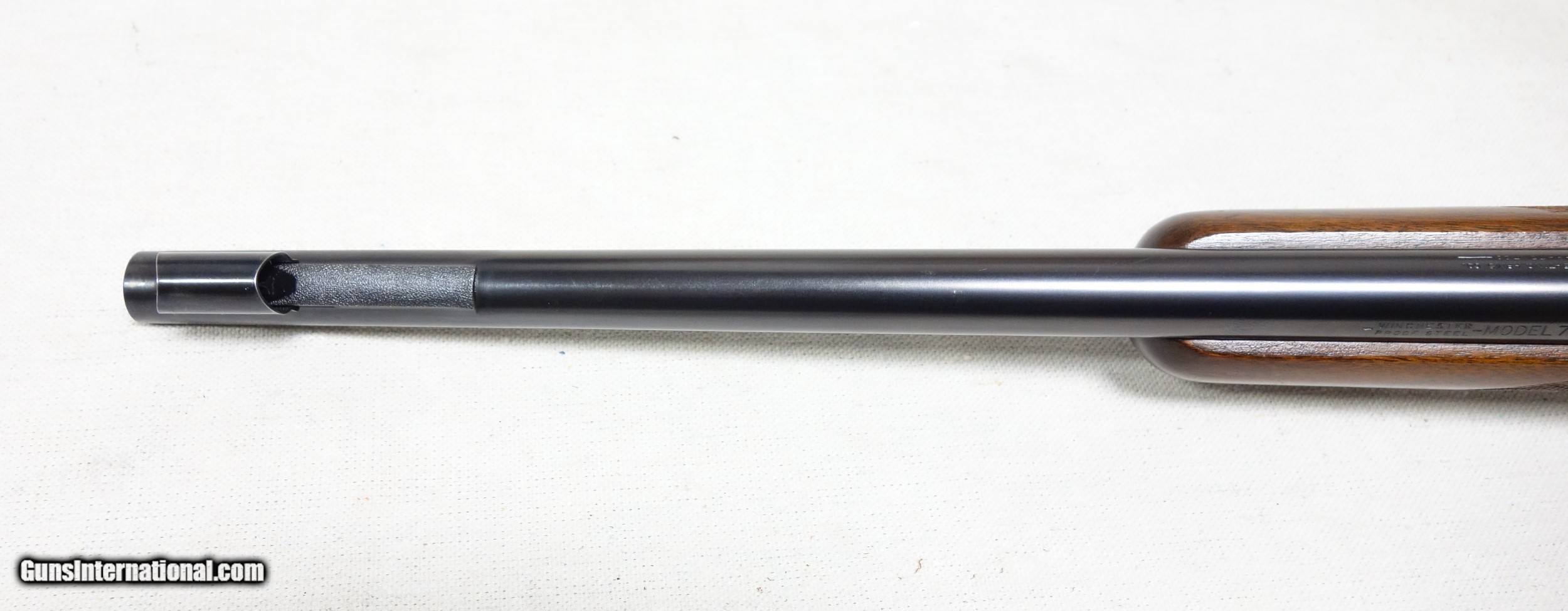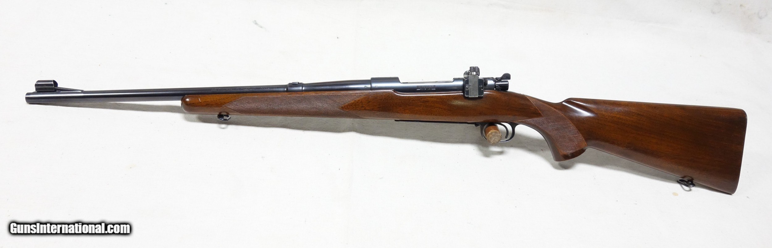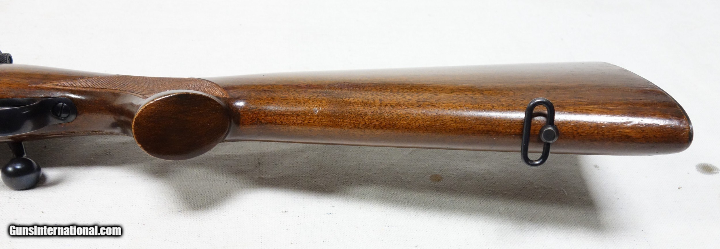 Description: Here's a TRUE 1st year Model 70 Carbine in .30 GOV'T. '06 (30-06) made in 1936, and in about as good of a condition as you will ever see. S/N 2366 with matching scribed bolt. 20" carbine barrel with excellent bore, perfect integral front sight ramp transition and crown. Mechanical function is flawless. A really great example showing about 97% original finishes with all of the desirable early features: polished carbonum blued receiver, frost blued extractor, rust blued barrel, square faced magazine release plunger, fine line checkering on stock, etc. The rear receiver bridge remains undrilled. There is a factory installed 1st generation Lyman 48 receiver sight with all matching inner component numbers and the thimble type adjustment knobs. A rare gun in this condition, configuration and vintage. Shipping from Alaska is $75 via Priority Mail with full insurance in a custom cut foam lined box for maximum protection. Credit card users please add 3%. SOLD Curio/Relic: Yes |