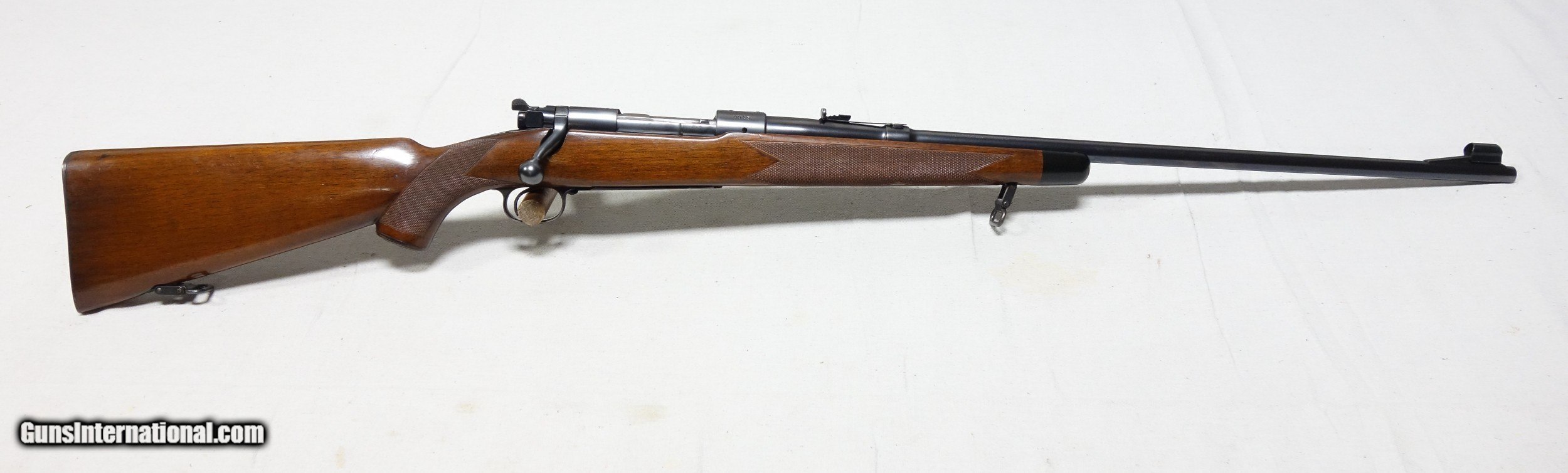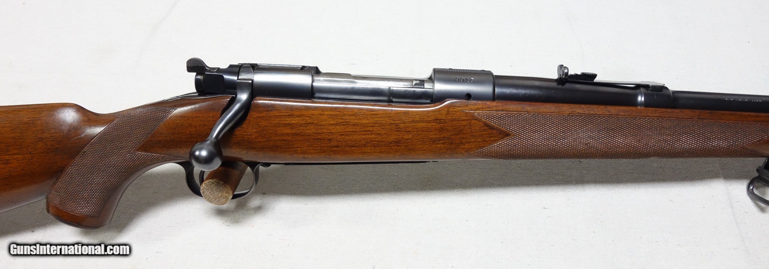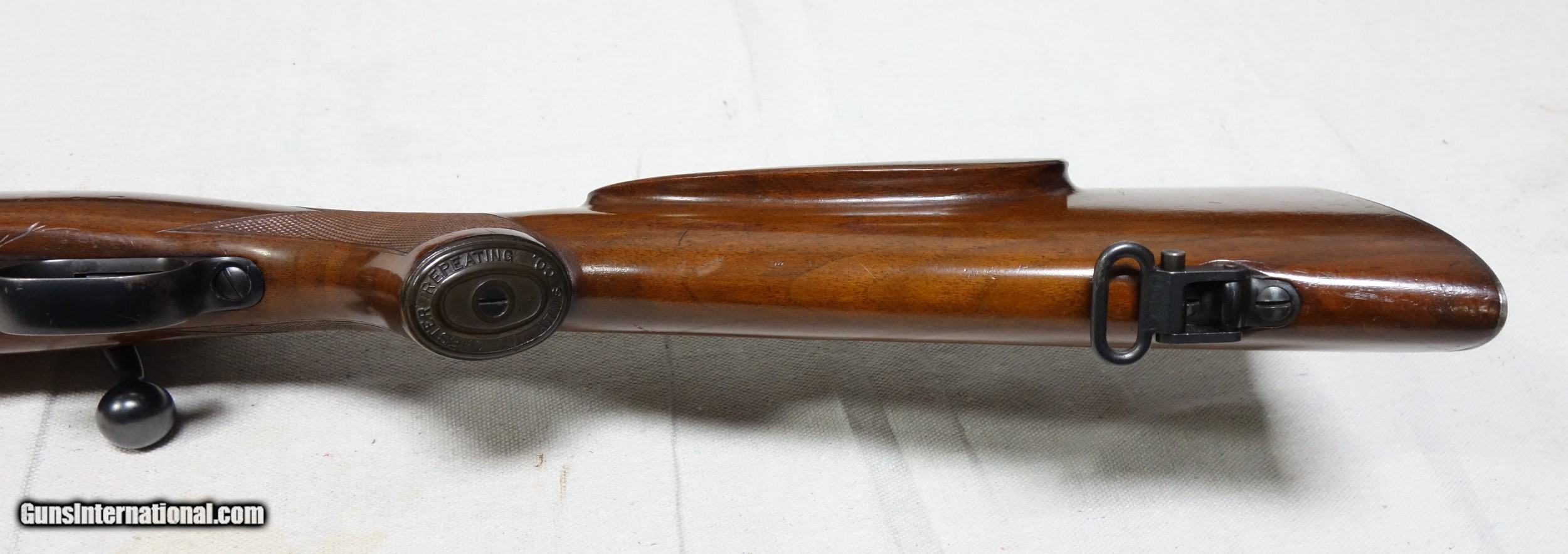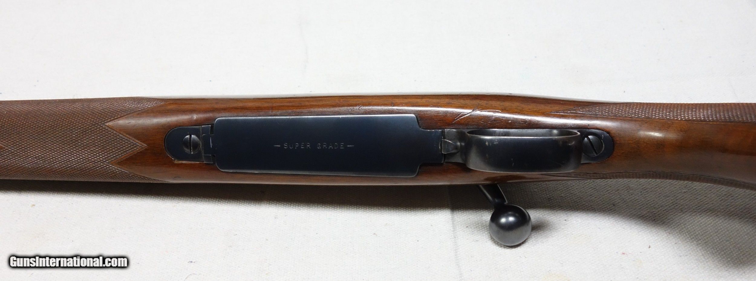 Description: ***SOLD*** Incredible and very rare Pre War 220 Swift Super Grade. This is a very early 4 digit S/N 9915 with matching bolt made in 1937. This rifle wears the desirable early rust blued carbon steel barrel with 1936 date stamp! Pre War Swift Supers have been even harder for me to find than the rarest of calibers. They are very elusive! The condition of this one is simply superb for an 85 year old rifle with all original finishes showing an honest 98% Blue everywhere except the buttplate, which shows typical light patina. The wood is also excellent with only scattered light handling marks/impressions one would expect. There are no significant dents, nor any gouges or cracks anywhere. The rear receiver bridge remains undrilled! The bore and throat are excellent and the mechanical functions are flawless. All of the correct era Super Grade components are present including the Redfield front sight, properly stamped floor plate, and the proper Pre War era detachable swivels. This is a beautiful, highly desirable and highly collectible Model 70 by any standard. Expedited and fully insured shipping from Alaska to your FFL in a custom cut foam lined box is $100. SOLD Curio/Relic: Yes |
