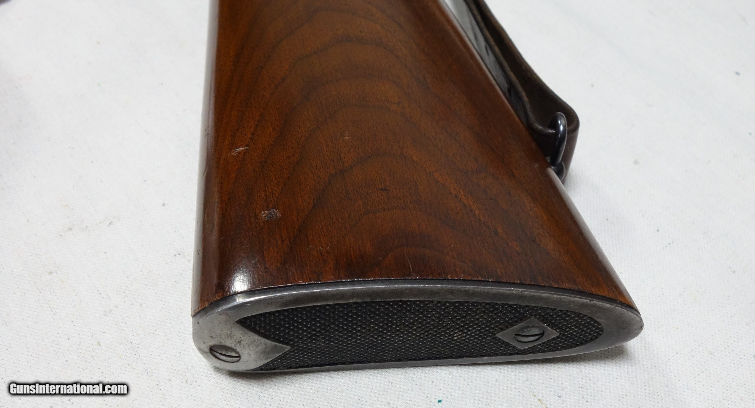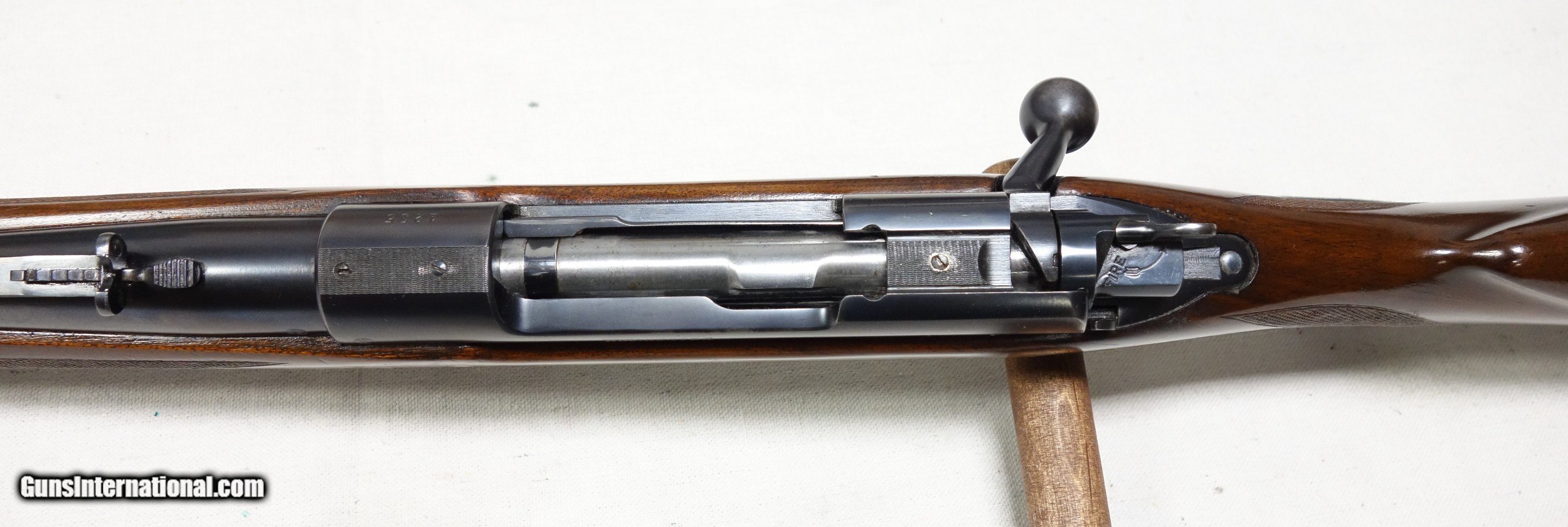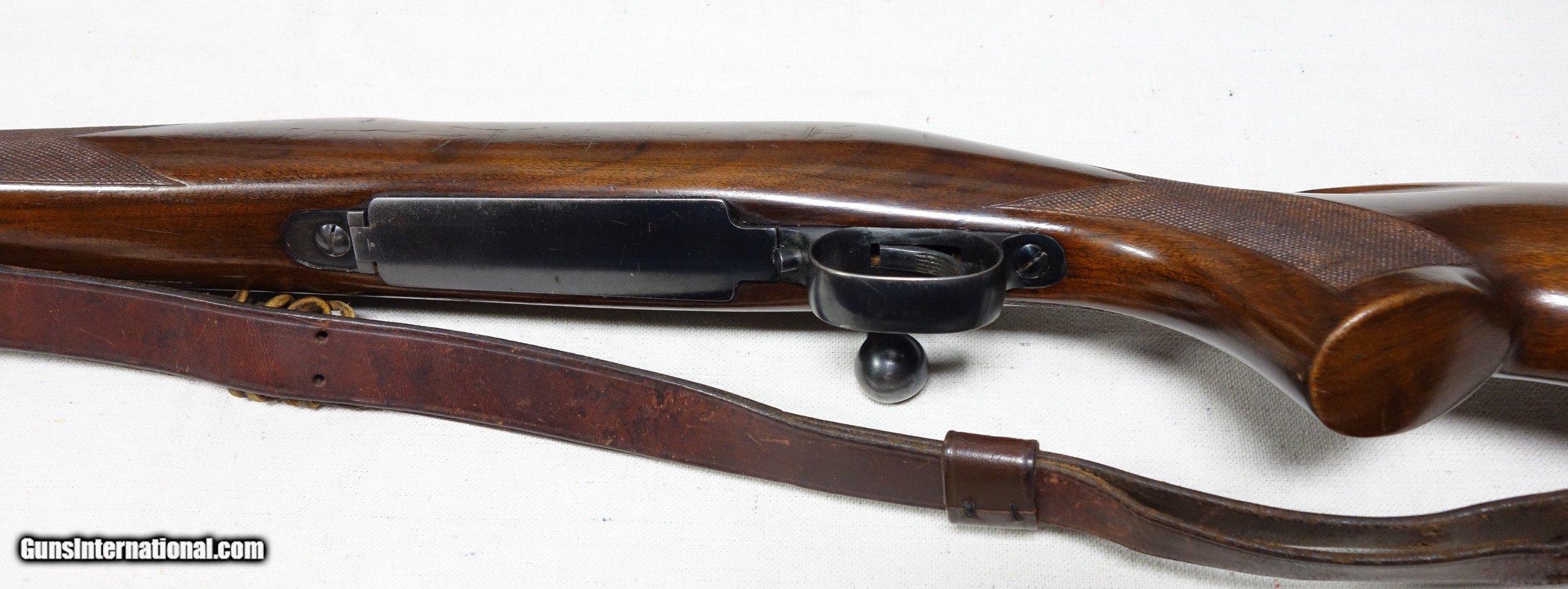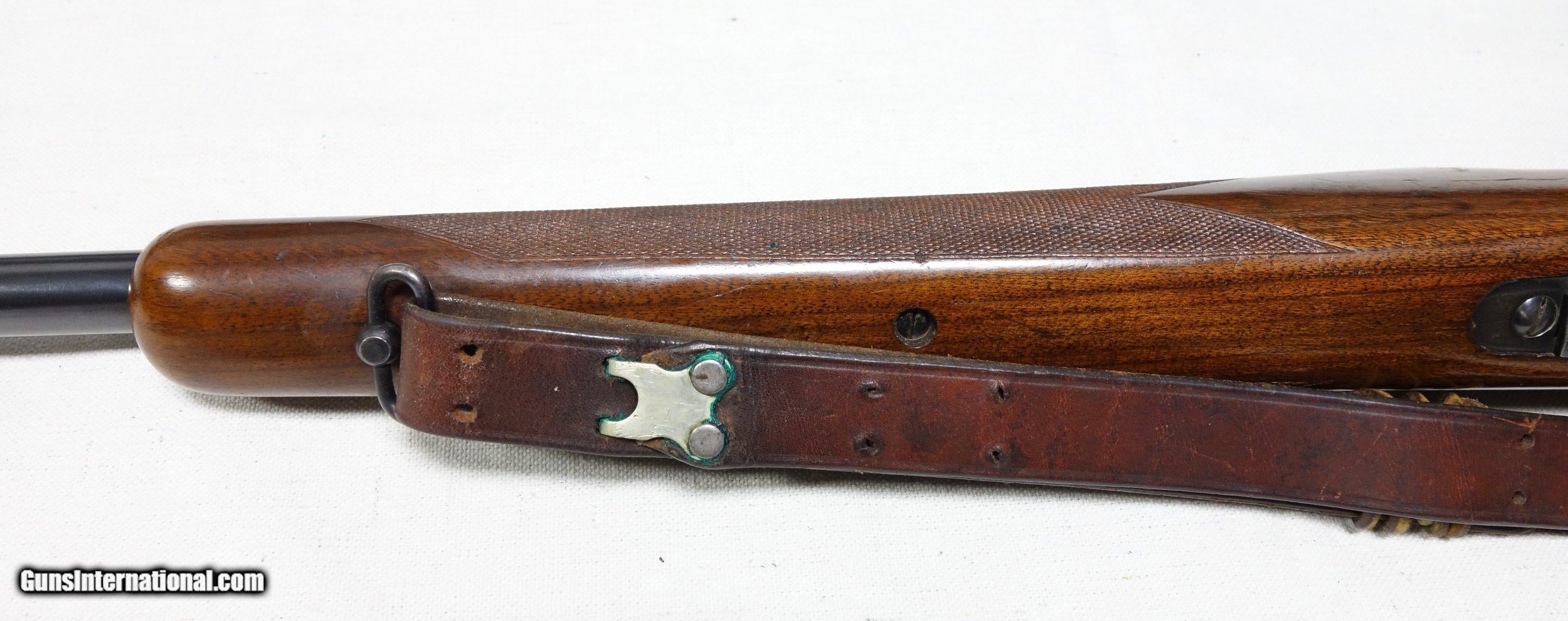 Description: Ultra scarce and beautiful 1st year Pre War 70 in 30-06. This is a true 1st year gun with 4 digit S/N 1235 and matching scribed bolt made in 1936! The original Blue and Varnish rates about 96%, amazing for an 85 year old gun. Beautifully grained wood. Beautiful polished Carbonum Blue receiver seen only on the earliest rifles. Seldom seen rare square faced magazine release botton! Period sling is still in good shape so I left it on, may be original? 24" barrel. There is one somewhat heartbreaking but all too common non original drill hole in the matted rear receiver bridge. Still a fantastic rifle overall. The bore is like a mirror and mechanical functions are typically butter smooth and precise. Not perfect, but you will likely have a very long wait to see another like it. SOLD Curio/Relic: Yes |