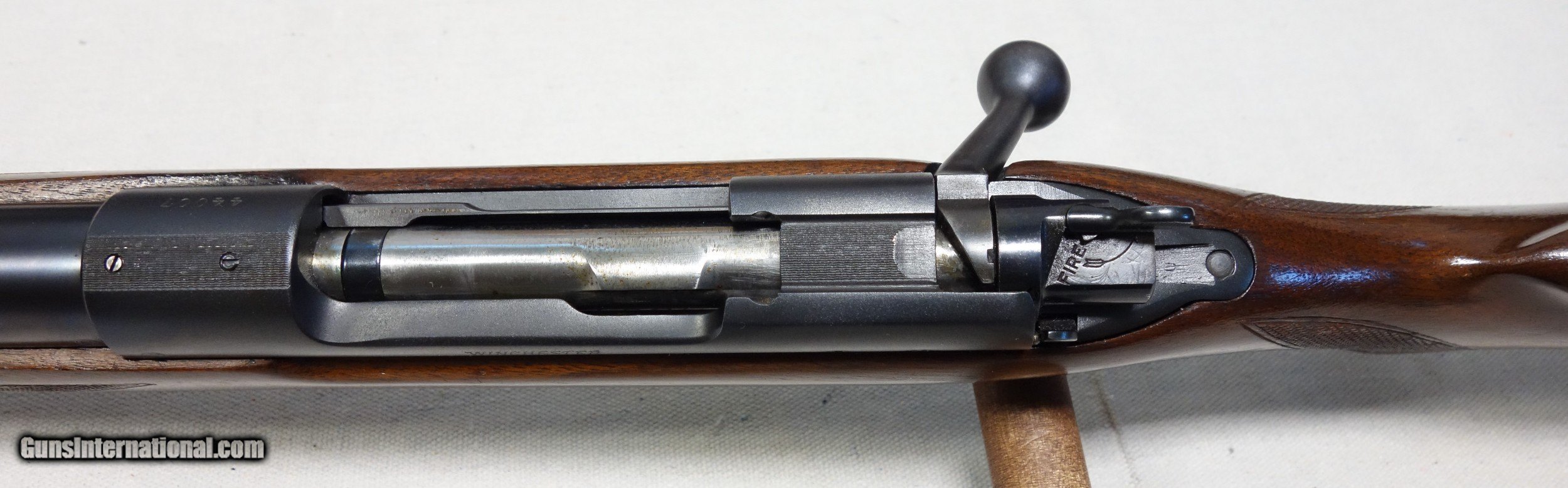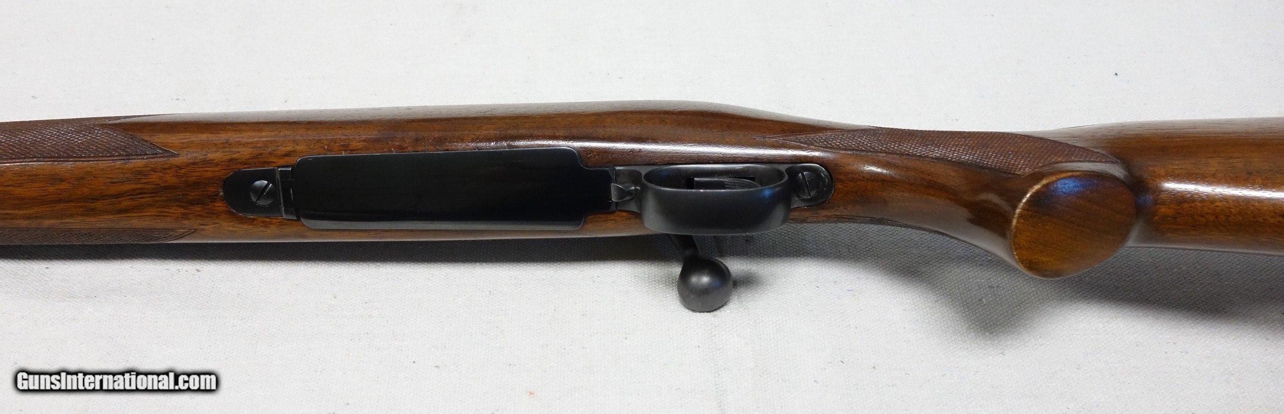 Description: Outstanding untouched and undrilled Pre War standard rifle in very scarce 22 Hornet caliber. This rifle remains in remarkably high condition considering its 80 years of circulation! S/N 44*** with matching scribed bolt made in 1942. 97%+ Blue and Varnish with only scattered light handling marks and a small chip at toe.. The 24" barrel has an excellent bore and the mechanical fuction is smooth and proper in all regards. I have personally verified that the chamber remains a true 22 Hornet and has never been reamed out to K hornet or any other such travesty. Correct H stamped floor plate. An excellent and highly collectible rifle. Expedited and fully insured shipping from Alaska to your FFL in a custom cut foam lined box for maximum protection is $75. SOLD Curio/Relic: Yes |
