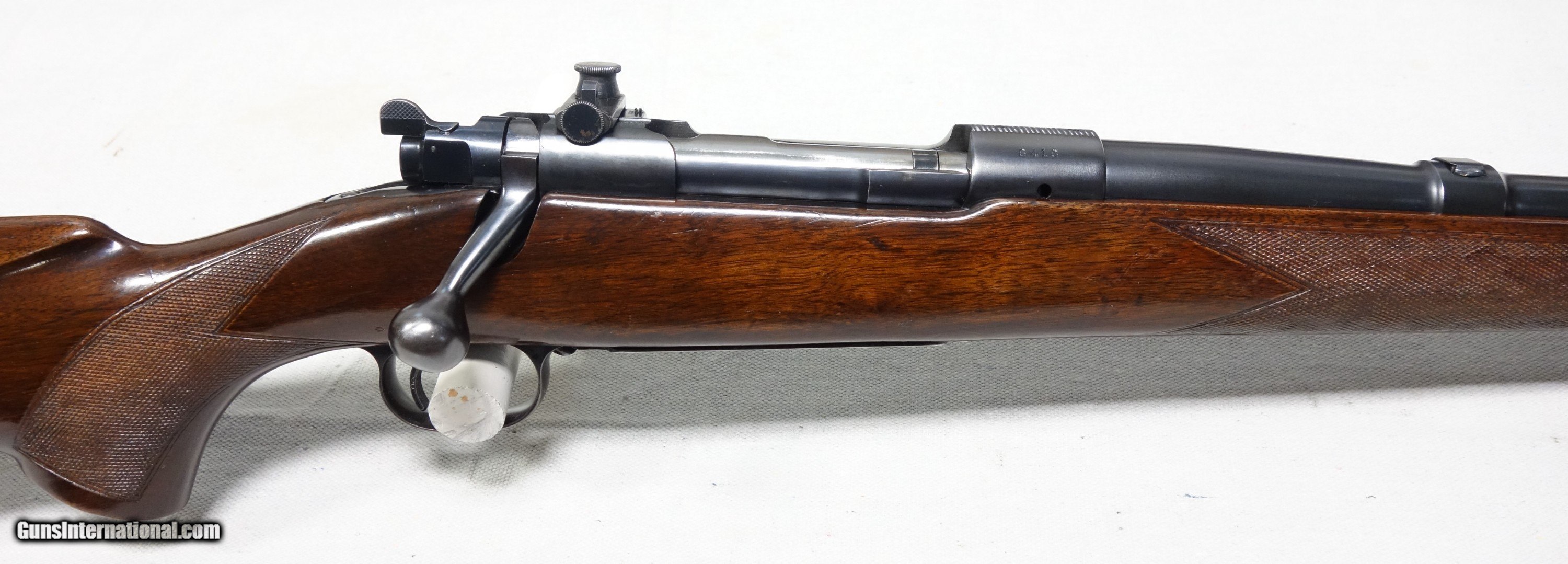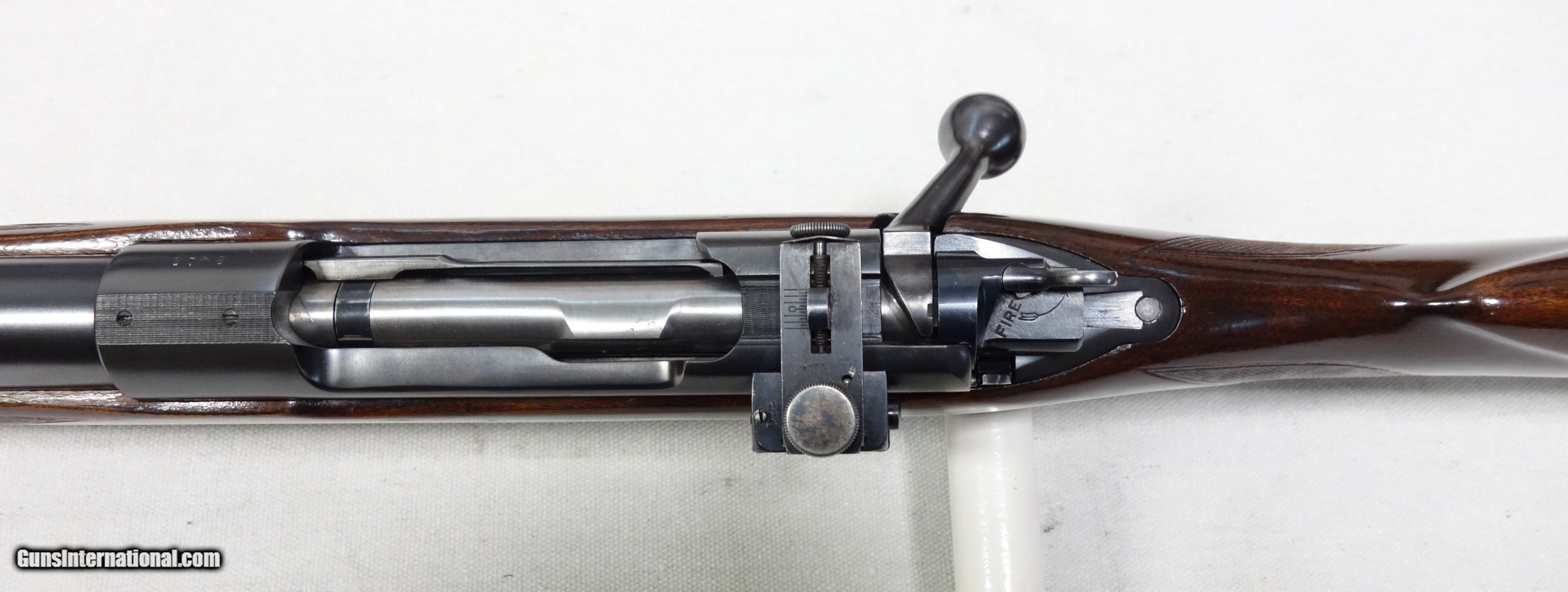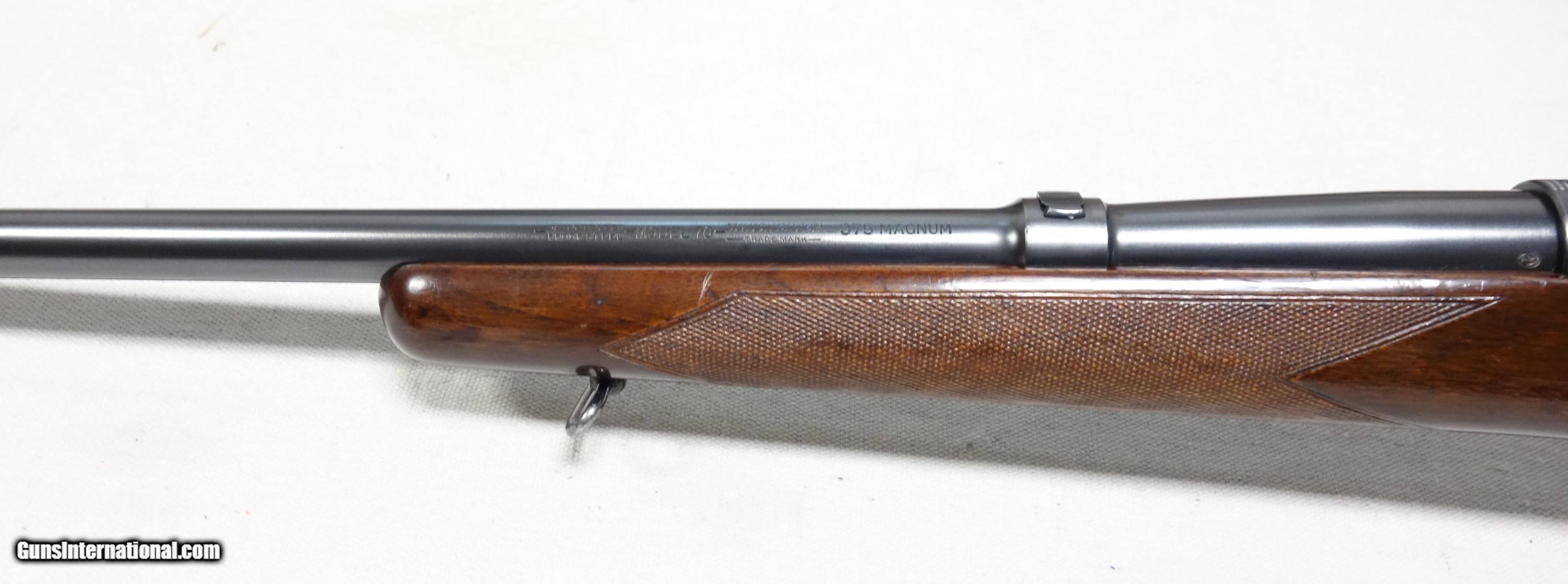 Description: EXTREMELY RARE Pre War Winchester Model 70 "Pencil Barrel" 375 H&H with 4 digit S/N 8418 sold in 1937. It has been stated in Roger Rule's superb reference book that fewer than ten .375s were ever made with this standard weight barrel. Dean Whitaker's book suggested that up to 100 may have been assembled onto actions. My extensive experience with this model over many years would tend to have me leaning more toward Mr. Rule's estimate! Whatever the number, it is at least among the very rarest possible Model 70s cataloged, if not the rarest. Nearly all subsequent 375s sold after these first few in 1937 had much heavier barrels. The metal condition on this rifle is superb given its age, showing about 97% original blue throughout. The rear receiver bridge is undrilled. The wood shows numerous light handling marks, but nothing distracting and no cracks inside or out. I think 95% would be a fair estimate of wood finish. The standard weight barrel channel is free of any alteration and the stock wears an original and still soft factory recoil pad as issued on all 375s. The rear sight provision is the early and rare Lyman 57W receiver sight which was a factory option at the time. This sight was designed to clear the wood completely so there is none of the usual damage underneath it from the base or elevation screw. It is apparent that there has never been a 22g rear sight installed as evidenced by the lack of any elevator track whatsoever on top of the barrel. The barrel's rear sight dovetail has a factory correct Lyman 12S filler blank, although this one is of somewhat later production with the rounded and more streamlined edges. The barrel is 24" with an excellent bore. All mechanical functions are silky smooth and working correctly. A very special and conservatively priced rifle for the advanced collector. Please add $100 for expedited and fully insured shipping from Alaska to your receiving FFL dealer. SOLD Curio/Relic: Yes |