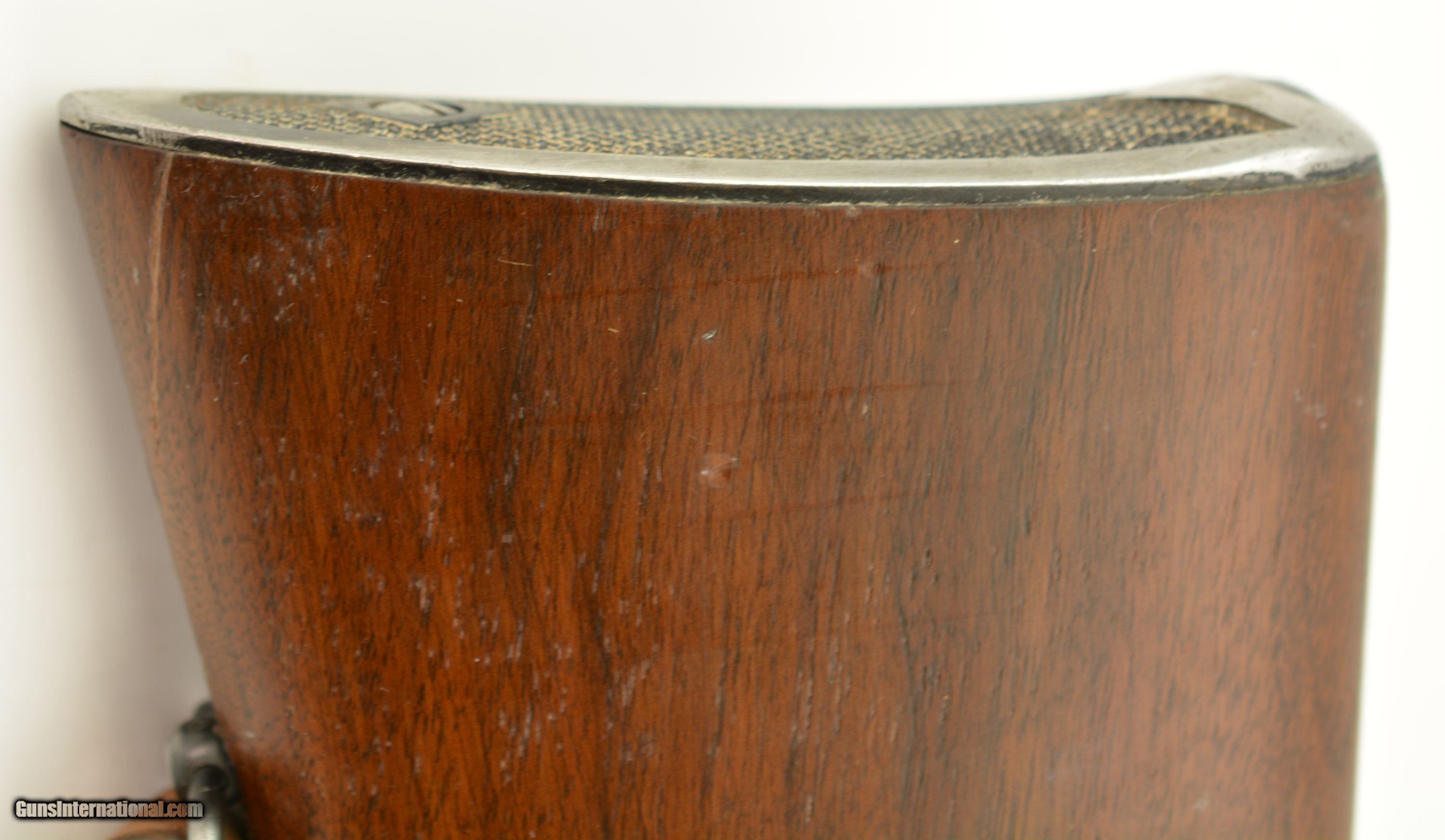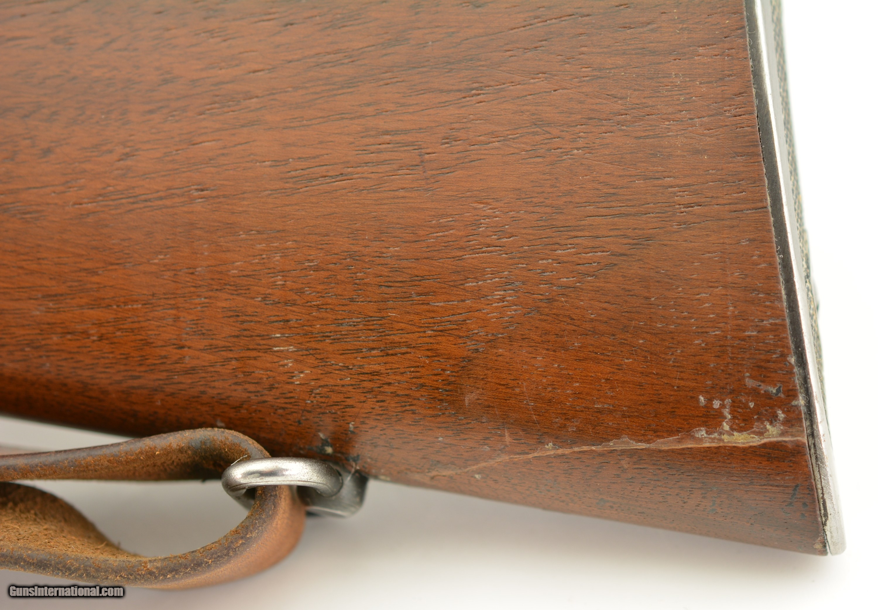 Description: Serial #30990, .30-06, 24" barrel with an excellent, bright bore. This is a 1940-made rifle that retains 80-85% of the original blue finish that has silvered at the muzzle, along the exposed edges, and on the bearing surfaces and handle of the bolt. Some further fading is present on the trigger guard, as well as some minor scratches at the nose of the floorplate. The front sight and hood are still in place, a blank has been installed in the rear sight dovetail, and a period Zeiss Zielvier 4x scope with post and line reticle has been installed on Tilden two-piece mounts. The checkered walnut stock is in very good shape with light-moderate wear, some flattening of the points, and a repaired chip at the toe of the butt. Additionally, there is some residual rubber from a no longer present slip-on recoil pad just behind the pistol-grip, and the original metal buttplate is worn to mostly dull gray. The rifle is equipped with a period brown leather sling that is still supple, intact, and fully serviceable. This is a great looking Model 70, in an ideal mid-20th century hunting set-up, and is in fine used (but not abused) condition. FFL or C&R SOLD Manufacturer: Winchester Model: 70 Serial Number: 30990 Caliber Info: .30-06 Gauge Info: .30-06 |