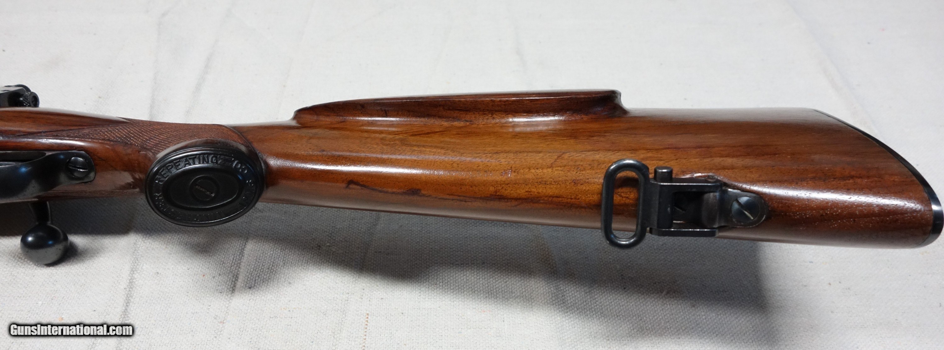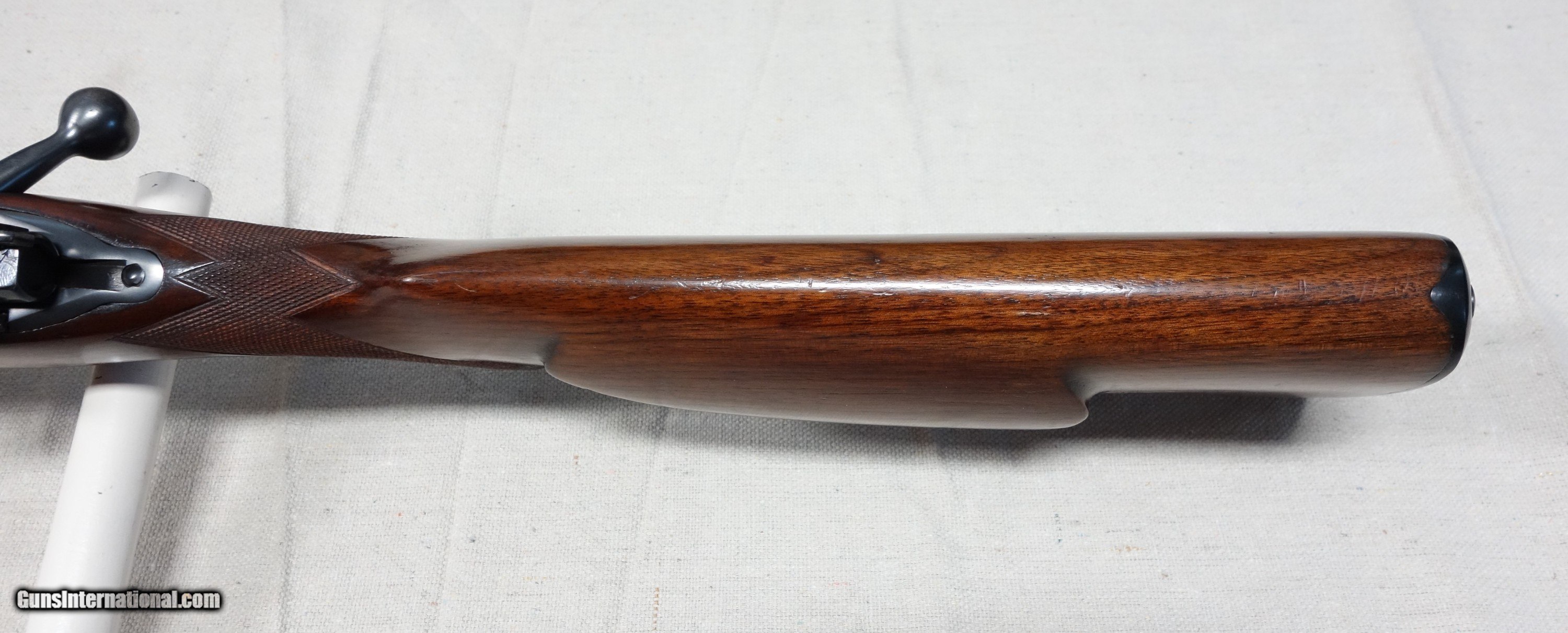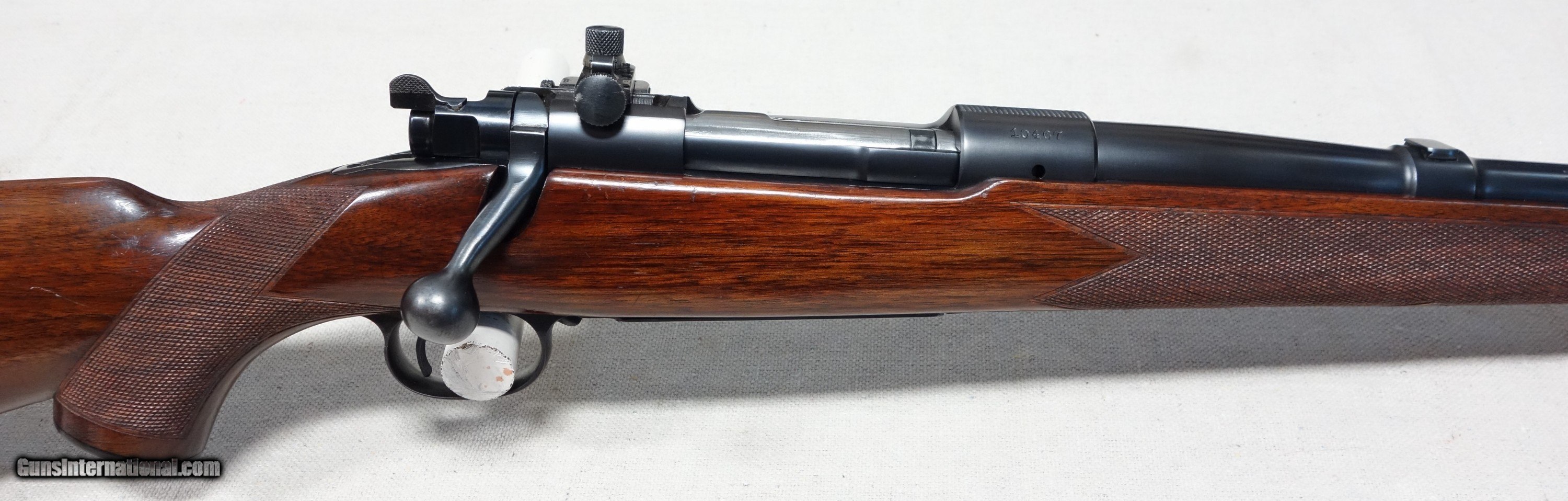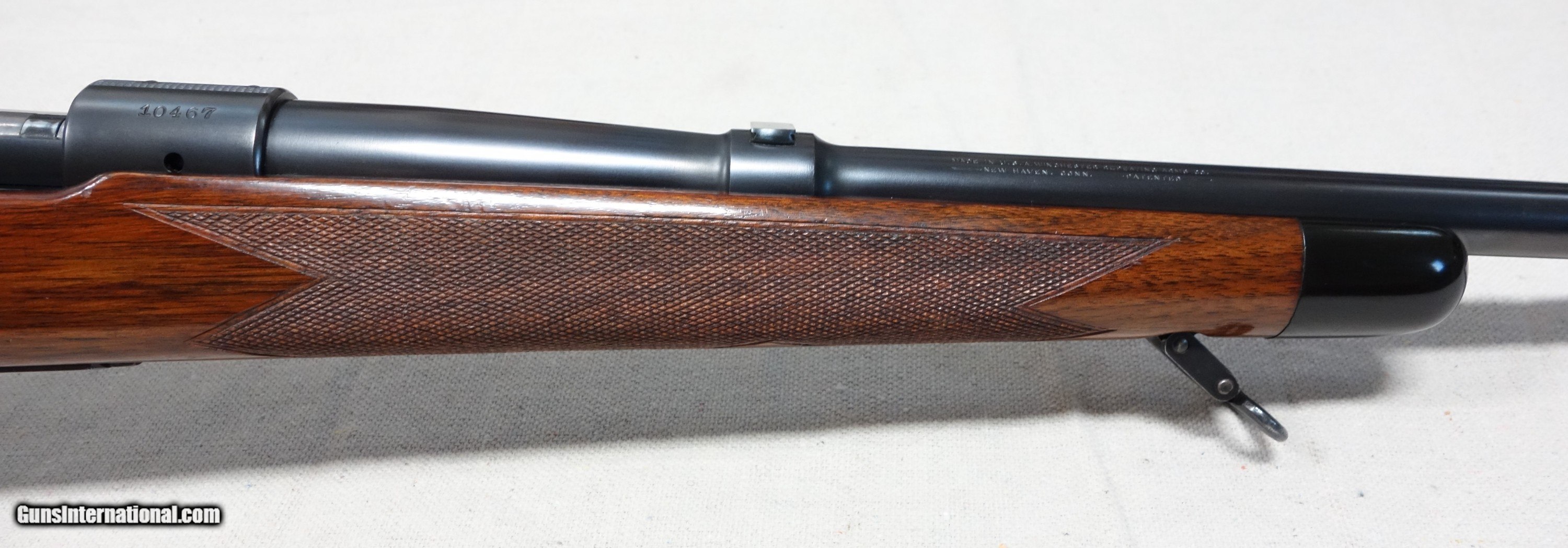 Description: ***SOLD*** Fantastic early S/N Pre War Model 70 Super Grade in 30-06 caliber. S/N 10467 with matching scribed bolt made in 1937. Superb condition throughout with lustrous original finishes showing 97-98% and only minimal handling marks. Incredible workmanship and details on these first guns with a gorgeous rust blued barrel and polished carbonum blued receiver, along with the beautiful deluxe stock. All special Super Grade appointments and small details are present, original and correct, including the issued Redfield front sight, and the uniquely profiled Pre War detachable swivels. The rear sight consists of the correct factory installed early Lyman 48 WJS with thimble knobs. All component #s are matching on this sight. There is also the proper Lyman 12S filler in the rear sight barrel dovetail. 24" barrel with minty bore and perfect, crisp mechanics as usual. Regarded by those who would know as the finest production sporting rifle ever conceived, this is precisely the rifle so often envisioned, and the one to which all others are compared. Surely among the very best of the few genuine examples you will ever see offered! Expedited and fully insured shipping from Alaska is an additional $100 SOLD Curio/Relic: Yes |