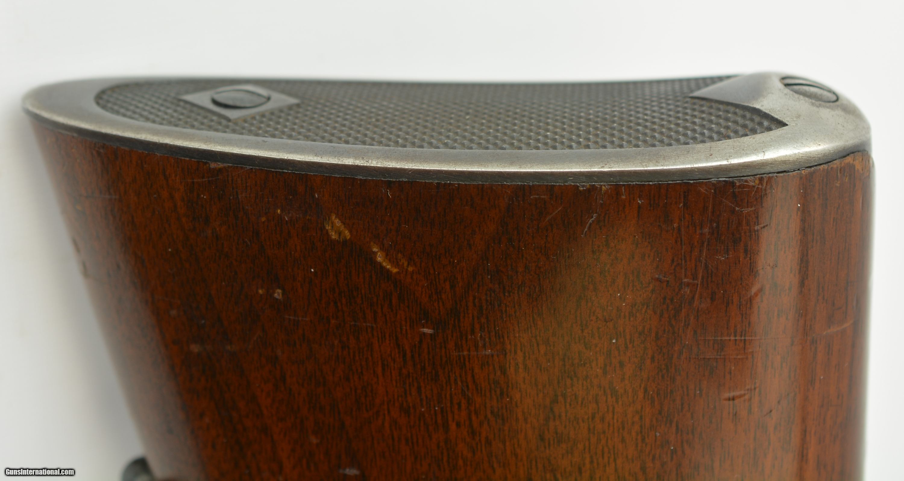 Description: Serial #70397, .257 Roberts, 24 inch barrel with an excellent, bright bore. This rifle was one of the 25,000 or so Model 70s manufactured between 1947-1948, incorporating a mix of pre and post-war features intended to make the Model 70 more amenable to telescopic sights. The metal retains 97-98% of the original blue finish, with some mild silvering and fading along some of the high and exposed edges, as well as on the bearing surfaces of the matching numbered bolt. This rifle has the Type II receiver with redesigned bridge adapted for scope mounts, and the early Type II safety and bolt with narrow safety tab and handle cut-out. The rifle retains its original front sight and hood, and also has a Unertl 10x sporting scope with clear optics and intact crosshair reticle installed (the forward scope block is mounted in place of the original rear sight). The walnut stock has scattered minor handling marks and small surface blemishes marring the original varnish, and the checkering points are still quite sharp with little flattening evident. According to Roger Rule, these Type II rifles were only made for about a year (between serial numbers 60500 - approx. 87700) before Winchester switched to the simplified Type III action that would remain in use until 1964. This is an un-messed with example of a top-tier post-war American hunting rifle, is in excellent condition, with a fantastic Unertl sporting scope, and is chambered in a highly desirable cartridge. It would make a splendid addition to any collection. FFL or C&R SOLD Curio/Relic: Yes Manufacturer: Winchester Model: 70 Caliber Info: .257 Roberts Gauge Info: .257 Roberts |