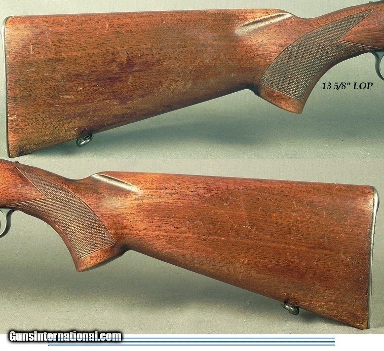 Description: #112229, Winchester Model 70 Pre-64 in 30-06 Made in 1949, 24" barrel, No rear sight with a blank in the dovetail, Early style machined integral front ramp, Factory front sight hood, Standard 3 position safety, Standard Model 70 hinged floorplate, Straight comb stock without a monte carlo comb, Standard point pattern checkering, Sling eyes & swivels, 13 5/8" LOP over the factory checkered steel buttplate, 8 lbs. 2 oz., All the metal very nicely reblued, All metal now 99%, The original wood finish at 80%, The checkering is 80%, The bore is absolutely excellent. It is missing the forward barrel tiedown screw. This is a very honest using Model 70 that is ready to go hunting. SOLD Curio/Relic: Yes Rifle Caliber: .30-06 Springfield |