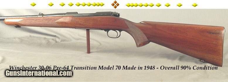 WINCHESTER 30-06 MODEL 70 PRE-64- TRANSITION MODEL MADE in 1948- OVERALL 90% COND.- THE BORE EXC. PLUS- BOLT HANDLE SLIGHTLY ALTERED
