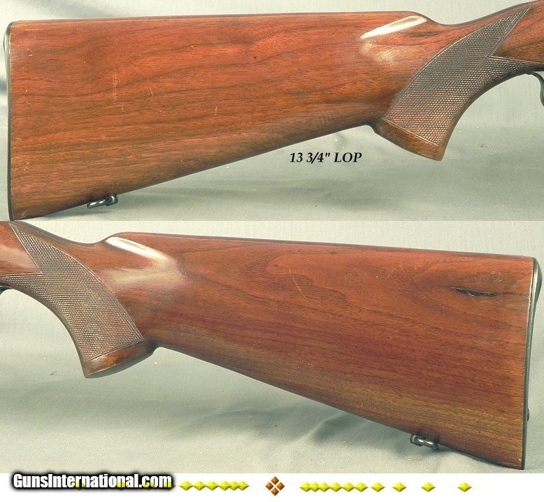 Description: #79076, Winchester Model 70 Pre-64 in 30-06 Made in 1948, Transition Model, Original piece except the bolt handle shank was filed to accommodate a low mounted scope, 24" barrel, Folding rear sight, Early style machined integral front ramp, Factory front sight hood, Standard 3 position safety, Cloverleaf rear tang, Standard Model 70 hinged floorplate, Straight comb stock without a monte carlo comb, Standard point pattern checkering, Sling eyes & swivels, 13 3/4" LOP over the factory checkered steel buttplate, 8 lbs. 4 oz., The original barrel blue is 97%, The receiver blue is 97%, The floorplate & trigger guard is 88%, The buttplate has 92% blue, The original wood finish at 90%, The checkering is 97%, The bore is absolutely excellent plus. This 72-year-old gun is a very nice example of a very honest Model 70 that was not shot much and certainly not abused. This gun and several other Model 70's came out of a collection that extends decades. SOLD Curio/Relic: Yes |