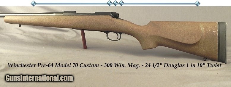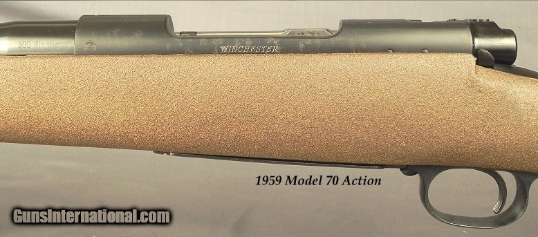 Description: #441106, Winchester 300 Win. Mag. Pre-64 Model 70 Barreled Action Custom Bolt Rifle, The action made by Winchester in 1959, 24 1/2" Douglas 1 in 10" twist barrel, 2 1/2" Best of the West Muzzle Brake, No open sights, Standard 3 position safety, Model 70 trigger, Standard Model 70 hinged floorplate, Allen guard screws replaced, High Tech Fiberglass stock; The barrel channel, recoil lug, rear tang and the bottom metal are glass bedded, Sling eyes on the stock, 13 1/2" LOP over a 1" Decelerator pad, 6 lbs. 15 oz. as is, The bore is as new, It has a slightly extended throat to seat bullets out, The magazine was slightly extended as well, The metal reblued and now remains at 99%. SOLD Rifle Caliber: .300 Winchester Magnum |