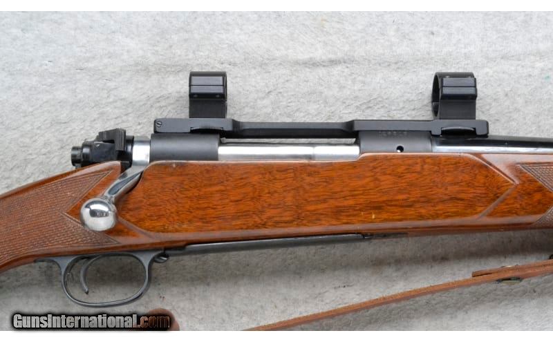 Description: This Winchester Model 70 is a right hand bolt action rifle in .270 WCF Cal. It has a 21 inch barrel. A raised blade front sight. It has scope rings attached. The butt stock is a checkered grip walnut pistol grip with a raised cheekpiece and black cap. The forearm is a checkered grip walnut with a black tip. S/N 126518 (1949). .270 Winchester SOLD Chambers: Internal magazine with a hinged floorplate. Metal Condition: Very Good. A little very minor freckling. Wood Condition: Very Good. Some light handling marks. Bore Condition: Excellent. Barrels: 21 inch. Stock Dimensions: LOP 12 3/4 inches. Fore End: Checkered grip walnut with a black tip. Butt Pad: Pachmayr red rubber recoil pad. Weight: 8 lb. 8 Oz. Sights: Raised blade front. Scope rings are attached. Item Location: Richfield, WI |