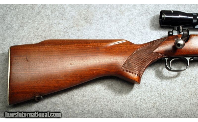Description: This Winchester Model 70 is a right-hand bolt action rifle in .243 Win. Cal. It has a 22" barrel. A hooded front blade sight and an adjustable notch middle sight. It is outfitted with a Tasco 4X32 Scope. The butt stock is a checkered grip walnut pistol grip. The forearm is a checkered grip walnut. Manufactured in 1957. .243 Winchester SOLD Curio/Relic: Yes Metal Condition: "Very good, handling marks and bluing wear. Wood Condition: "Very good, some dings/dents Bore Condition: "Very good, bright and shiny Barrels: 22 inches Butt Pad: Metal Weight: 8 lbs 9 oz Sights: Tasco 4X32 Item Location: Scarborough, ME |