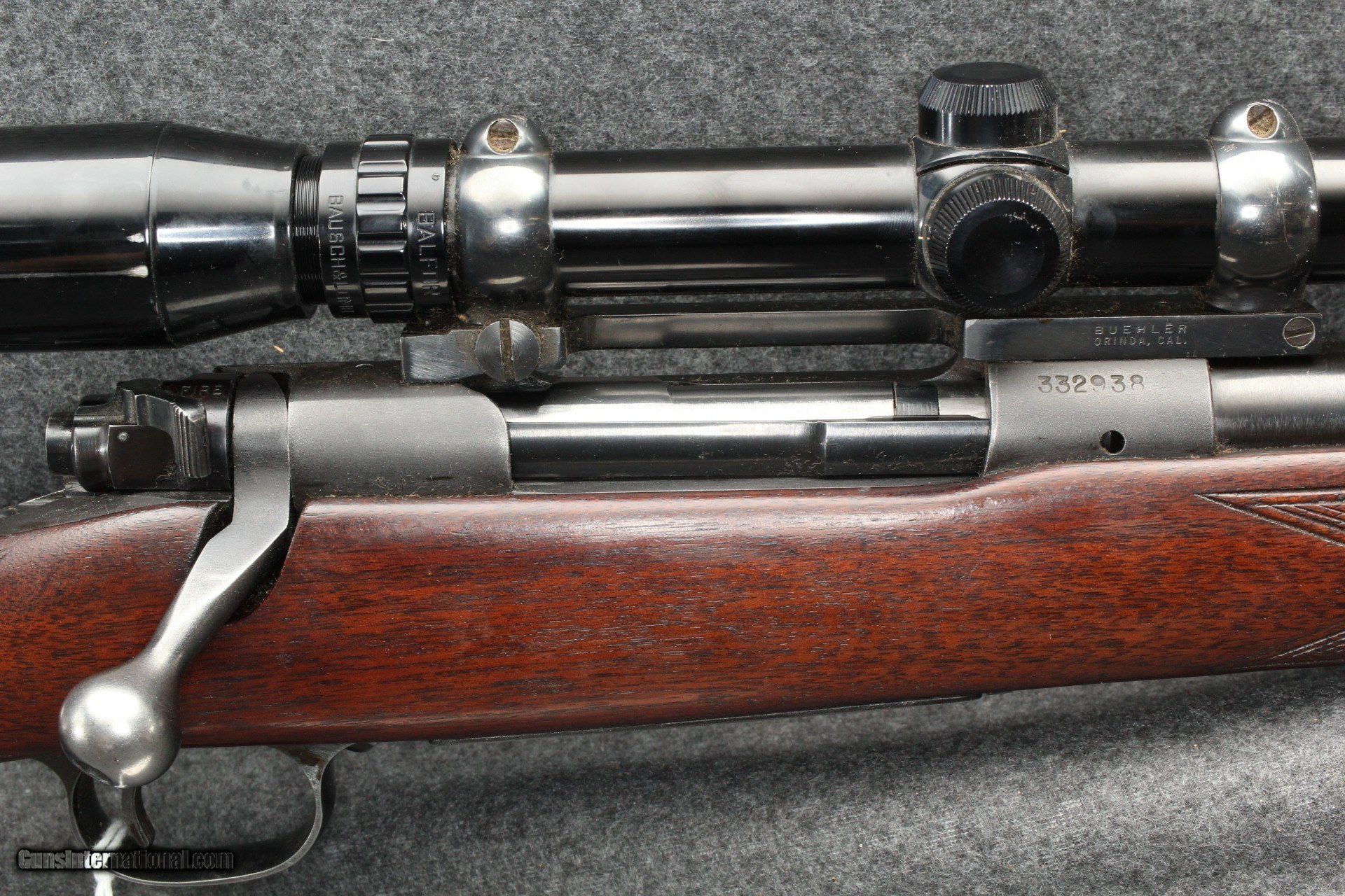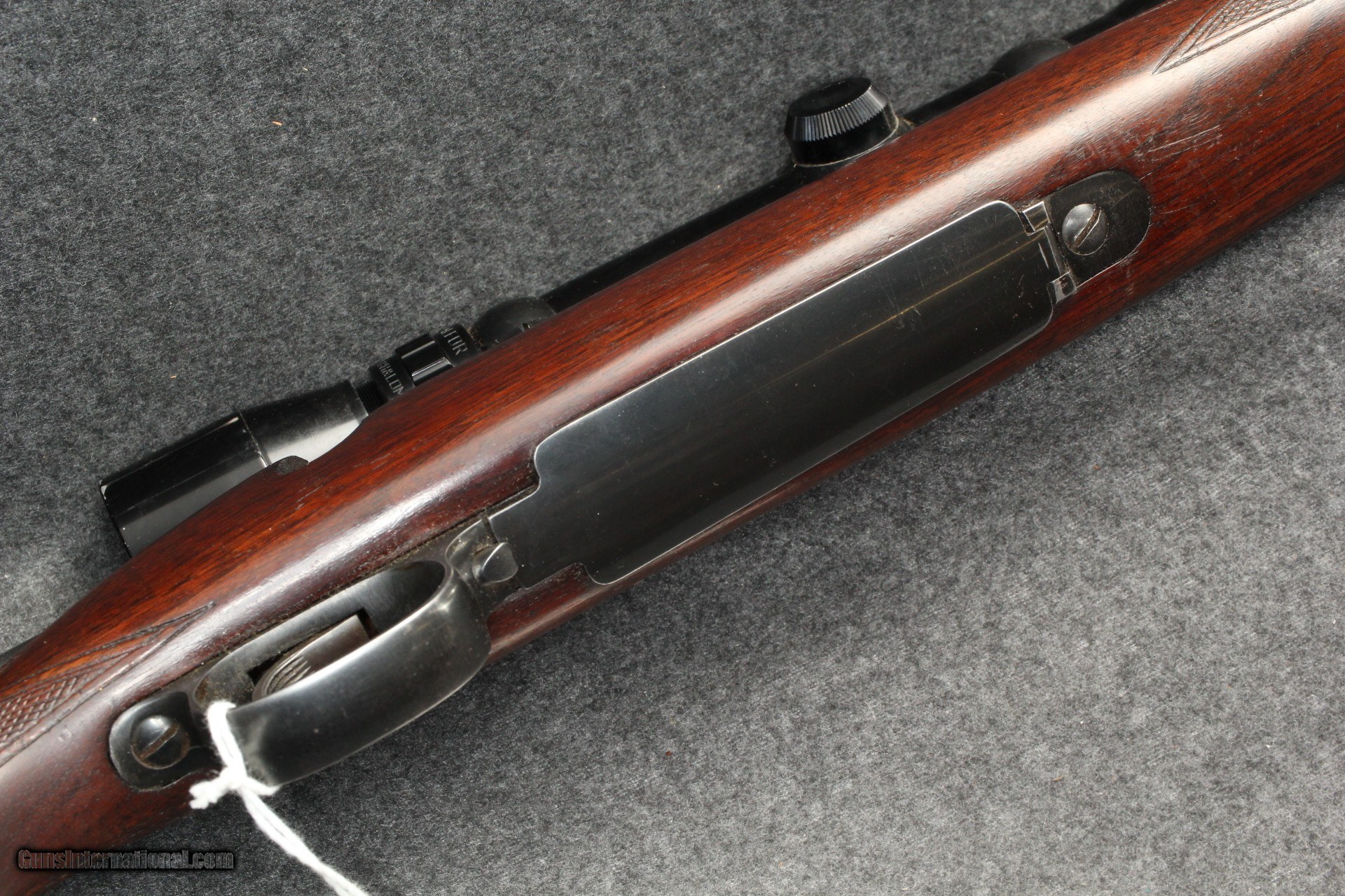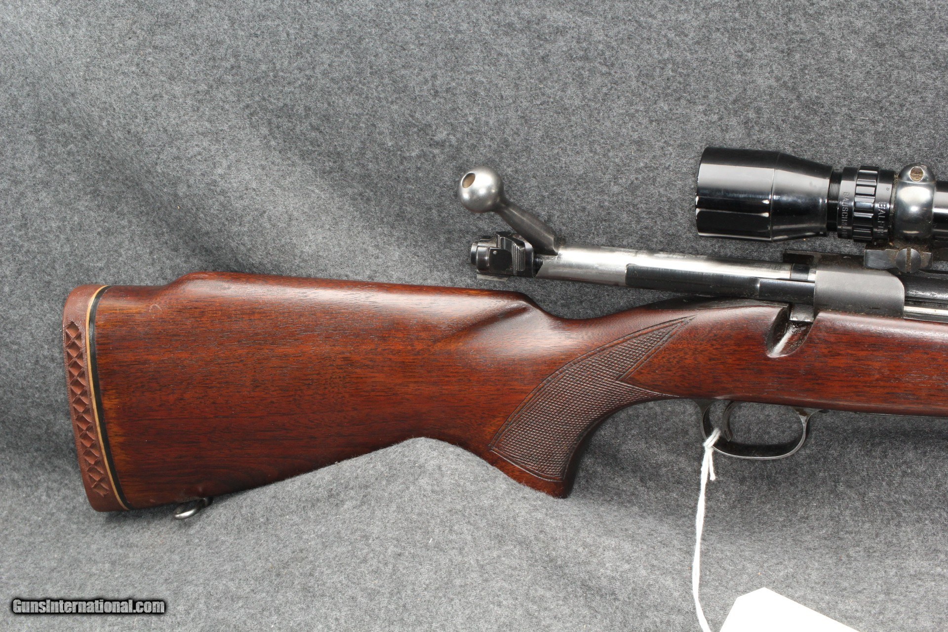 Description: Serial number 332XXX. Rechambered to 300 Weatherby from H&H (barrel is still marked 300 H&H). Mfg 1955. 26" barrel. Stock cut and recoil pad added. LOP to wood 12 5/8", LOP overall 13 5/8". Overall in good condition, shows normal wear. Wood has had finish added, shows hunting wear, no cracks or large marrs. Original sling swivels. Metal retains 85% original blue with stock finish overrun on receiver. 2 holes in rear bridge. Throat is good, bore is excellent. Comes with Bausch & Lomb Balfor scope. Lenses are clear, no function guarantees on scope. More photos on request. Willship to C&R. Please add $65.00 for shipping and insurance. SOLD Curio/Relic: Yes Rifle Caliber: .300 Weatherby Magnum |