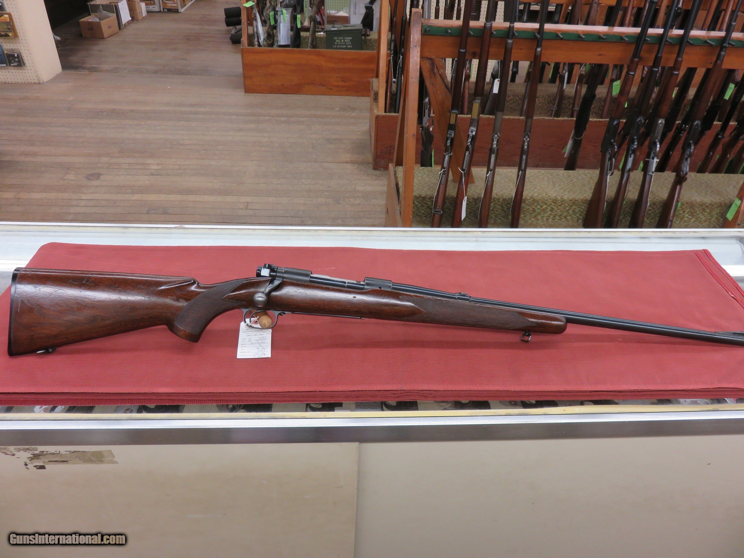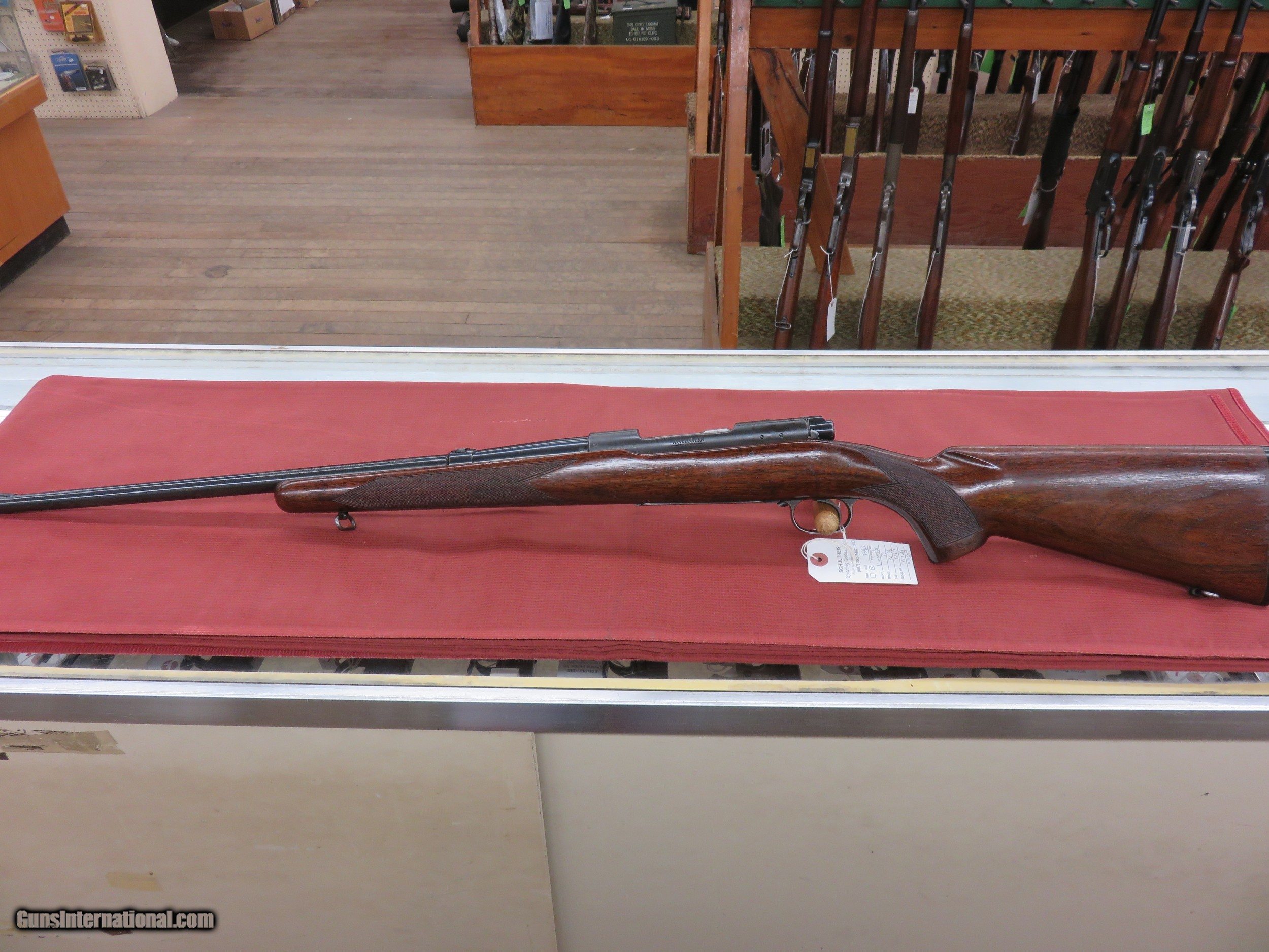Description: Winchester 70, pre-'64, 30-06, #64XXX, 1947 mfg., tranition gun with clover leaf tang and pre-war safety, excellent bore and action, the stock has been shortened 1/2" and fitted with a non-original buttplate, missing rear sight and front sight insert, 80% blue. SOLD Curio/Relic: Yes |
