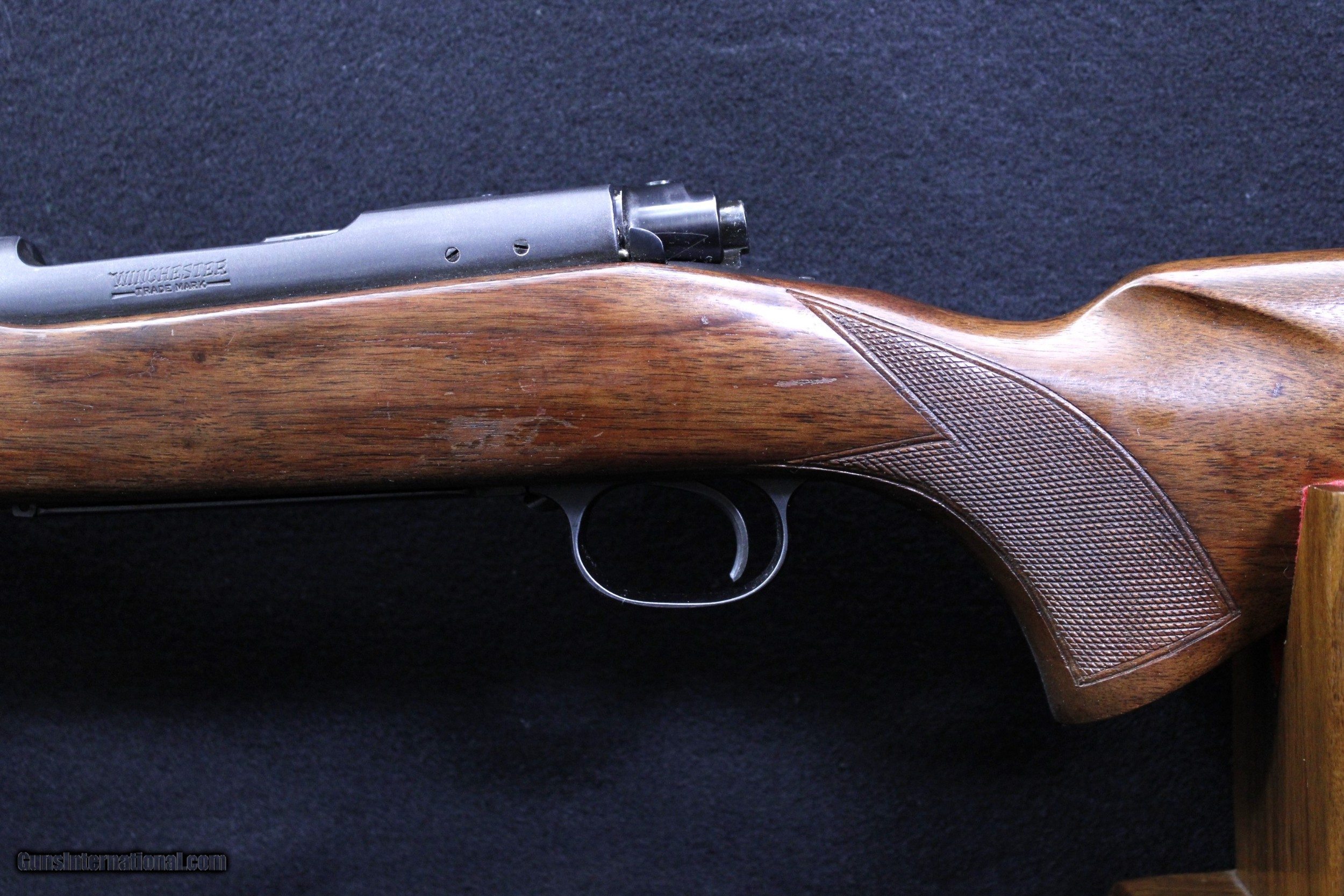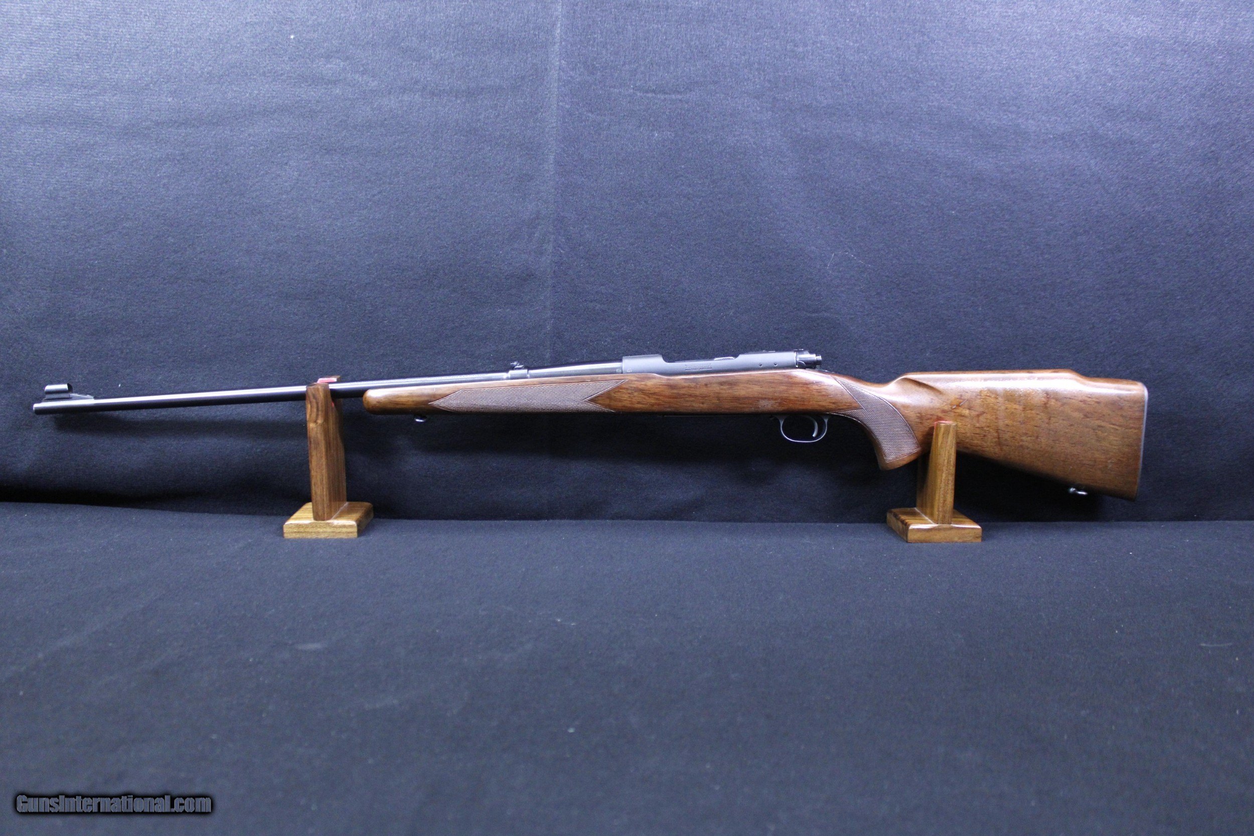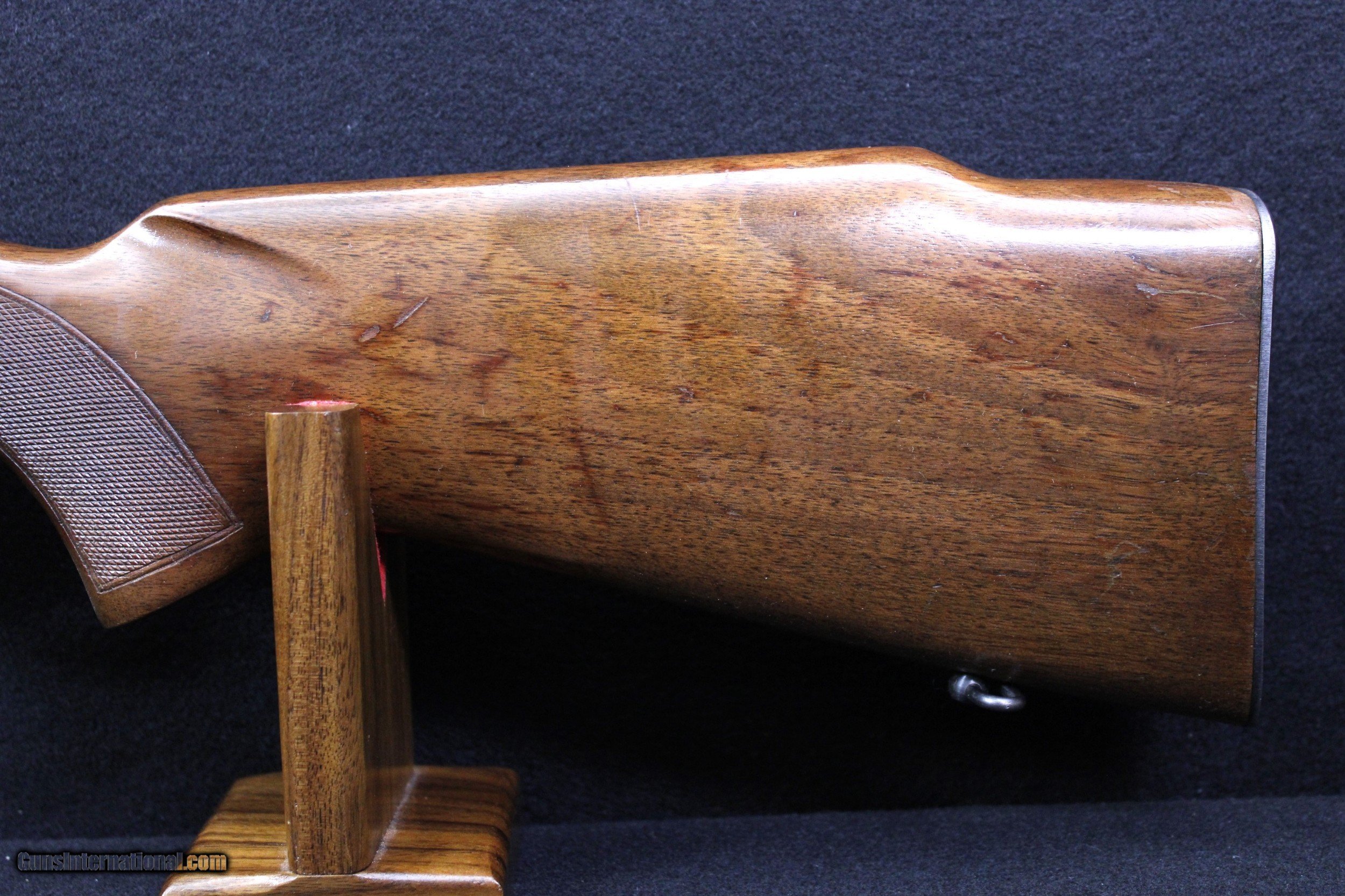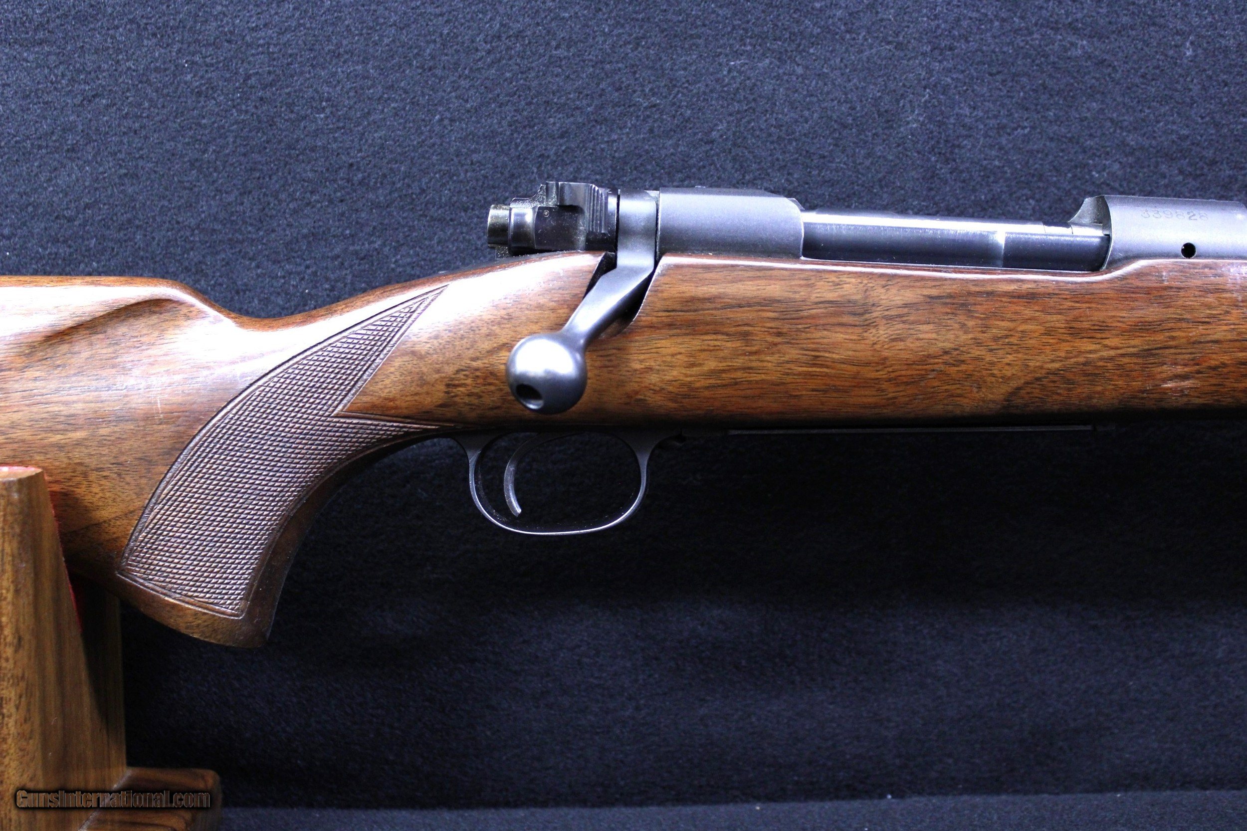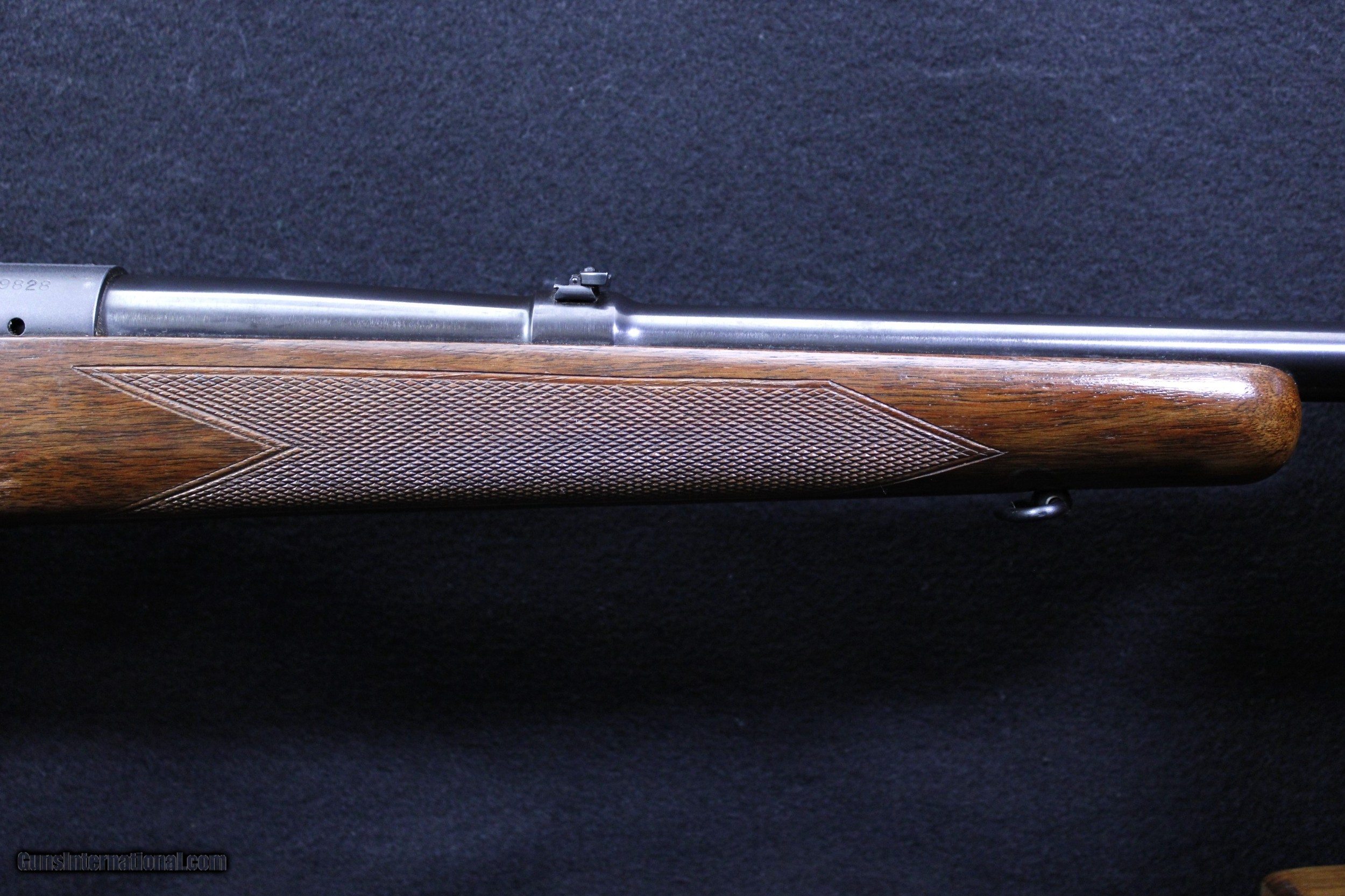 Description: Lovely Winchester Model 70 manufactured in 1955 chambered in .300 H&H. The wood stock shows various minor handling marks, no deep scratches or gouges and a small area of wear to the wood finish. Blued finish is 98% or better. Bore is bright and clear with well defined lands and grooves. Mechanically excellent. Dimensions are as follows: BBL. 26" WT. 7lb. 7oz. DIM. 13 1/2" L.O.P. On Sale!! Was $4495 Now $3599.95 SOLD |